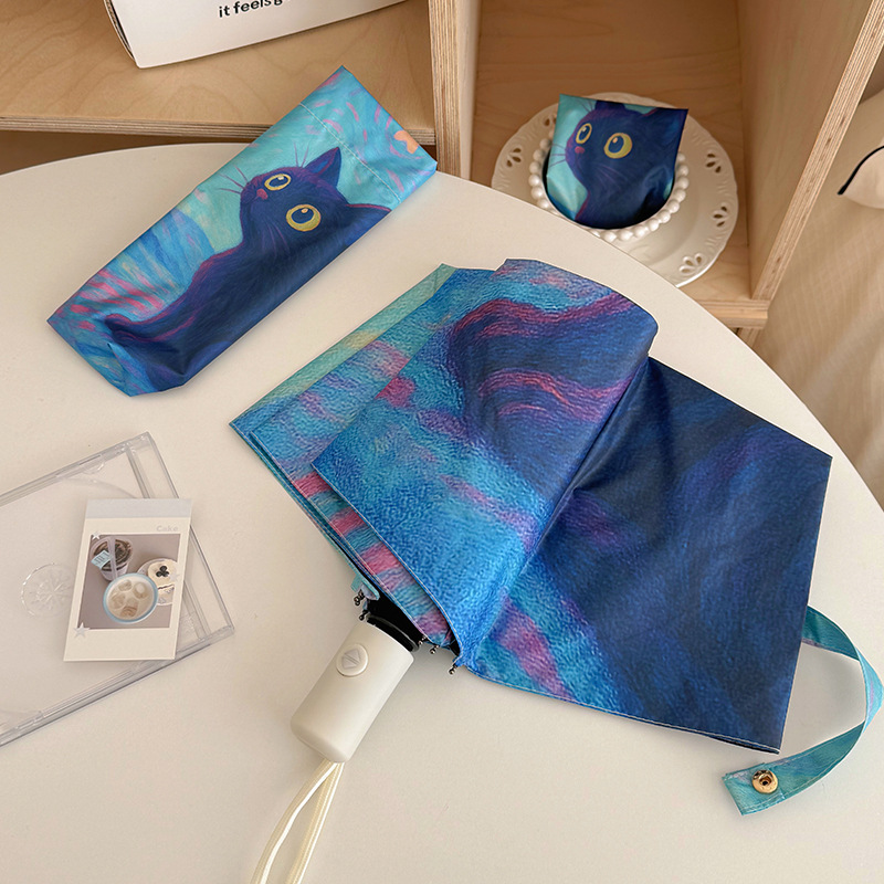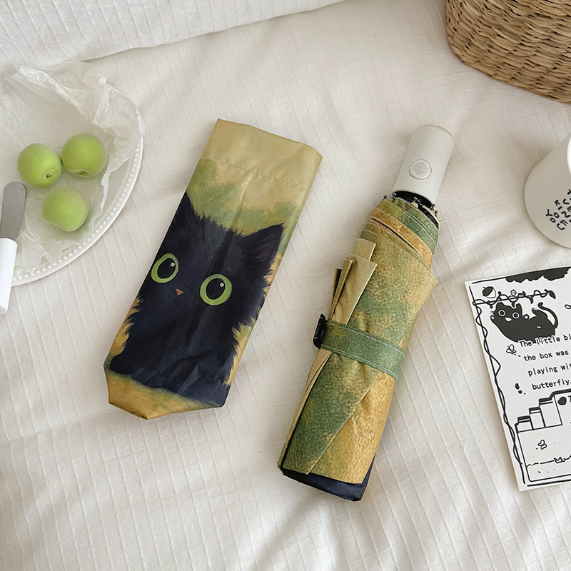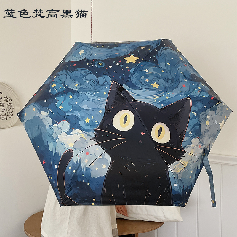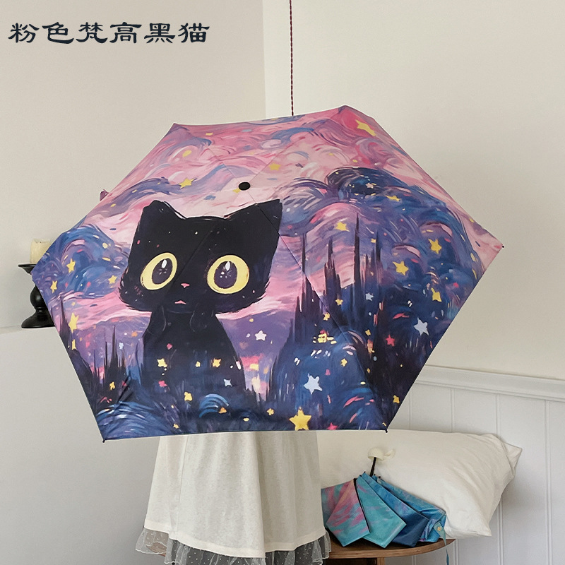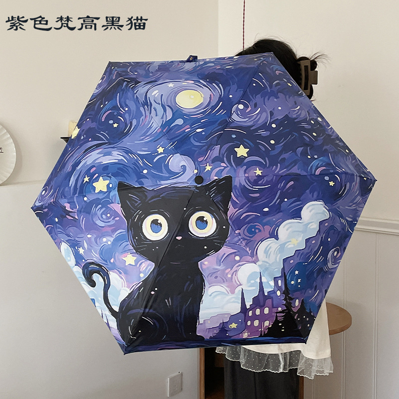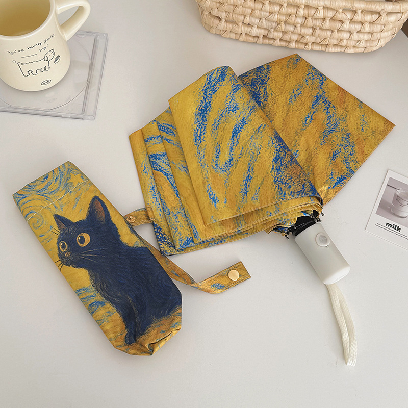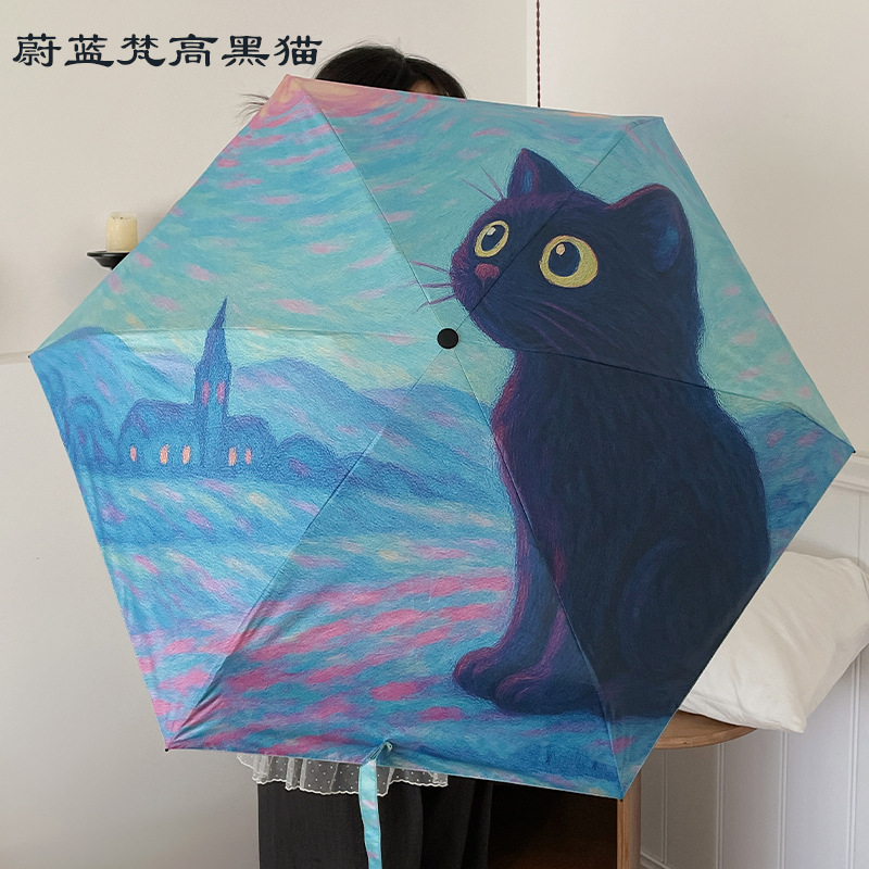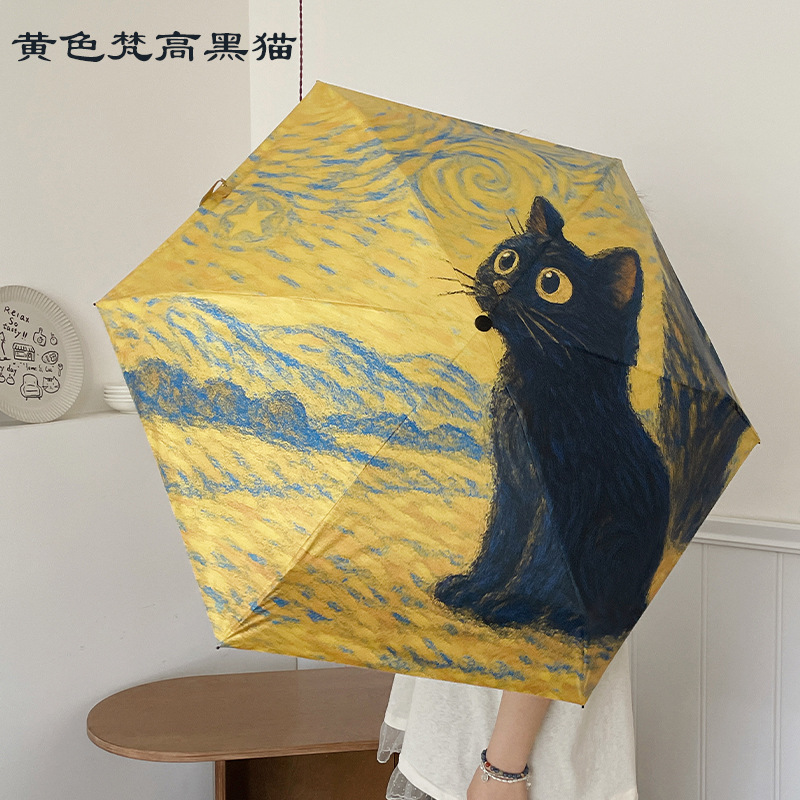 반 고흐 만화 고양이 비닐 접는 우산 전문 태양 보호 자외선 차단 우산 휴대용 미니 우산스토어 가기