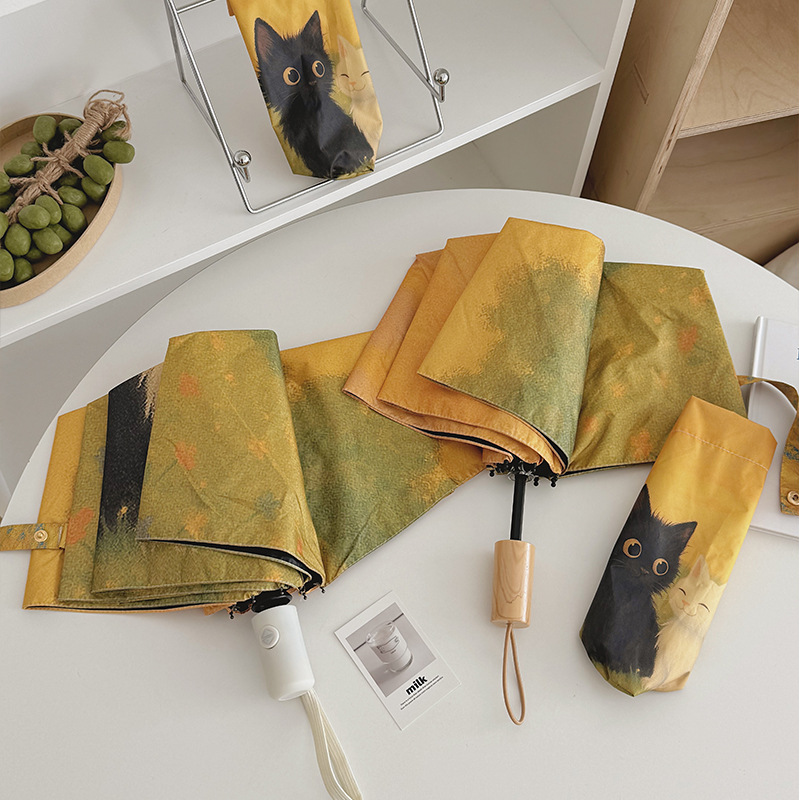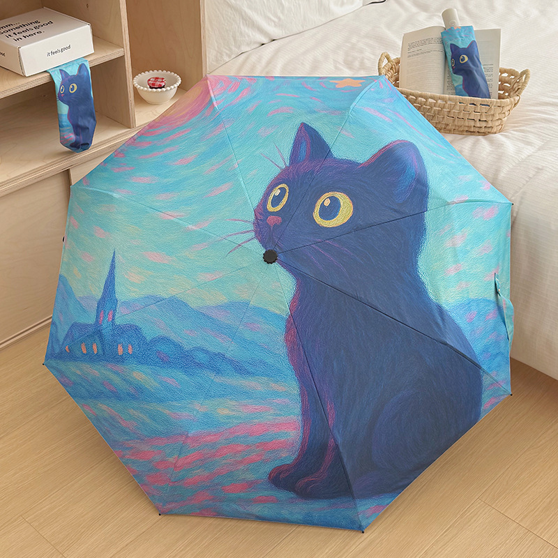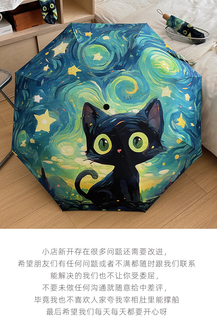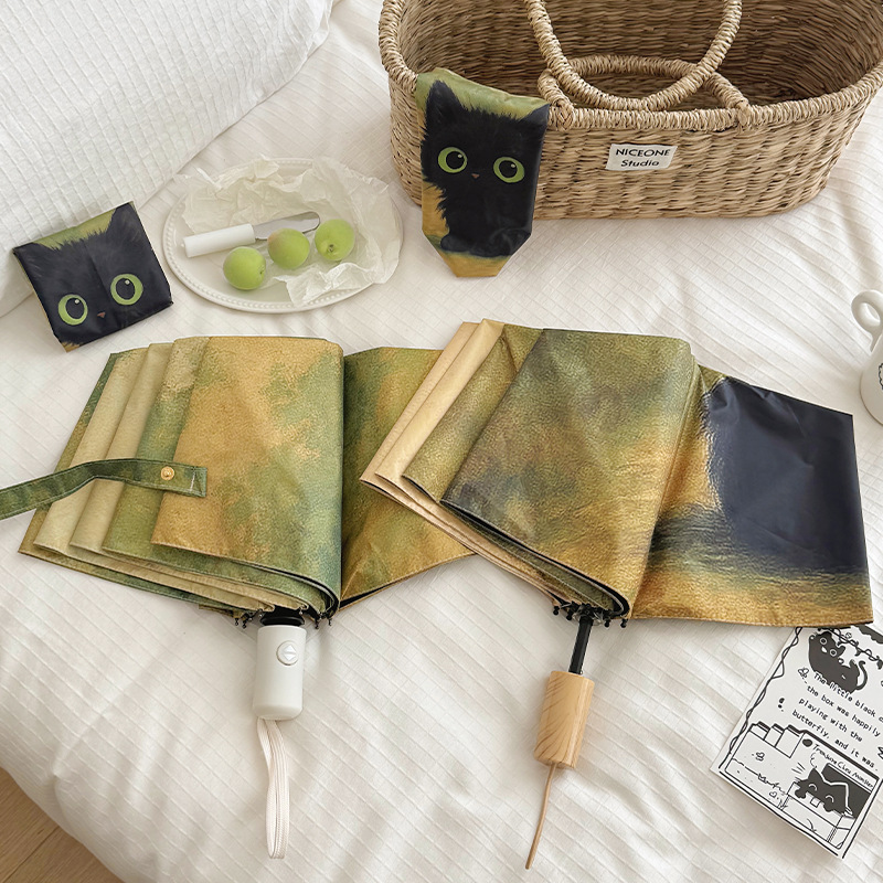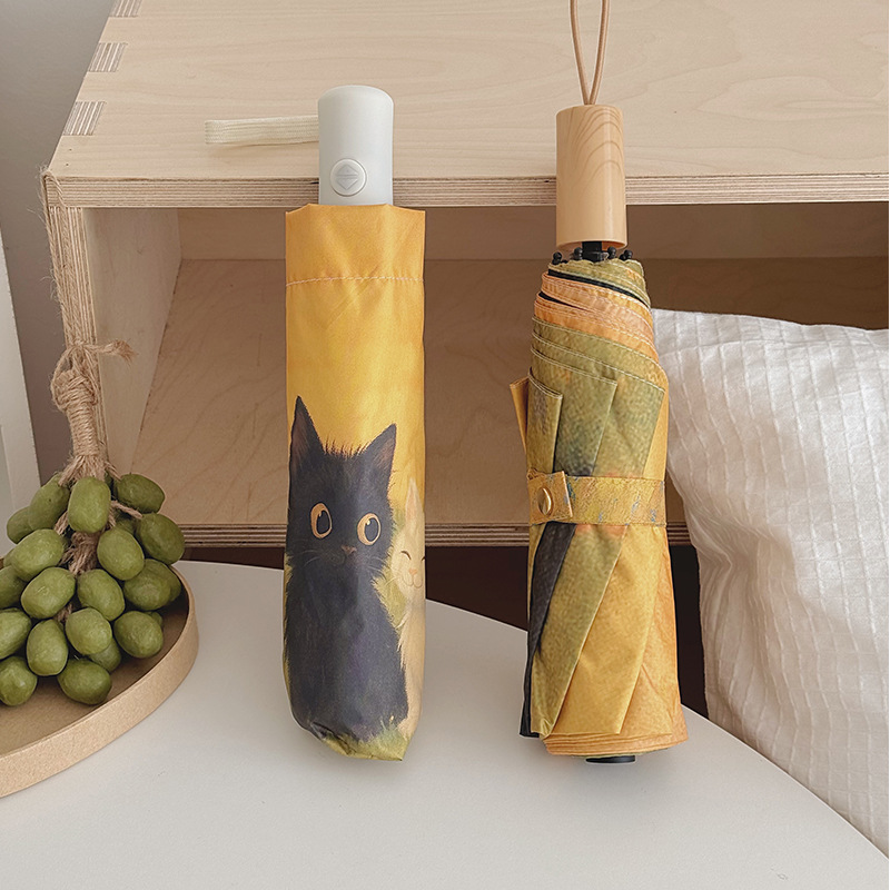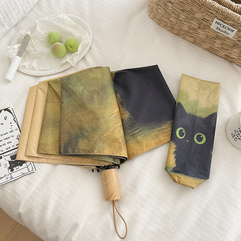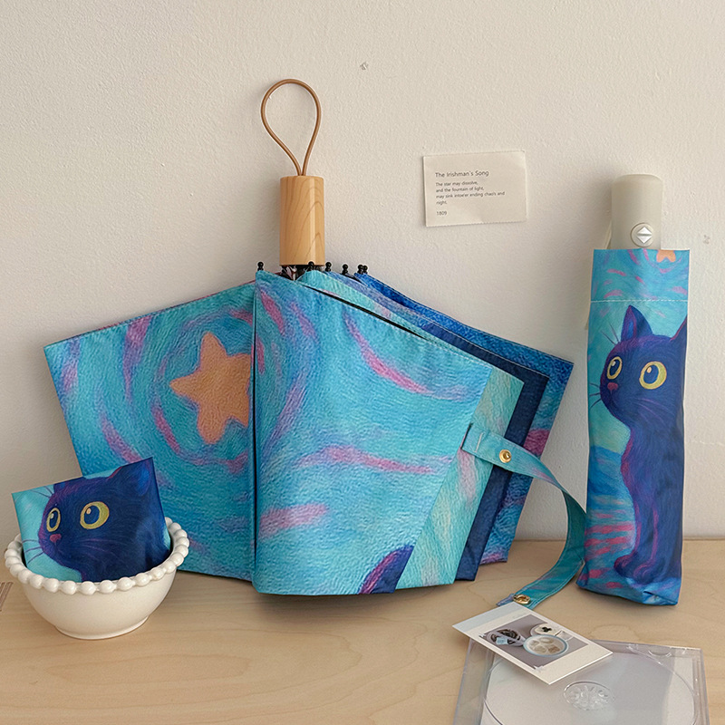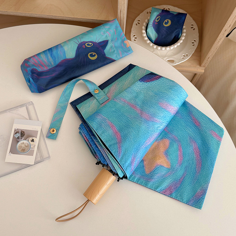 반 고흐 만화 고양이 비닐 접는 우산 전문 태양 보호 자외선 차단 우산 휴대용 미니 우산스토어 가기