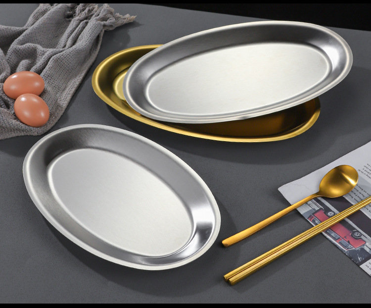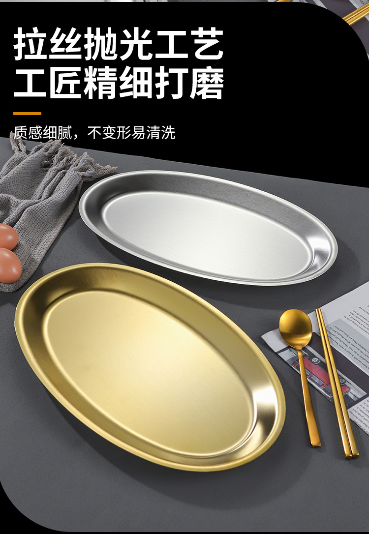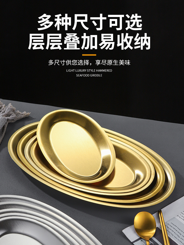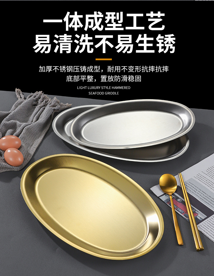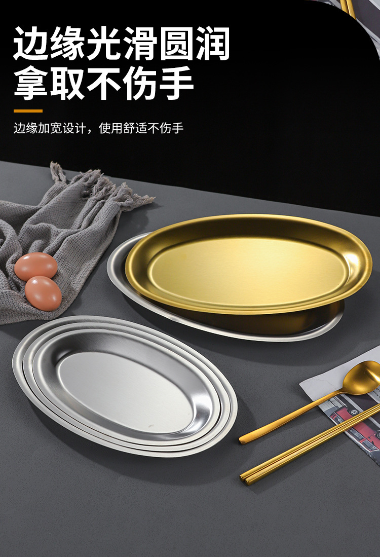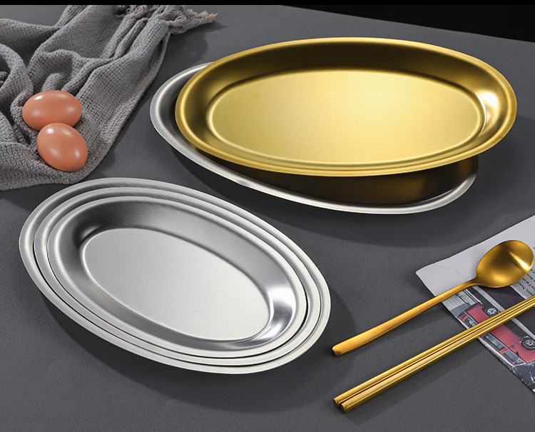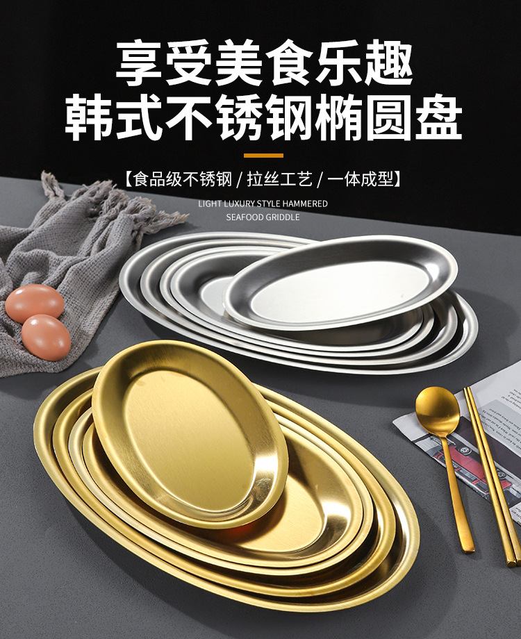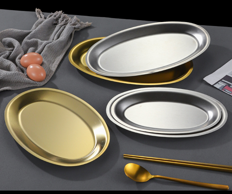 한국 상업용 바베큐 접시 스테인레스 스틸 계란 모양의 접시 황금 타원형 평면 트레이 대형 생선 찜 접시 접시스토어 가기