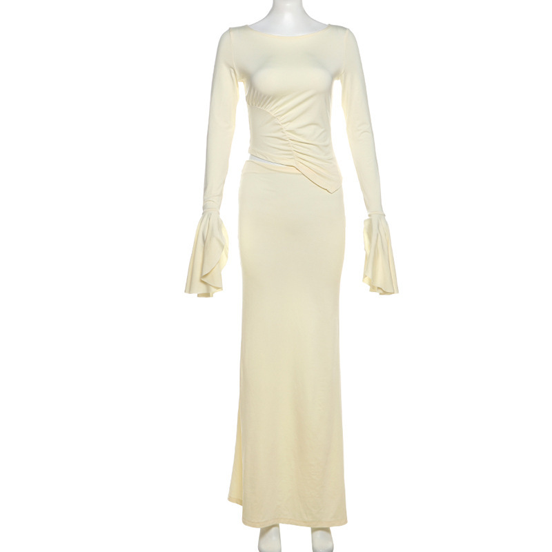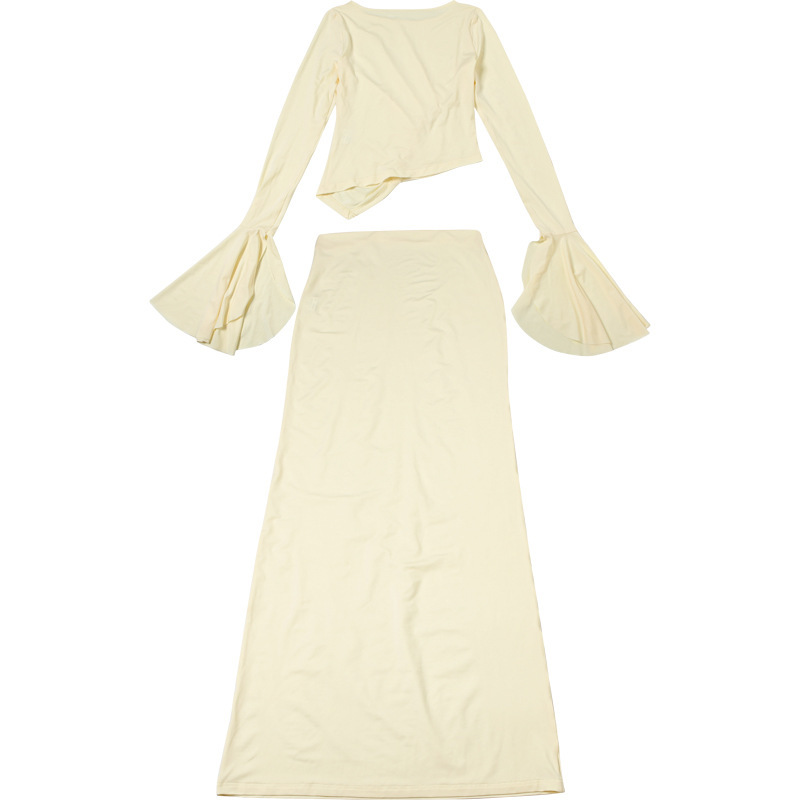 유럽과 미국의 2026년 봄 여름 신상 여성복, 우아한 슬림핏 불규칙 긴팔 티셔츠와 솔리드 컬러 힙허깅 스커트 세트스토어 가기