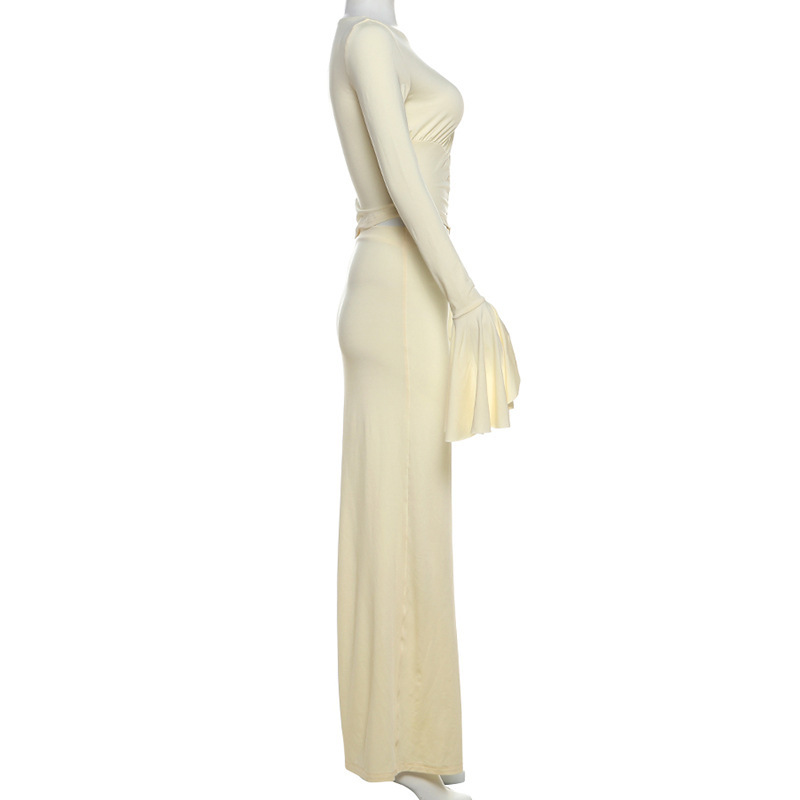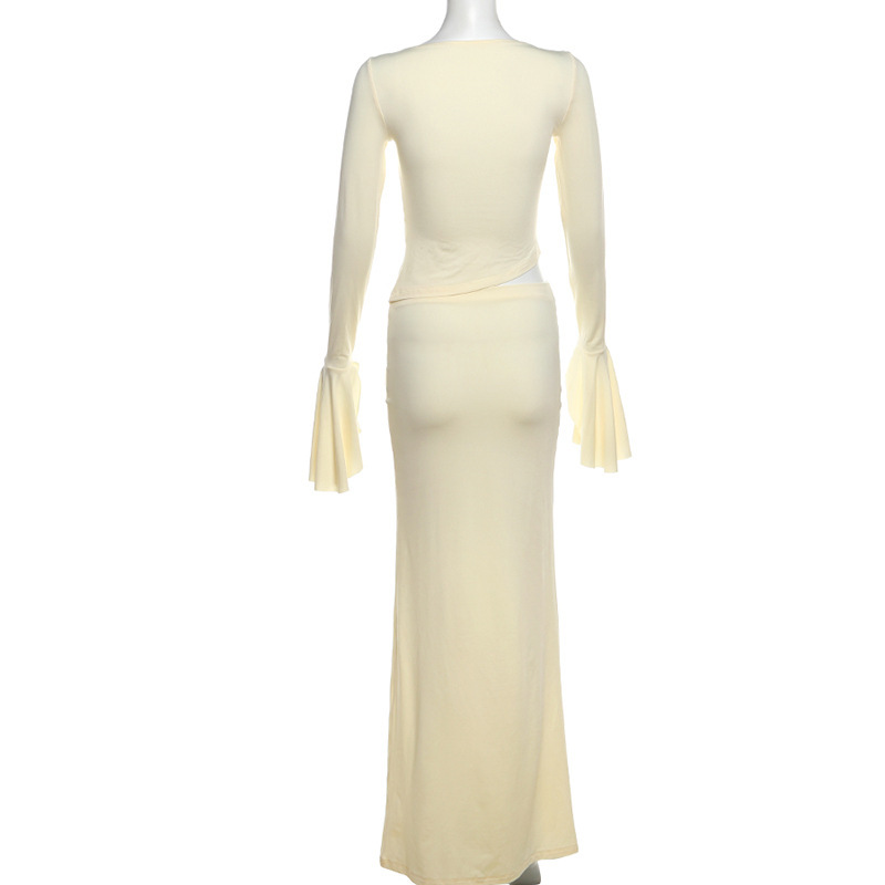 유럽과 미국의 2026년 봄 여름 신상 여성복, 우아한 슬림핏 불규칙 긴팔 티셔츠와 솔리드 컬러 힙허깅 스커트 세트