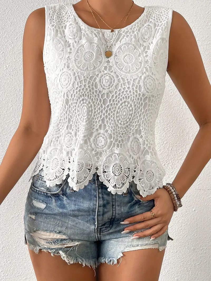 2025夏季新款欧美跨境时尚休闲百搭圆领蕾丝镂空无袖背心时尚优雅