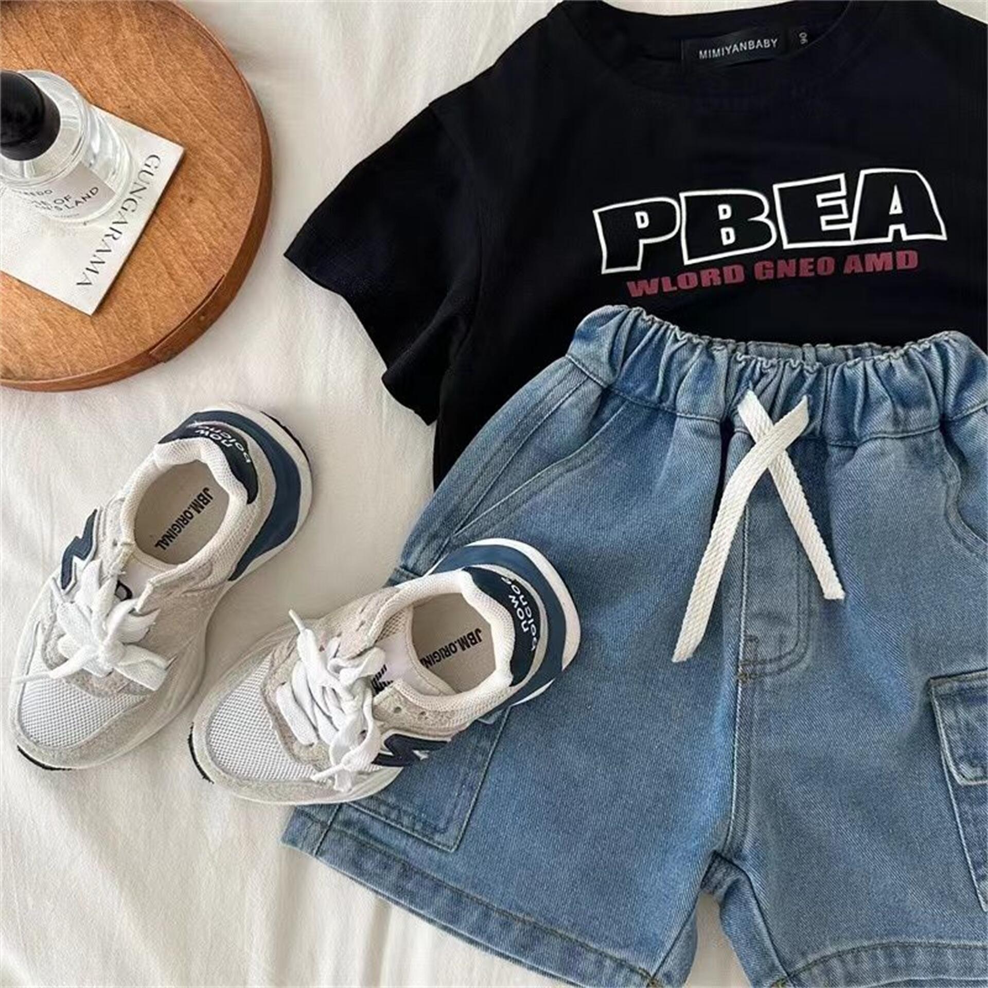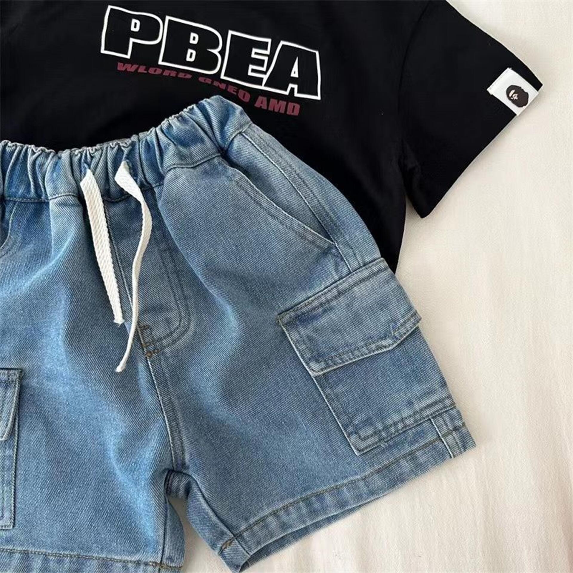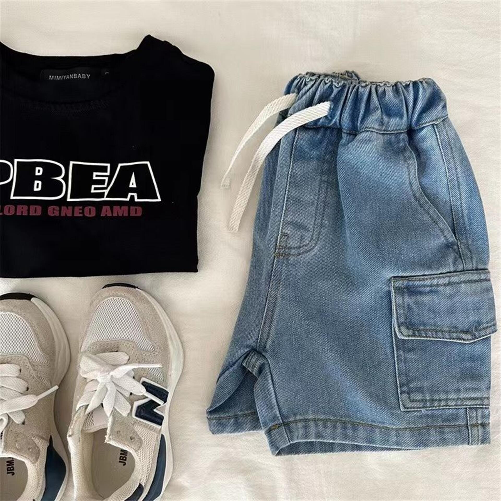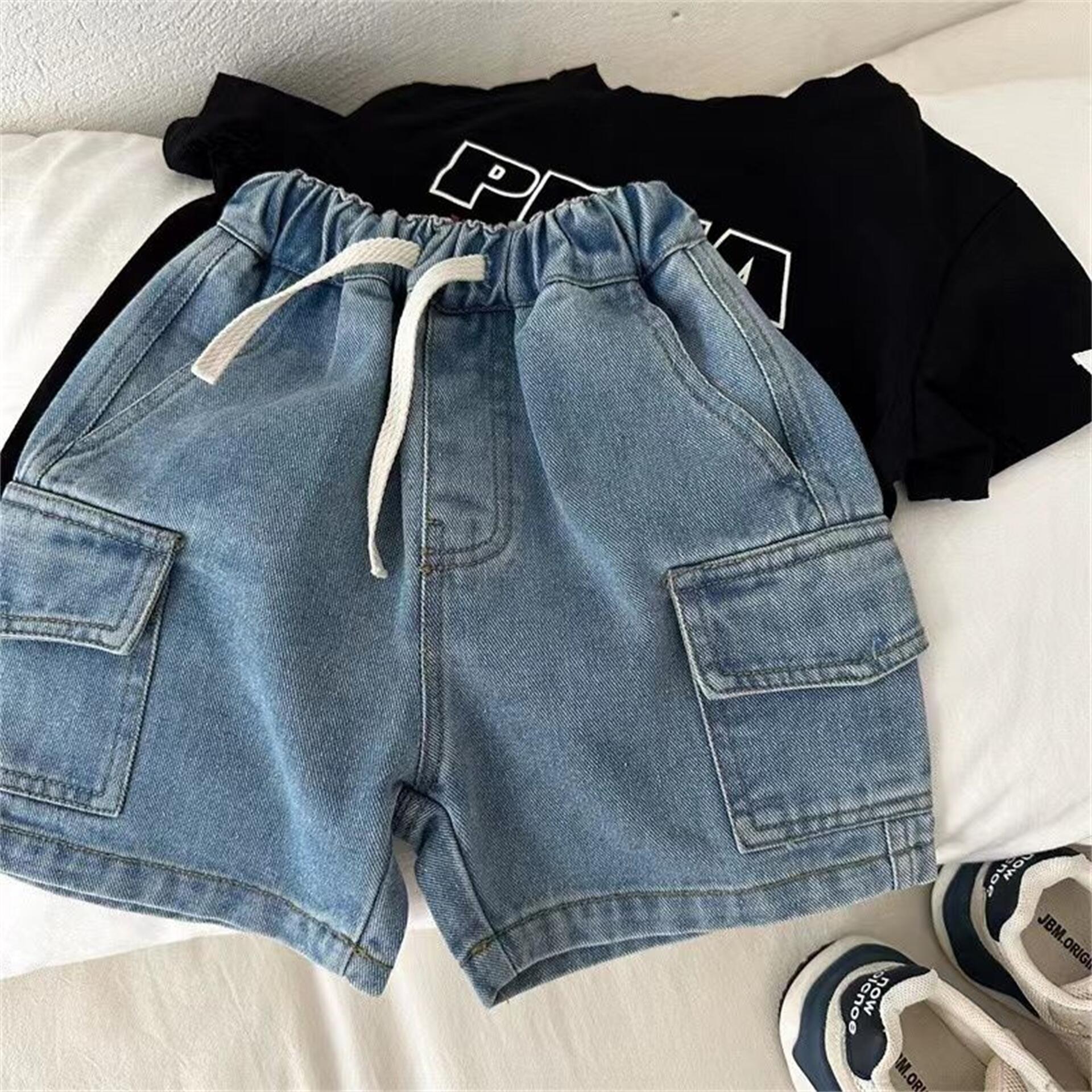 Tong Xingyuan 어린이 반바지 여름 새 소년과 소녀 솔리드 컬러 포켓 작업복 반바지 아기의 데님 바지 유행
