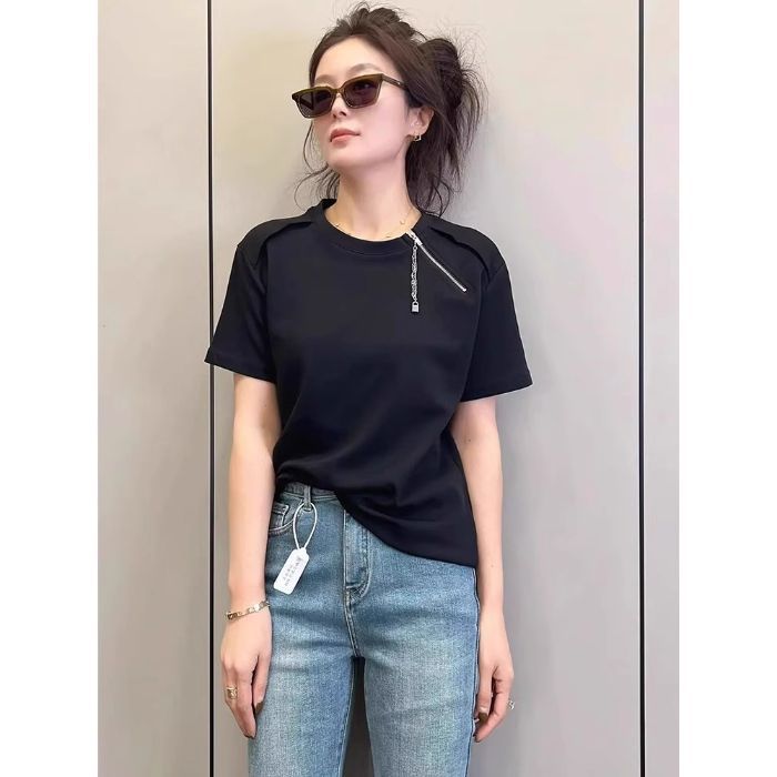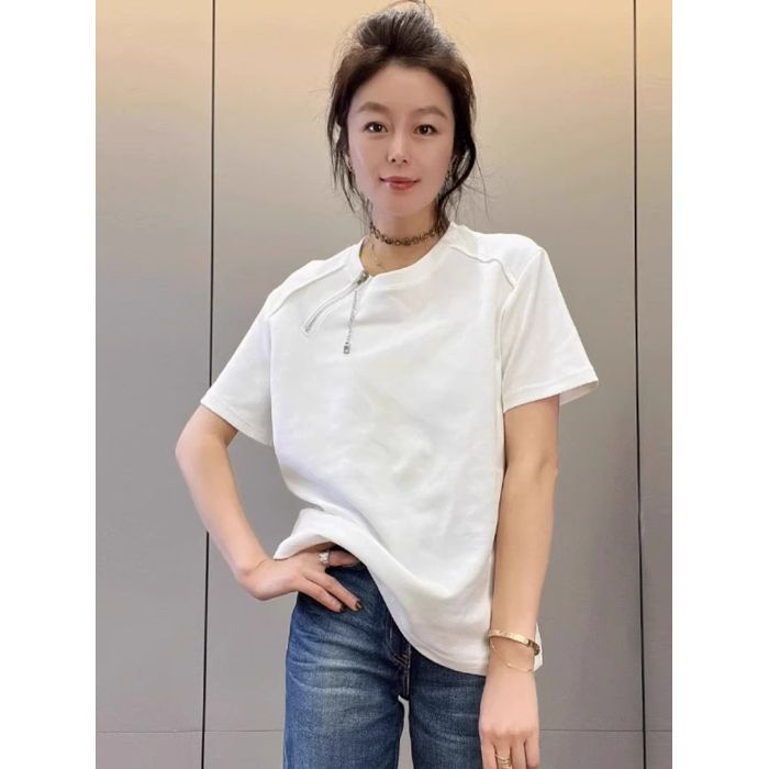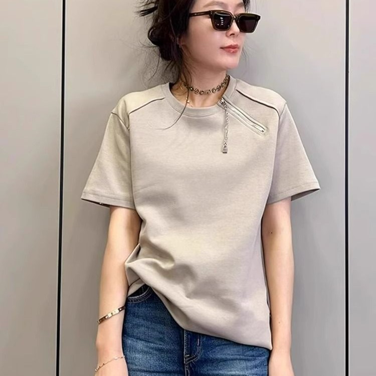 유럽 역 2025 새로운 여름 패션 지퍼 여성 반팔 티셔츠 느슨한 반팔 탑 인기 여성 의류스토어 가기