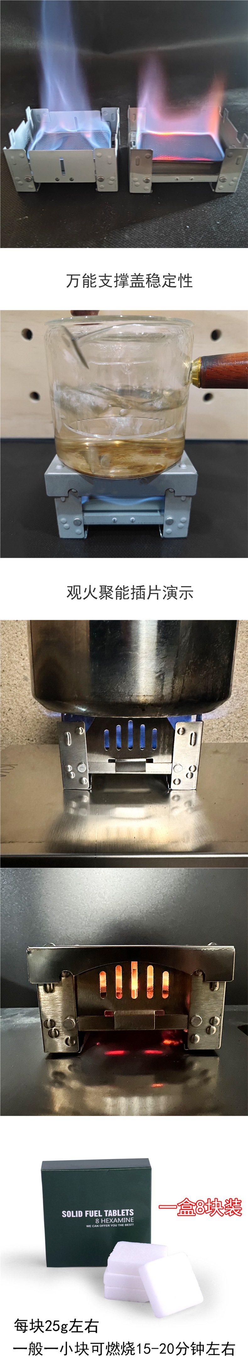 • 소형 독일 스타일 스토브 + 에너지 수집 및 화재 관찰 이중 인서트 + 드립 박스 + 8개의 고에너지 알코올 블록 3박스