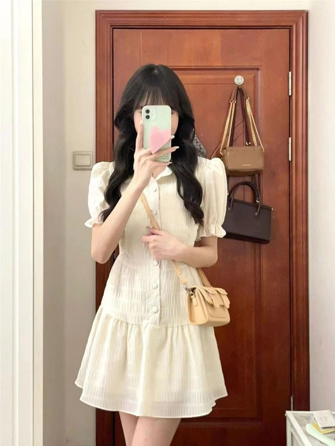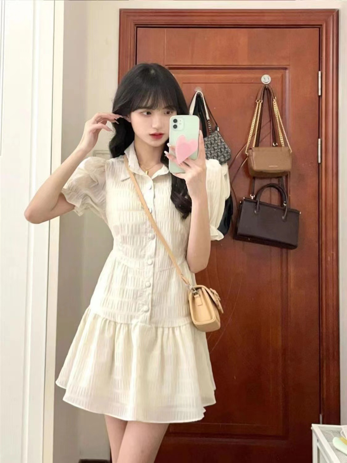 프랑스 스타일 한국 스타일 달콤한 폴로 칼라 원피스 퍼프 소매 쉬폰 여성 여름 디자인 틈새 높은 허리 우아한 스커트