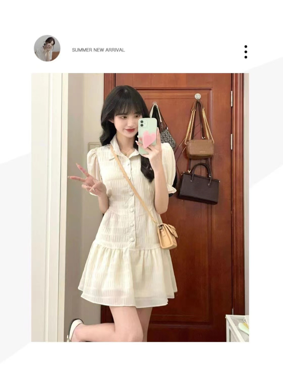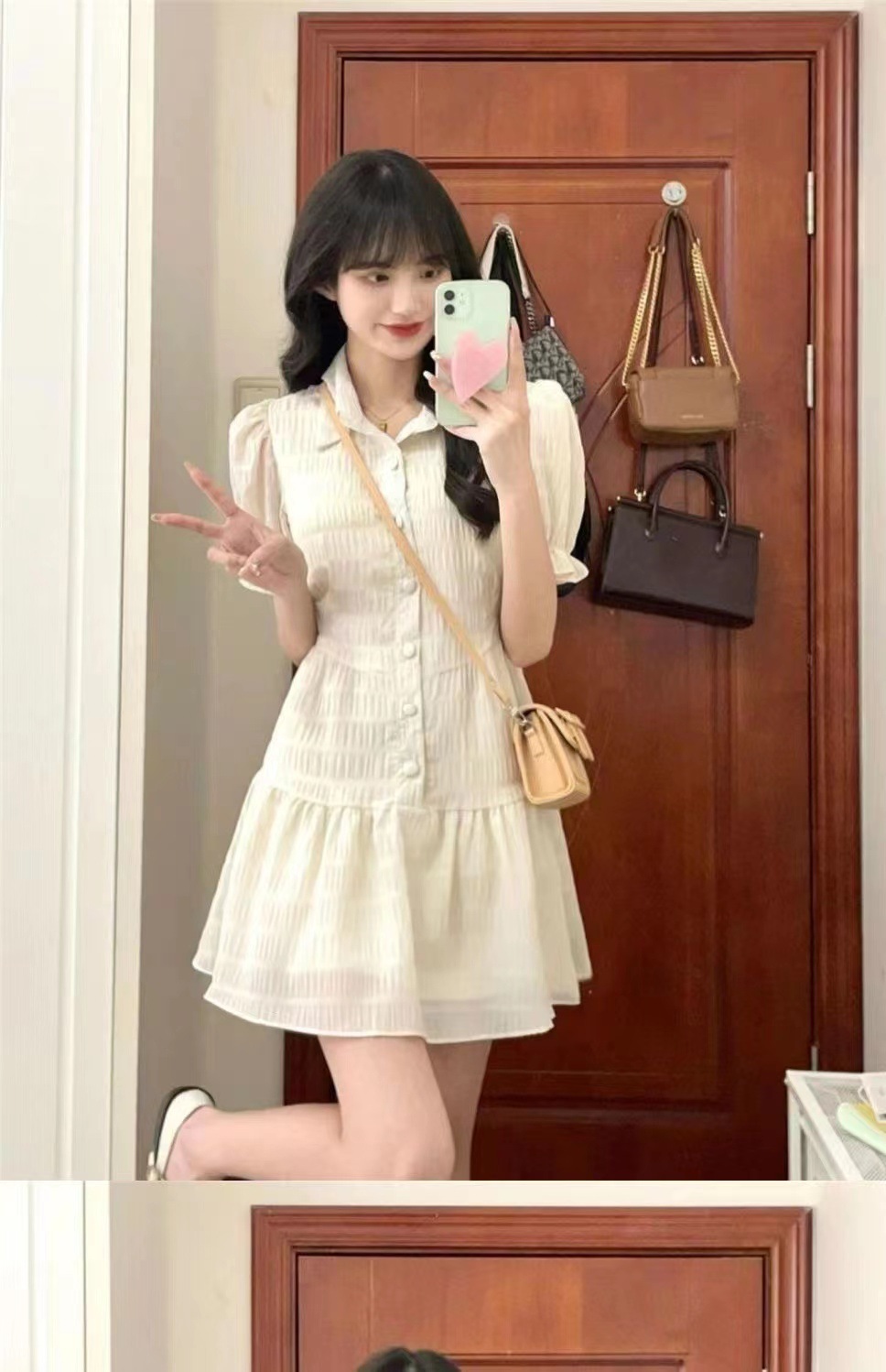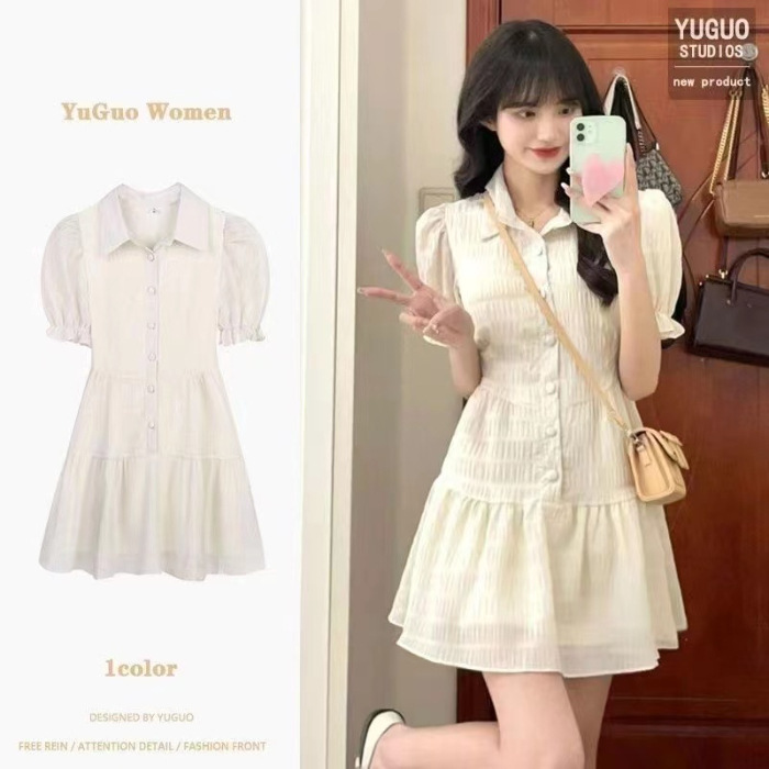프랑스 스타일 한국 스타일 달콤한 폴로 칼라 원피스 퍼프 소매 쉬폰 여성 여름 디자인 틈새 높은 허리 우아한 스커트스토어 가기