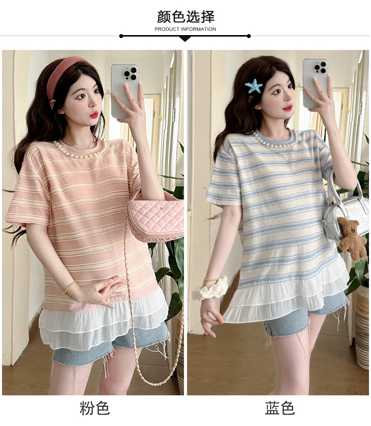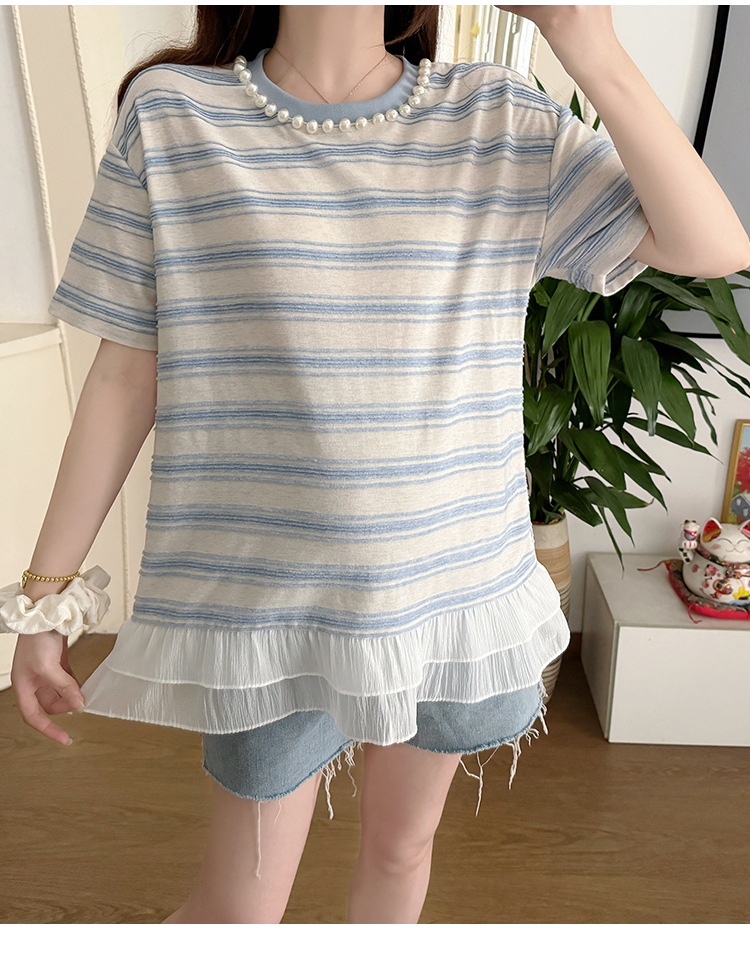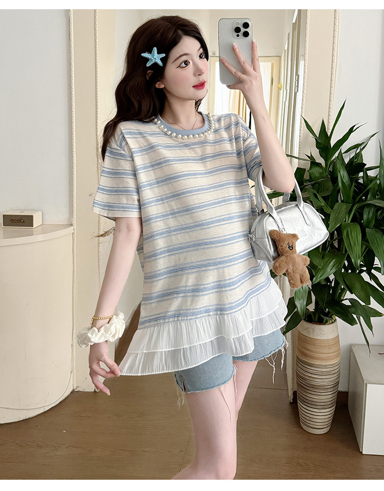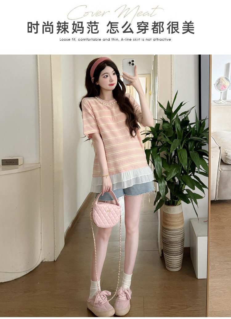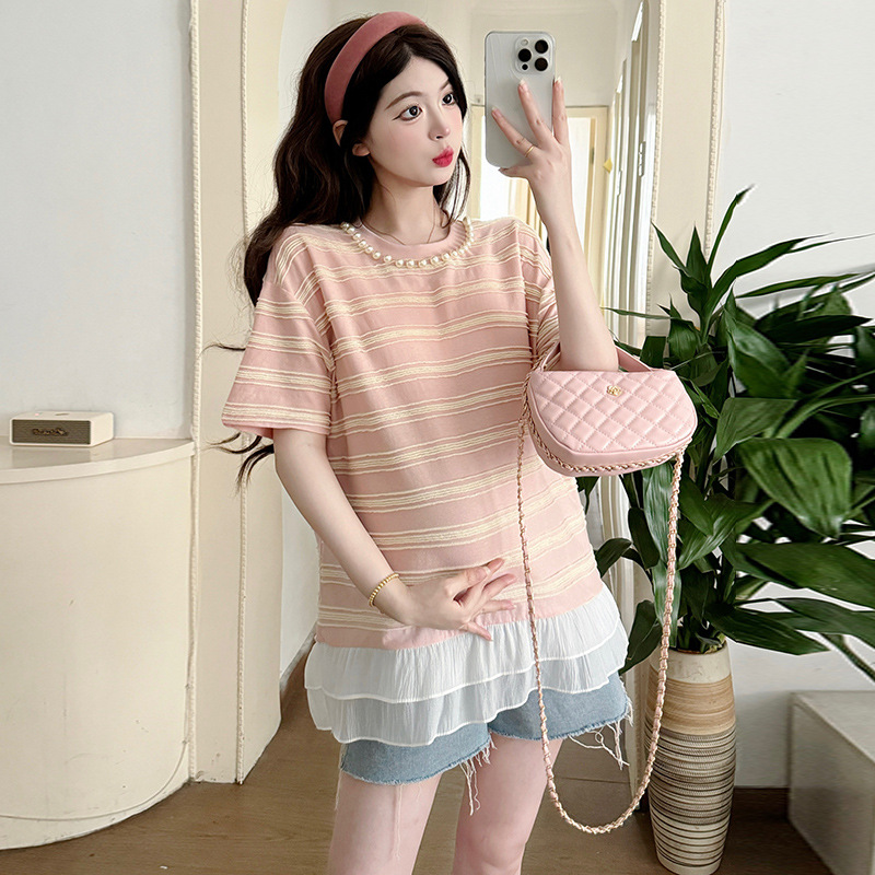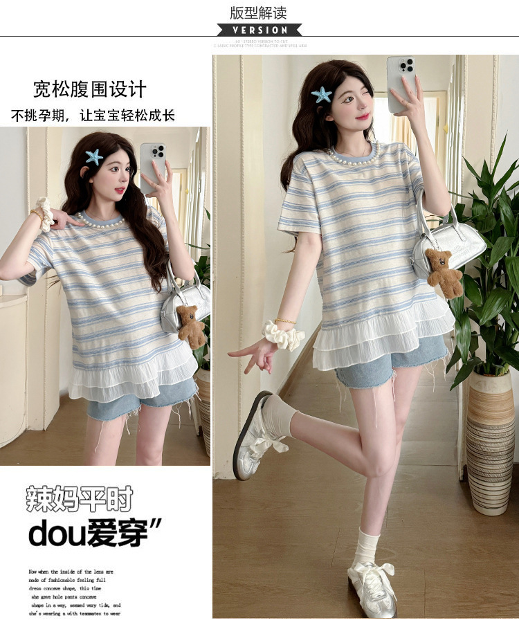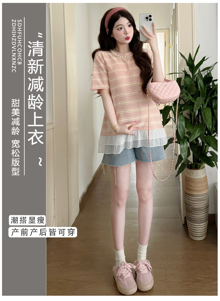 여름 새로운 한국 스타일 달콤한 줄무늬 바느질 쉬폰 느슨한 임산부 티셔츠 탑