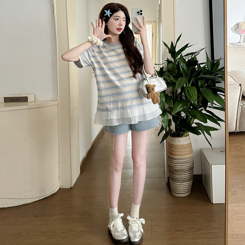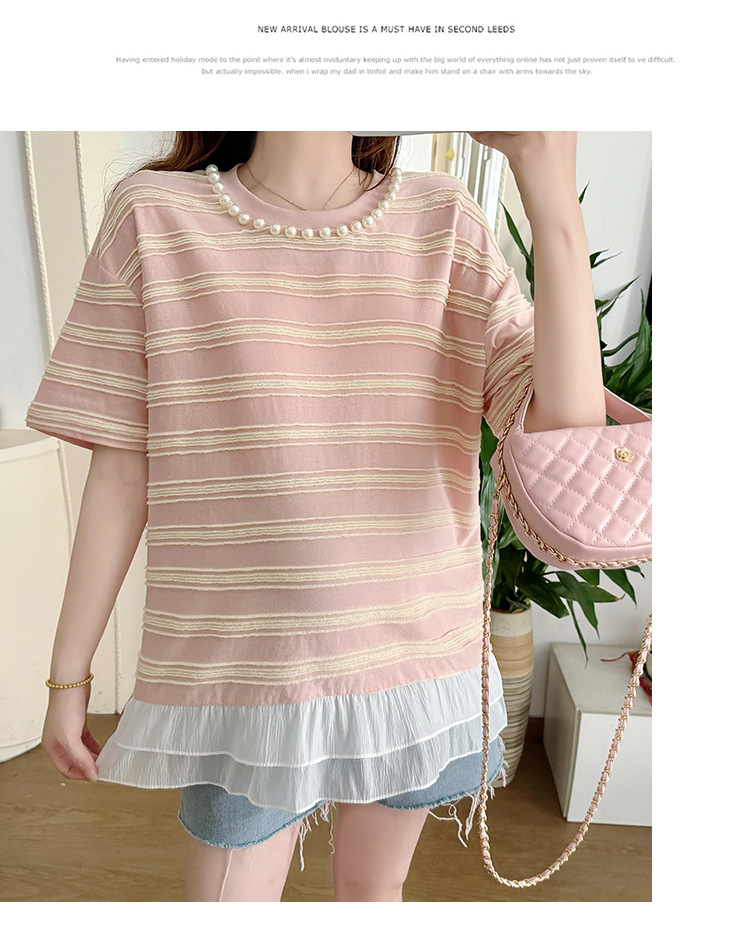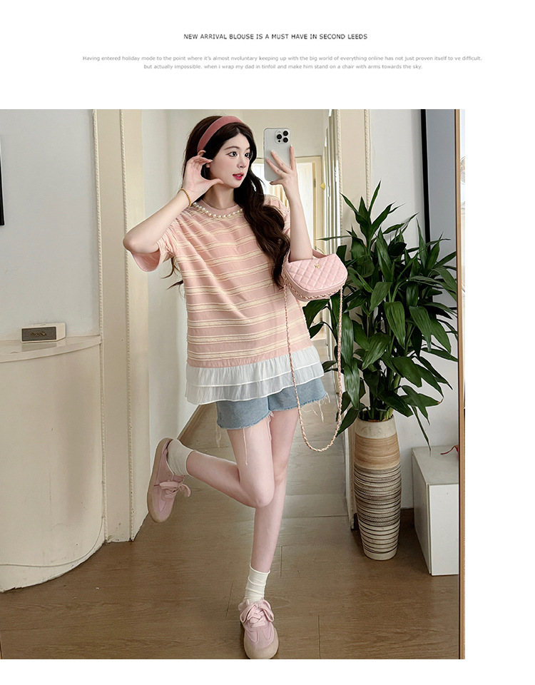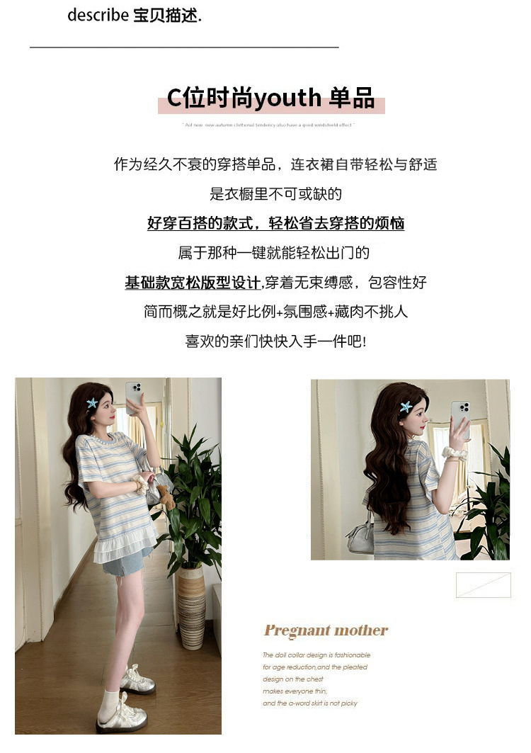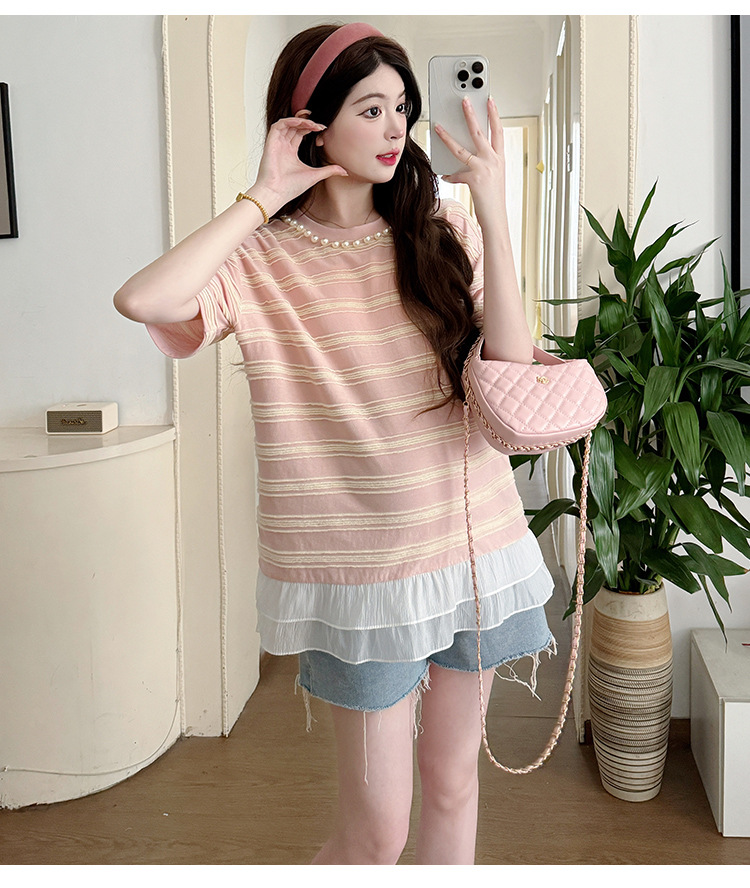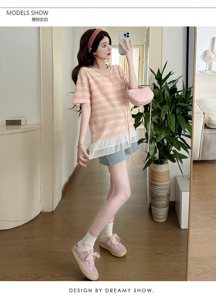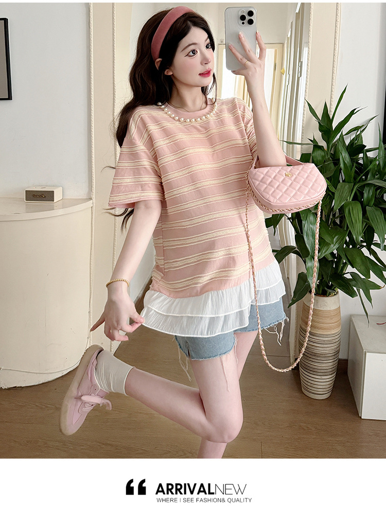여름 새로운 한국 스타일 달콤한 줄무늬 바느질 쉬폰 느슨한 임산부 티셔츠 탑