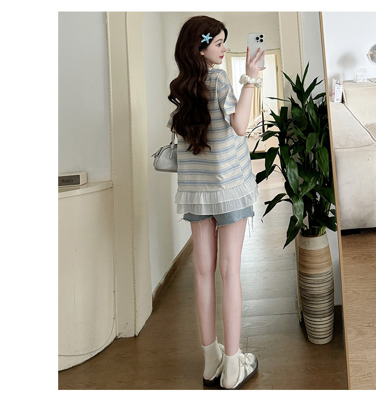여름 새로운 한국 스타일 달콤한 줄무늬 바느질 쉬폰 느슨한 임산부 티셔츠 탑스토어 가기