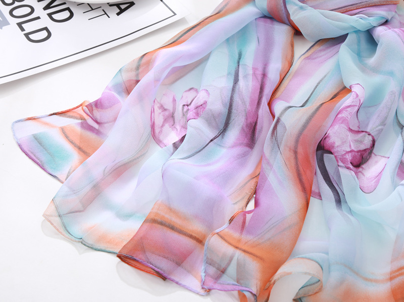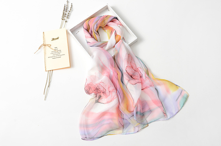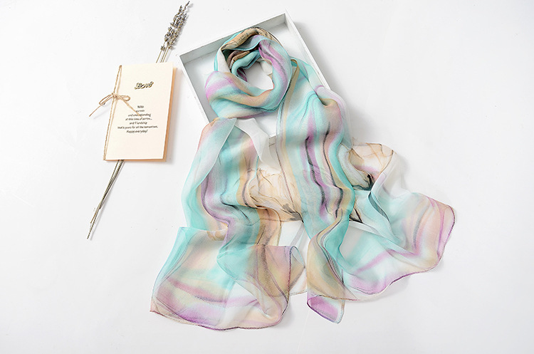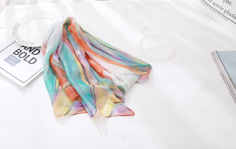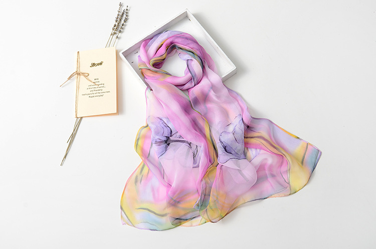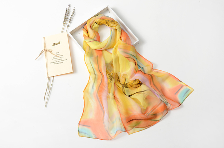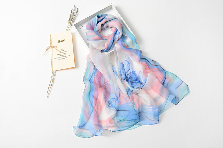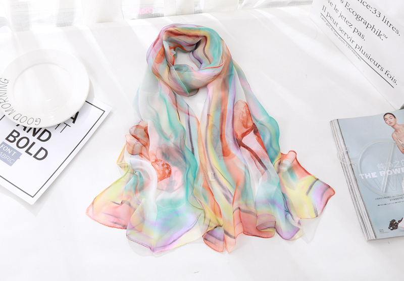 봄과 여름 가볍고 얇은 댄스 장식 작은 실크 스카프 여성 쉬폰 인쇄 좁은 스카프 목 스카프 부드러운 거즈 인쇄 비치 타월 유행스토어 가기