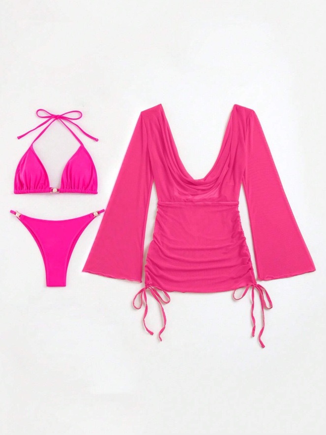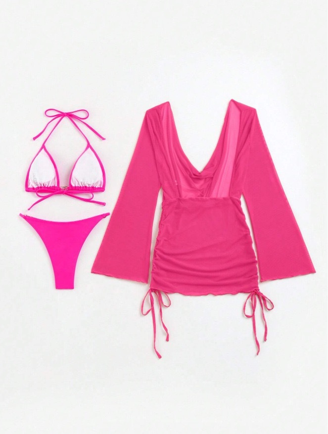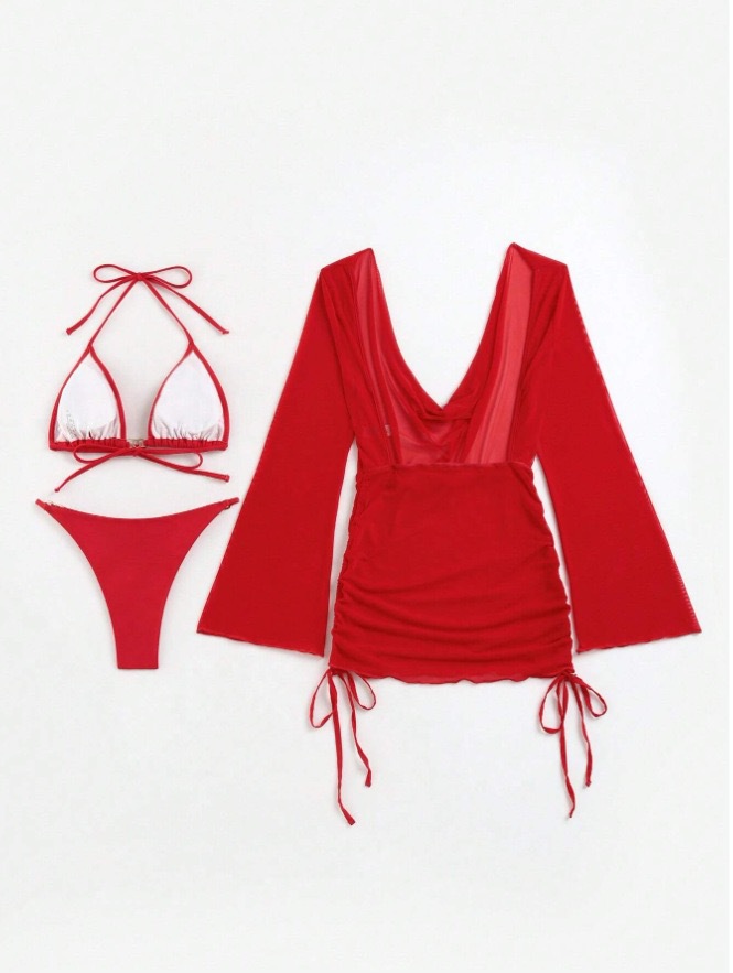 유럽과 미국의 여름 해변 휴가 섹시한 비키니 메쉬 긴팔 스커트 점프 슈트 백리스 3 피스 여성 수영복