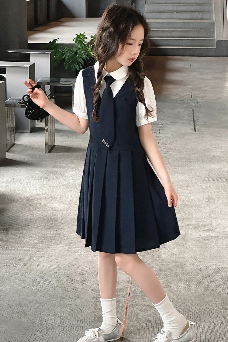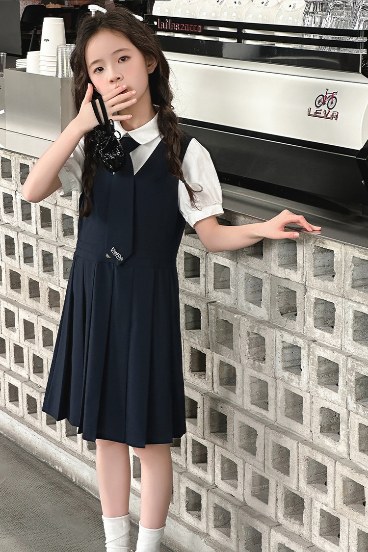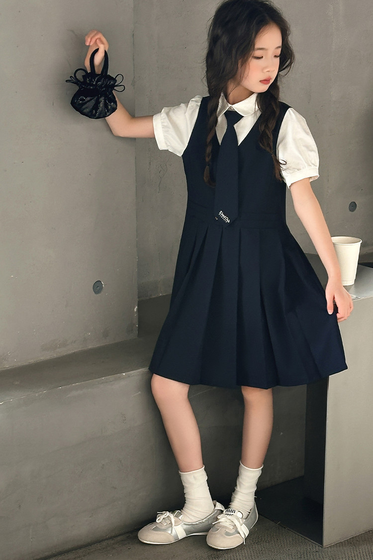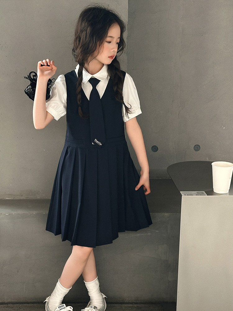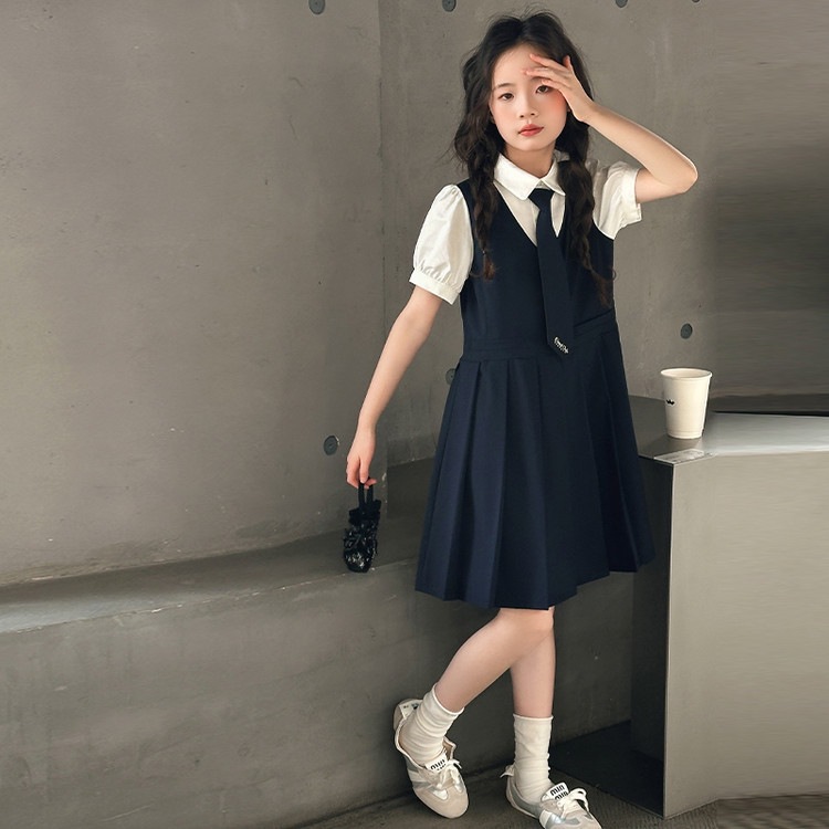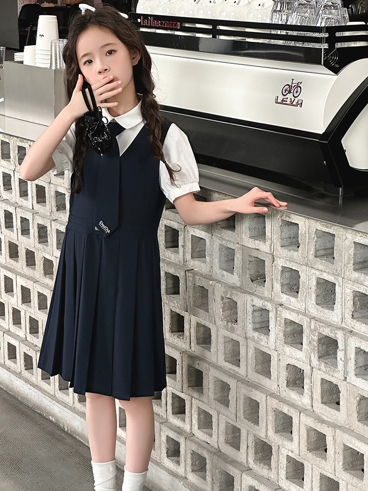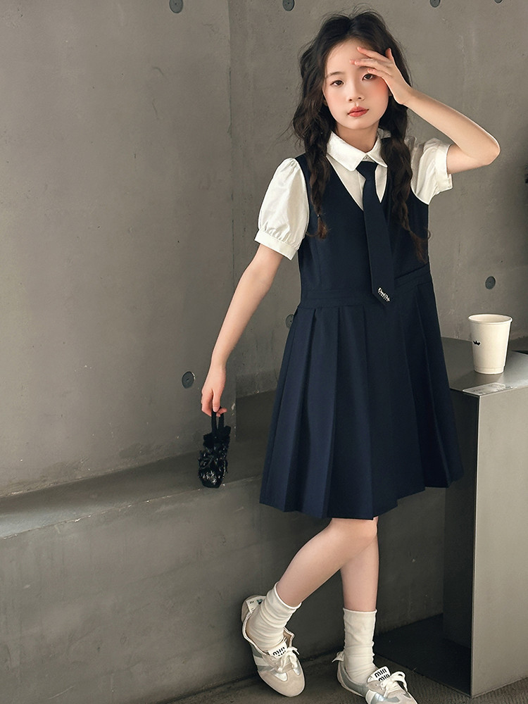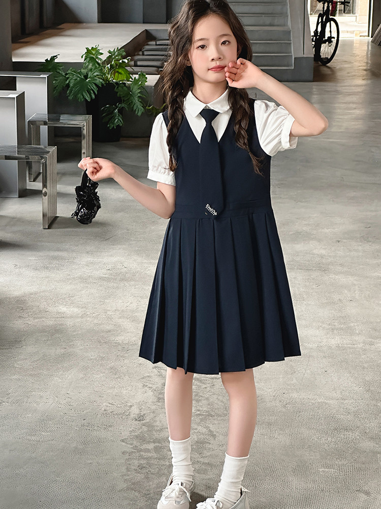 여자 대학 스타일 주름 드레스 2025 새로운 중대형 어린이 여름 스커트 어린이 여름 공주 드레스 JK 스커트