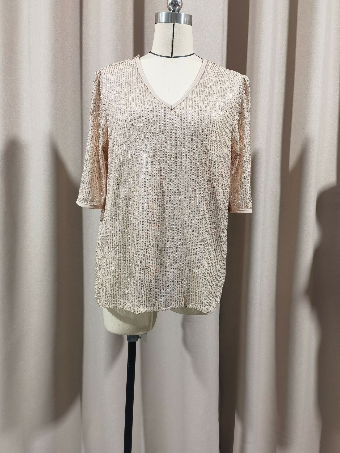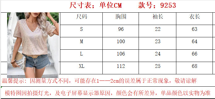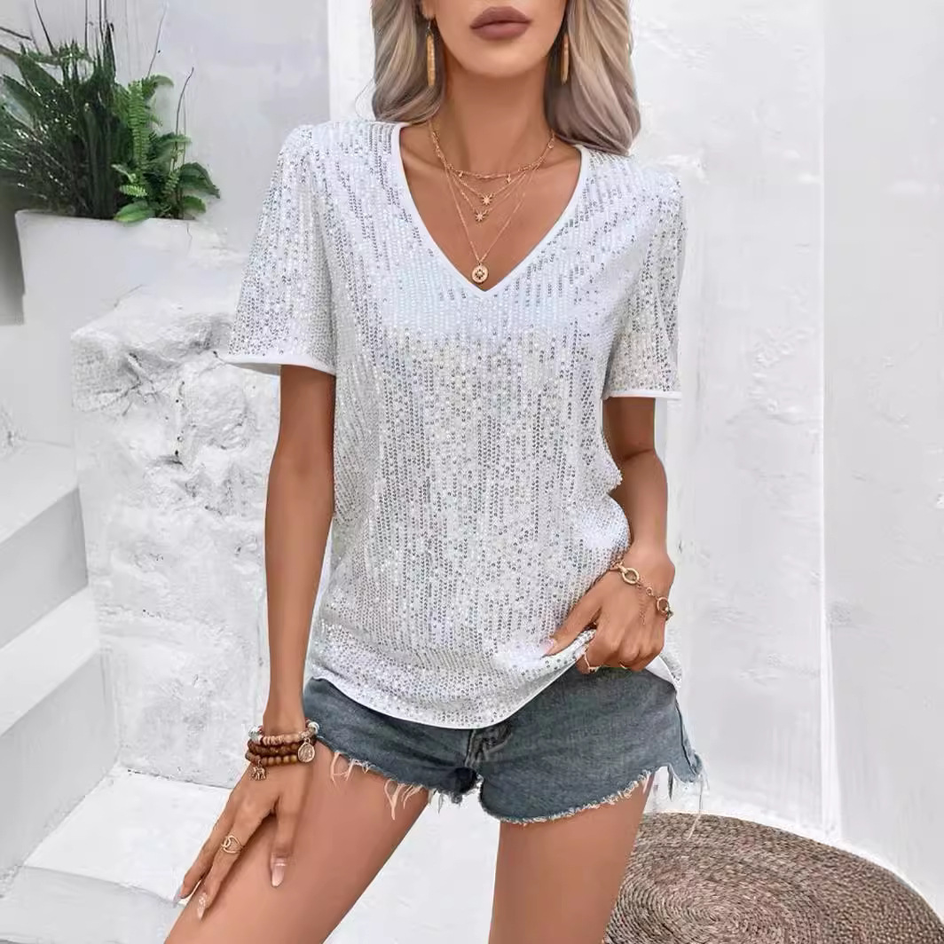 유럽과 미국의 아마존 크로스 여성 의류 크로스보더 새로운 핫 스타일 섹시한 솔리드 컬러 스팽글 v 넥 느슨한 반팔 여성 티셔츠