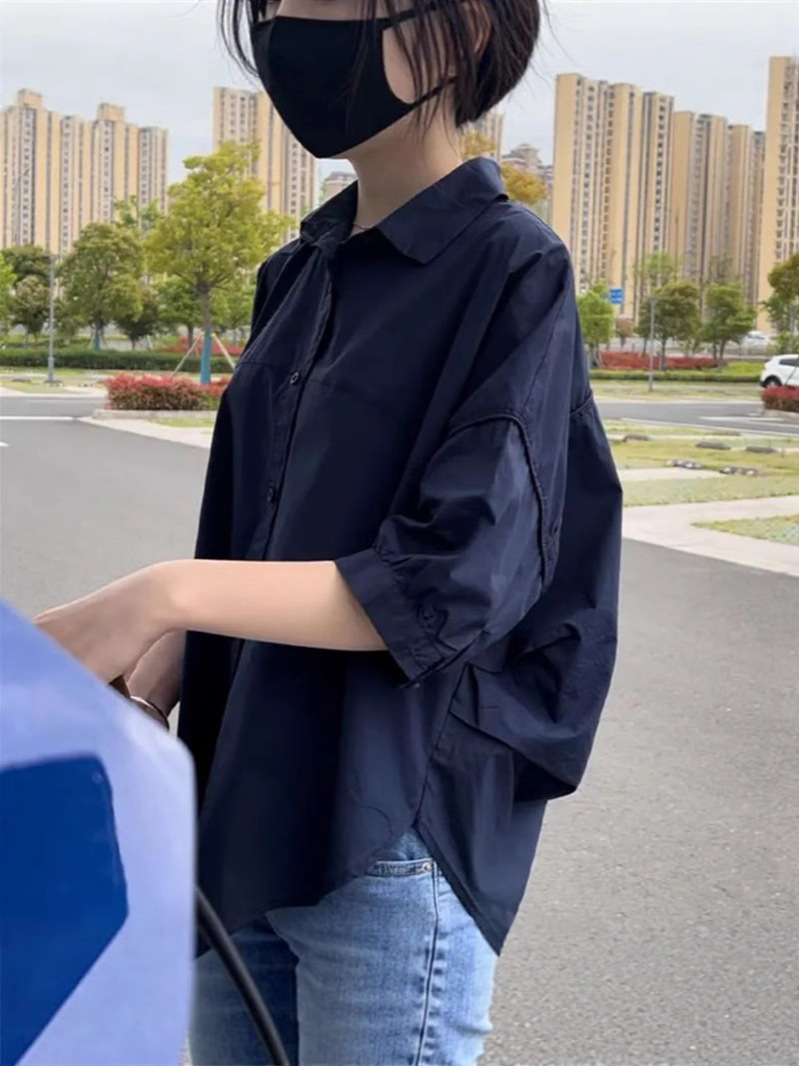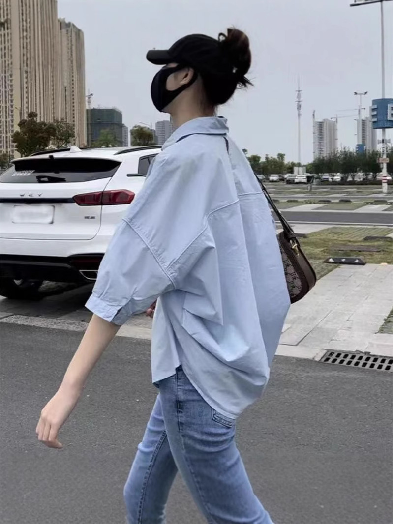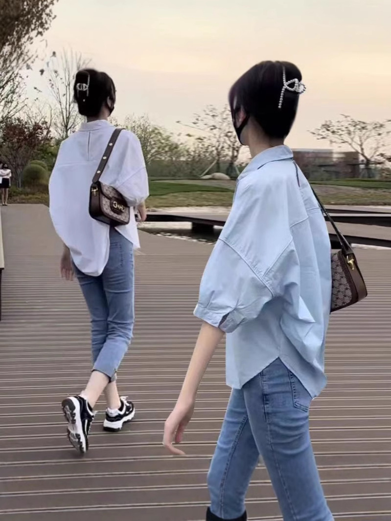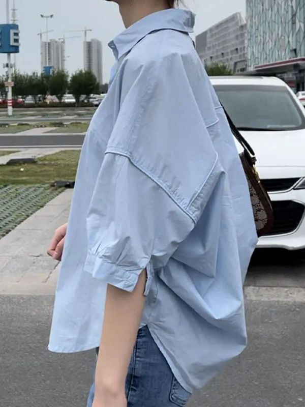 화이트 하프 슬리브 셔츠 여성 여름 2025 새로운 스타일 셔츠 느슨한 세련된 아름다운 작은 셔츠 느슨한 탑 디자인 감각스토어 가기