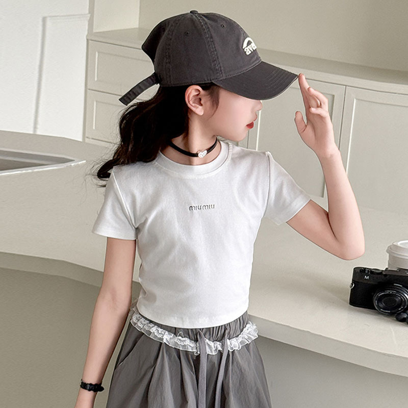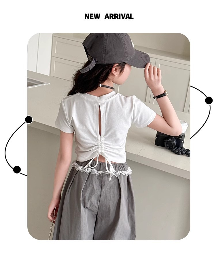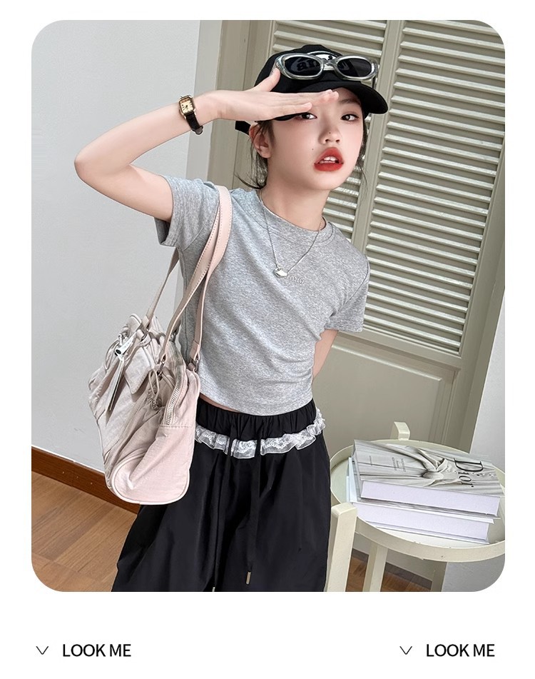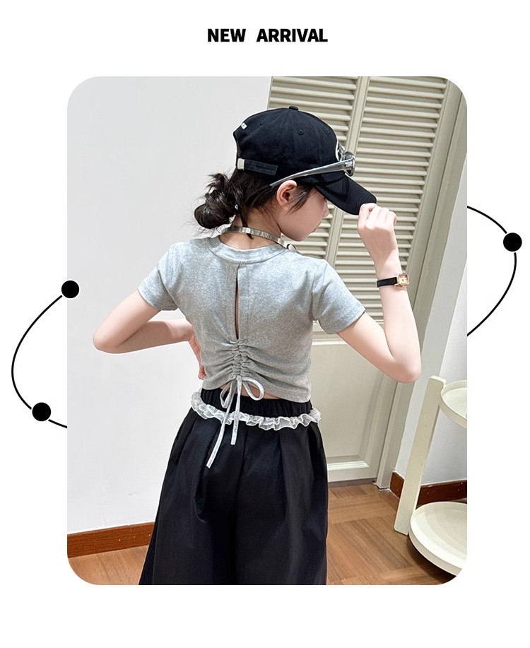 여자 반팔 티셔츠 2025 여름 유행 새로운 어린이 속이 빈 백리스 탑 배꼽 노출 miu 여름 반팔