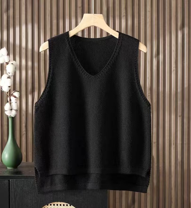 봄과 가을 단색 면 조끼 여성용 V 넥 니트 민소매 스웨터, 짧고 느슨한 바닥과 다용도스토어 가기