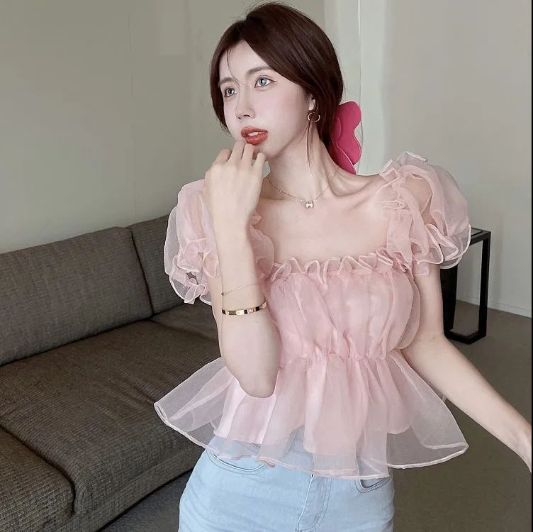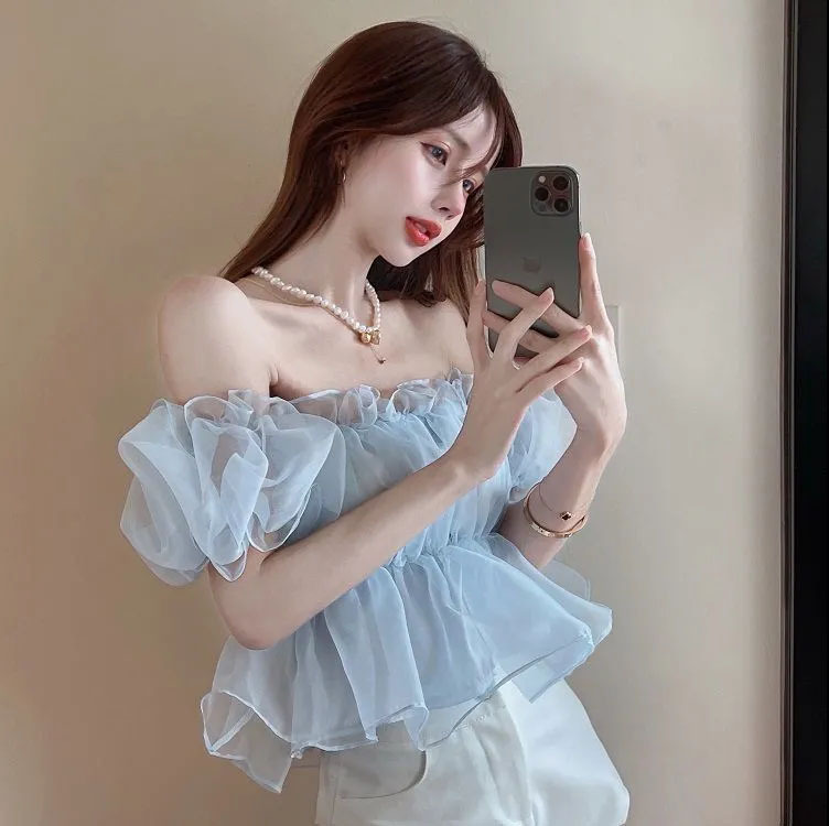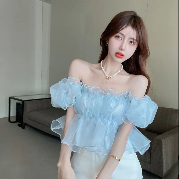 여성을위한 크로스 바운드 원 숄더 솔리드 컬러 탑 2025 여름 새로운 슬림하고 달콤한 오프 숄더 스퀘어 넥 퍼프 슬리브 탑 트렌디