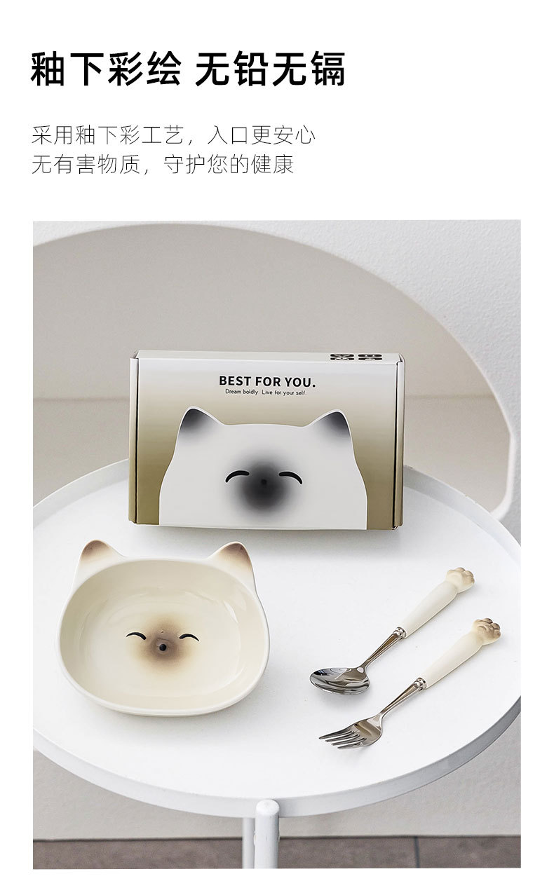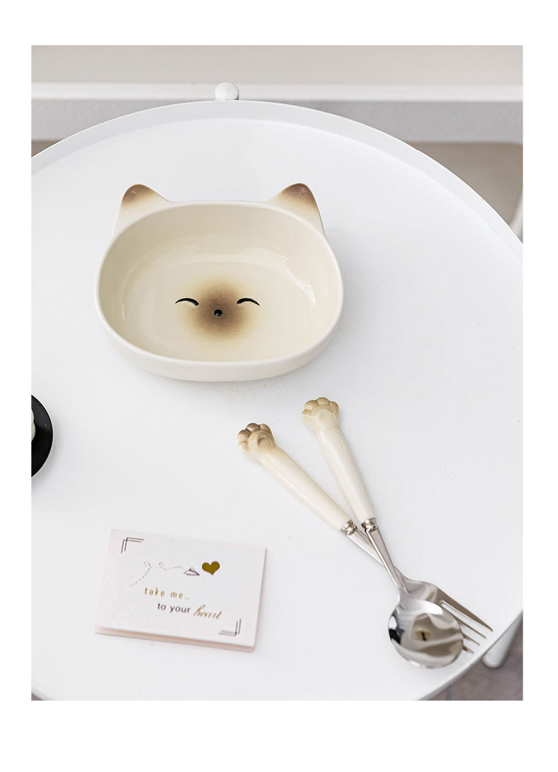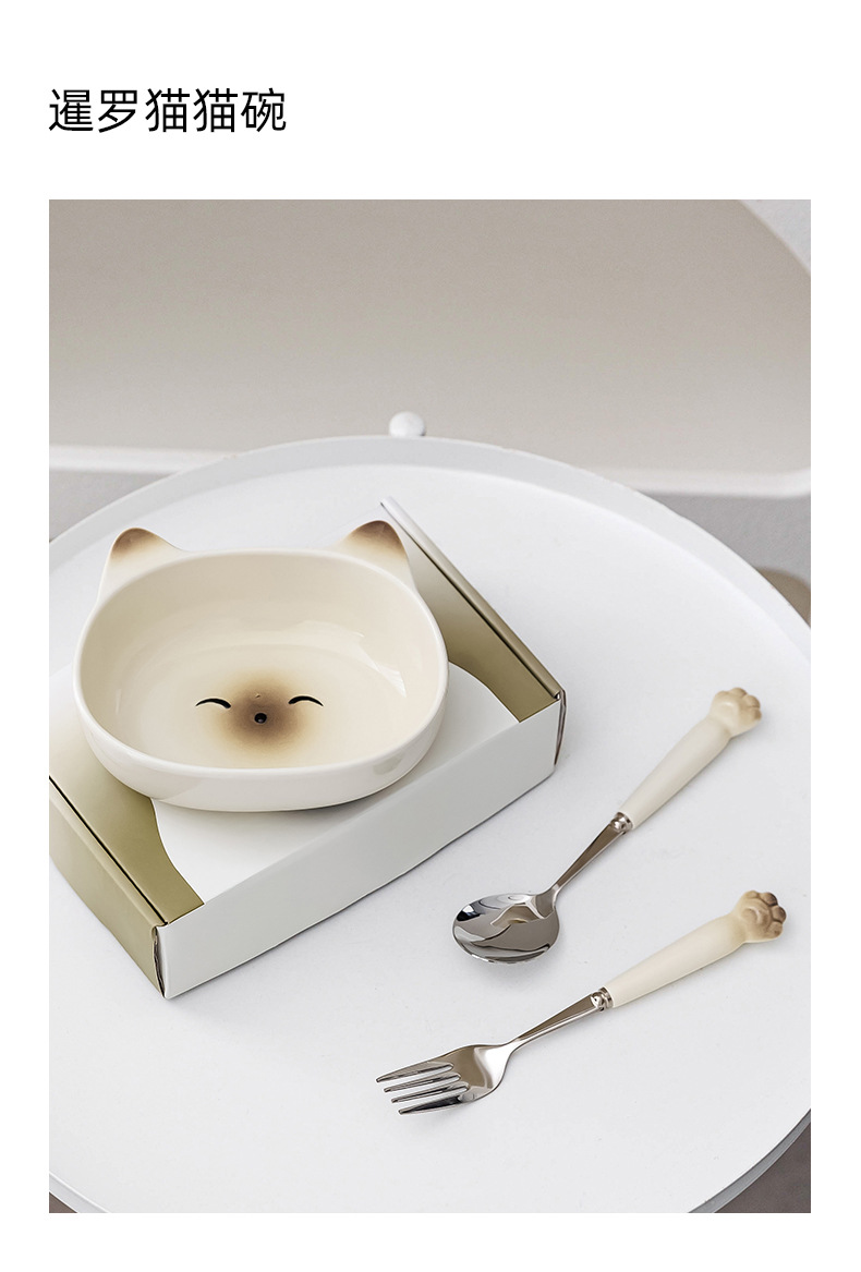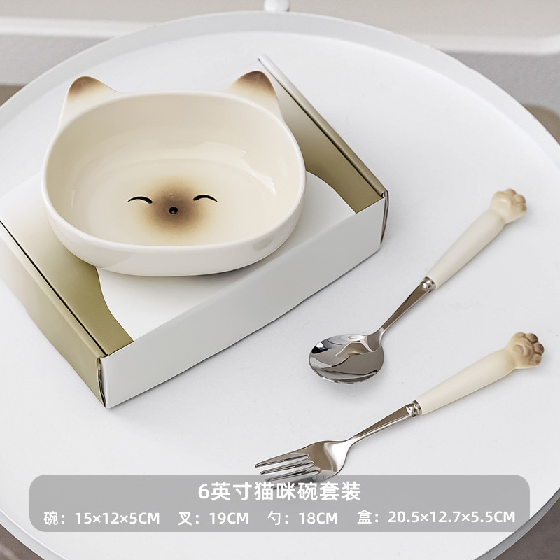 귀여운 고양이 세라믹 그릇 스테인레스 스틸 스푼 먹는 스푼 학생 어린이 홈 휴대용 세트 그릇 선물 상자