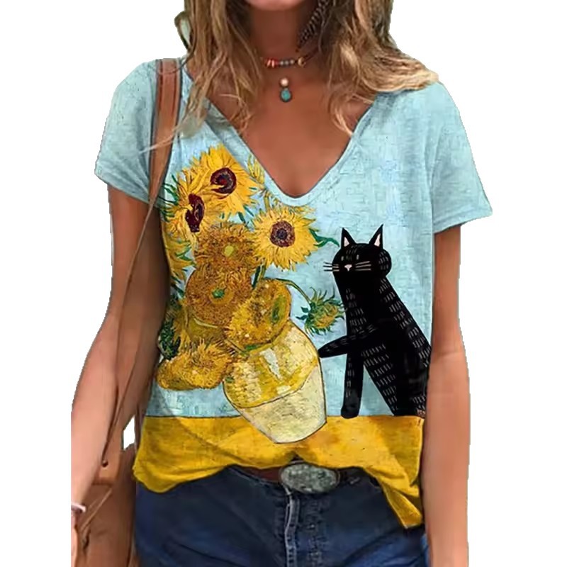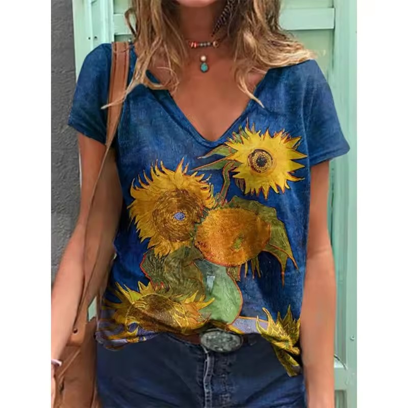 유럽과 미국의 국경 간 대외 무역 아마존 여름 루즈 탑 해바라기 프린트 여성용 V 넥 오픈 풀오버 티셔츠스토어 가기