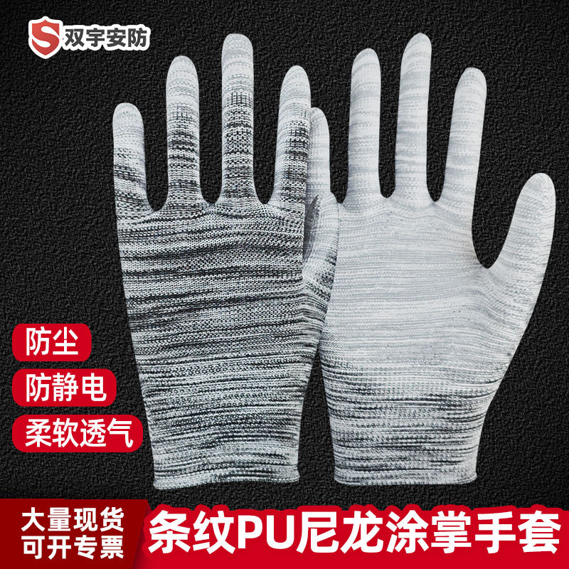 공장 도매 13 바늘 나일론 흑백 줄무늬 PU 코팅 손바닥 장갑 정전기 방지 미끄럼 방지 내마모성 PU 고무 장갑스토어 가기