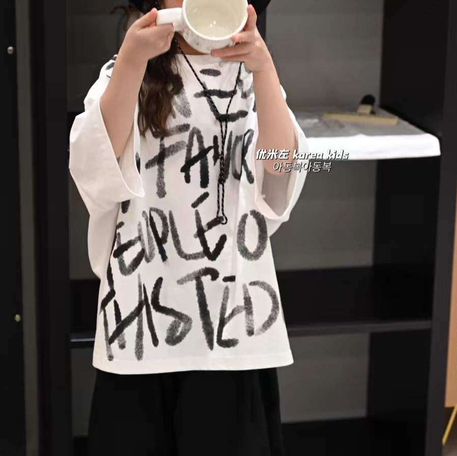 소년과 소녀 여름 반팔 티셔츠 아기 유행 어린이 맞춤형 유행 한국어 버전 편지 낙서 인쇄 루즈 탑스토어 가기