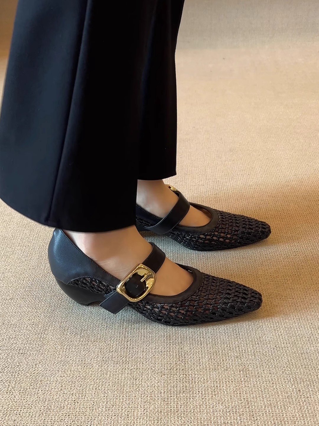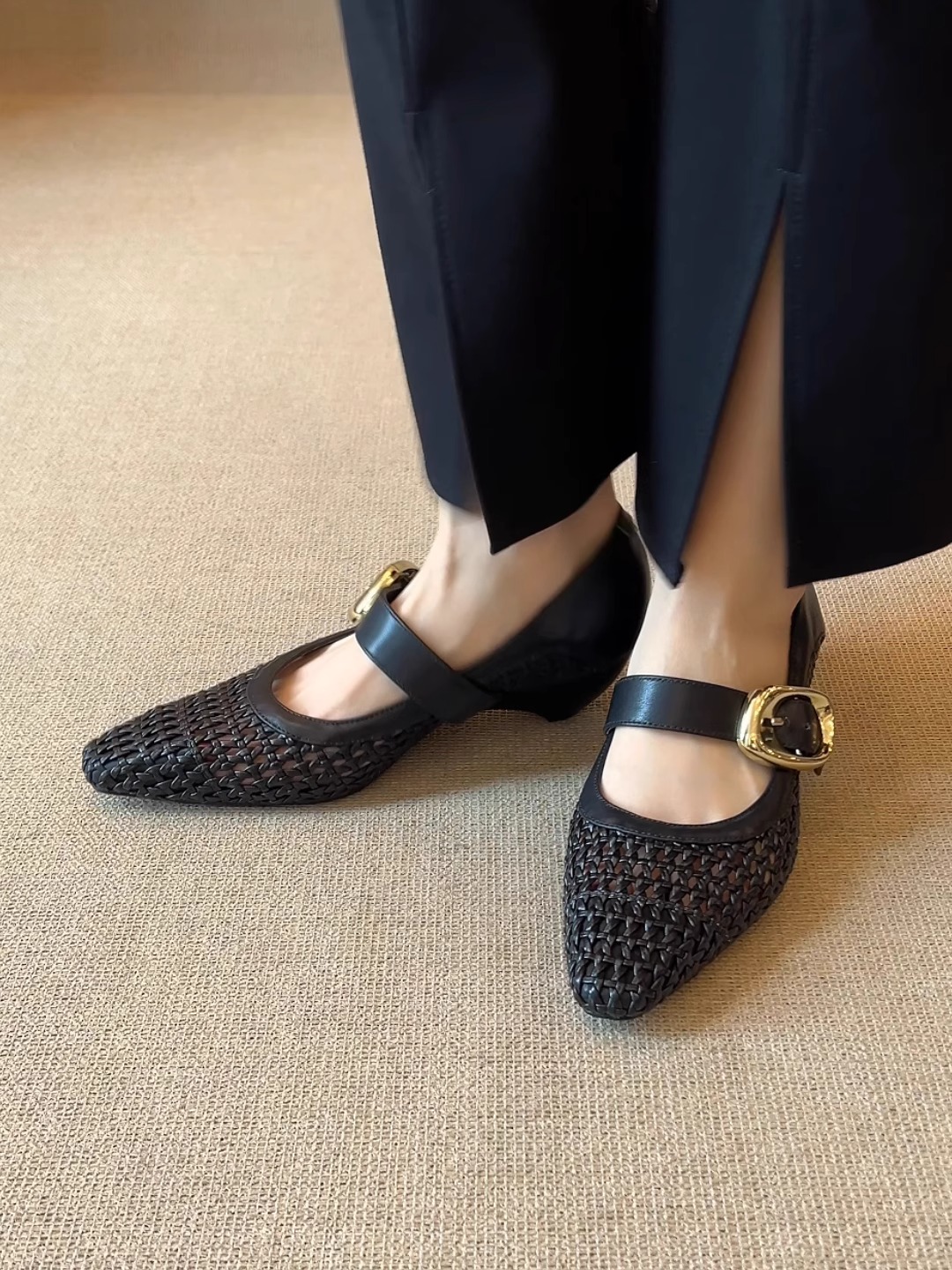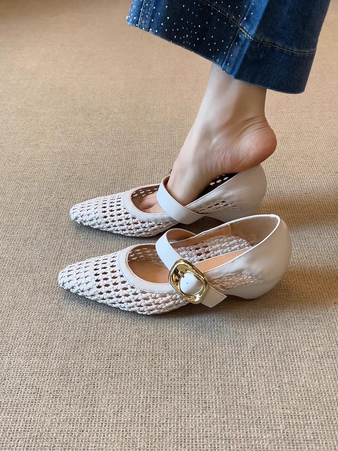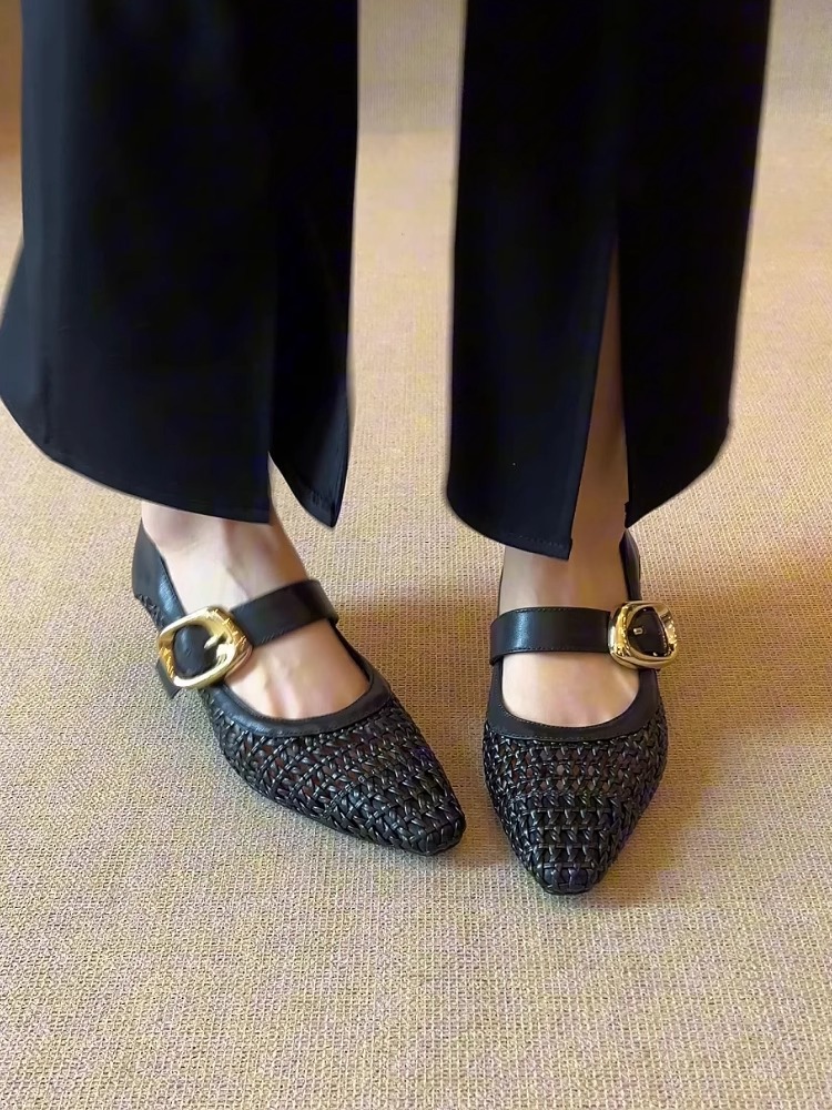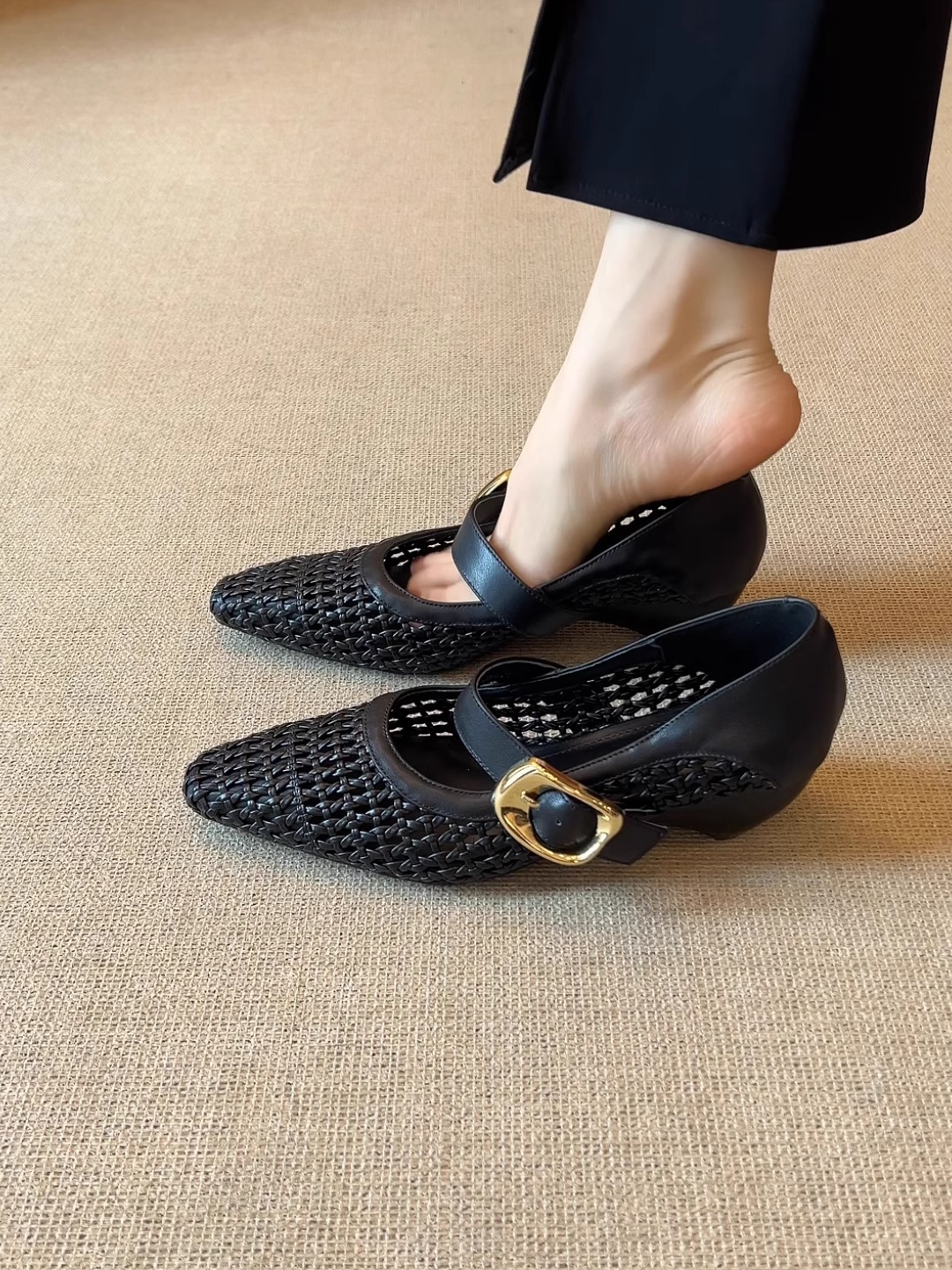 Cowhide 버전 ~ 패션 조커 우아한 금속 버클 포인팅 싱글 레이어 신발 여성용 짠 빈 통기성 얕은 샌들
