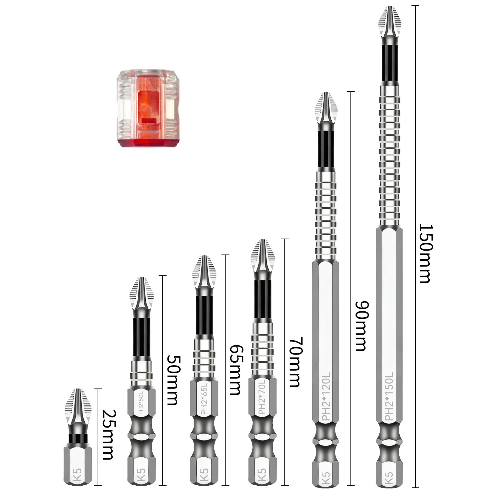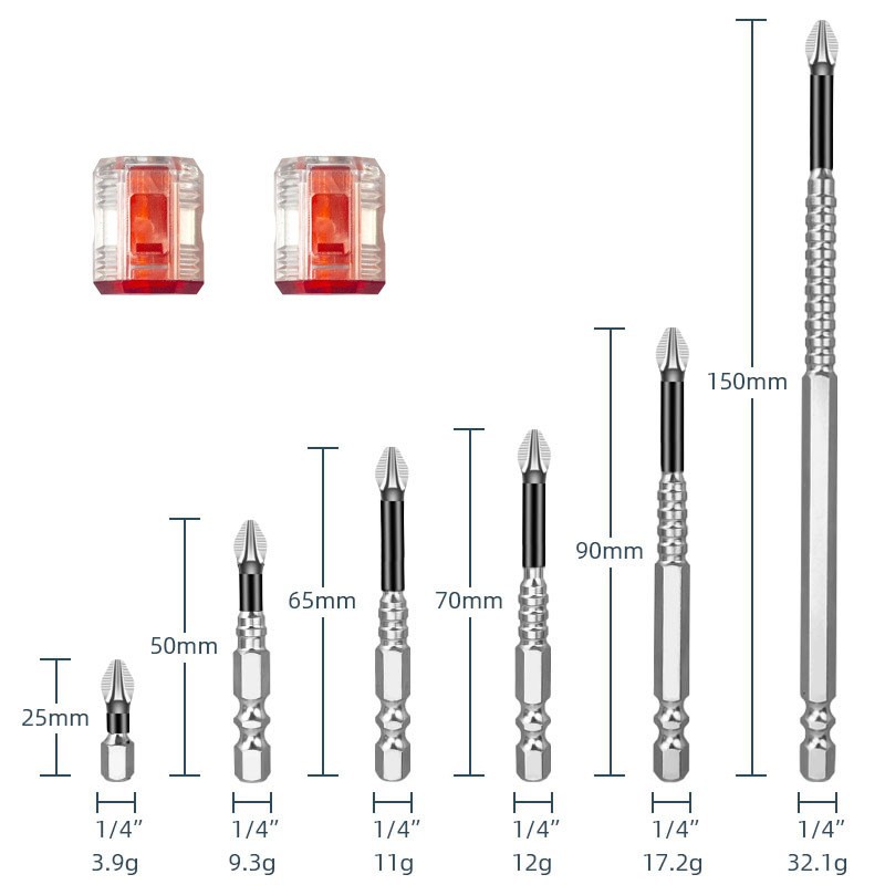 • 7개[S3 티타늄 도금 비트 25/50/65/70/90/150mm + 빨간색 투명 자석 코일] 가방 92.5g