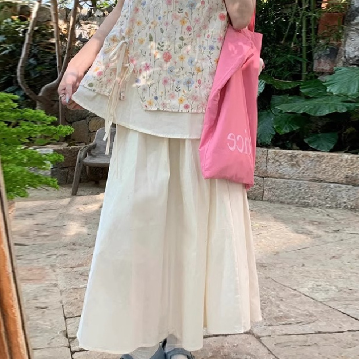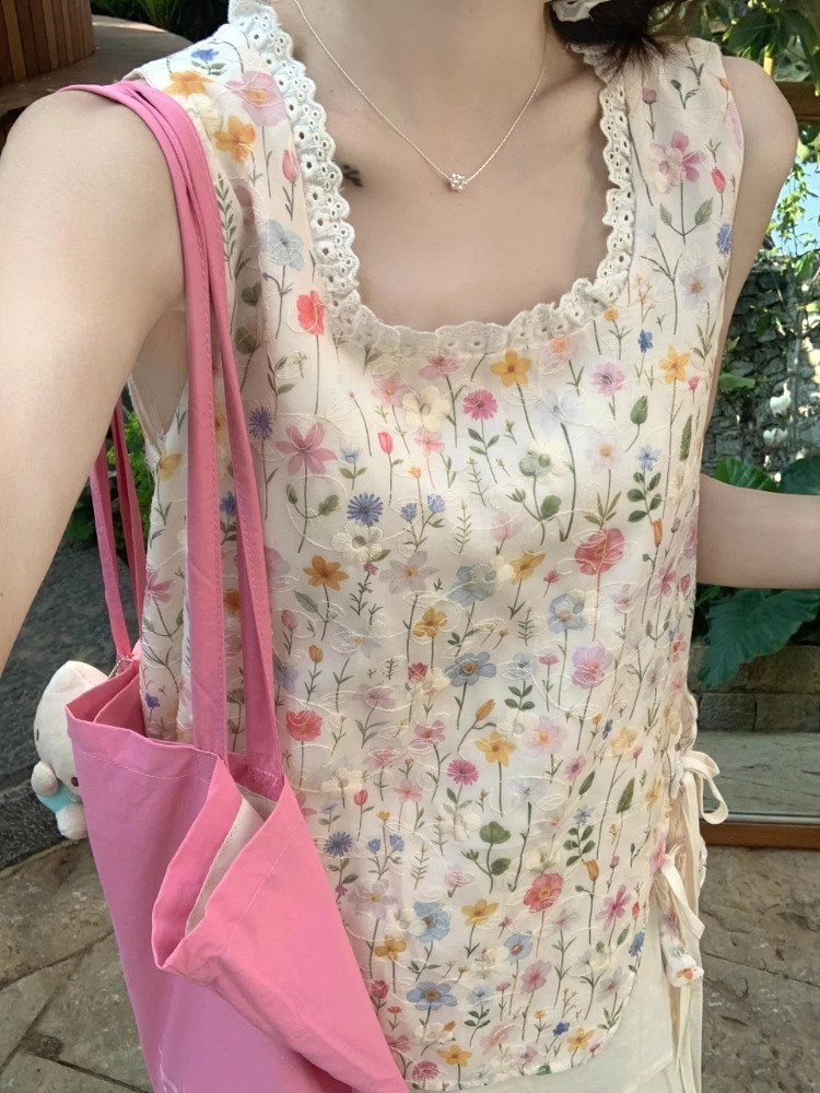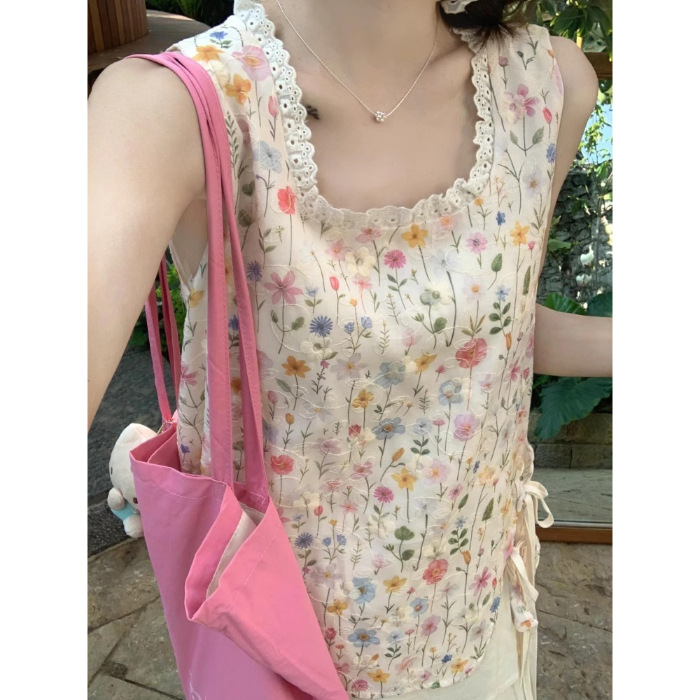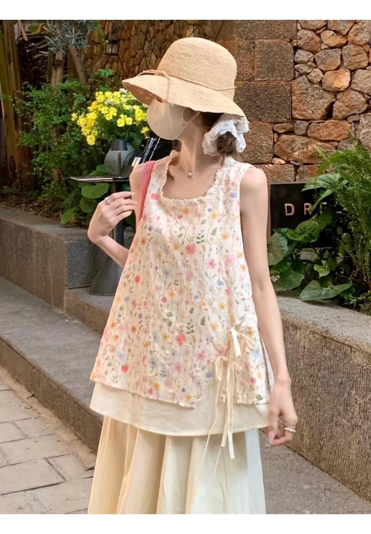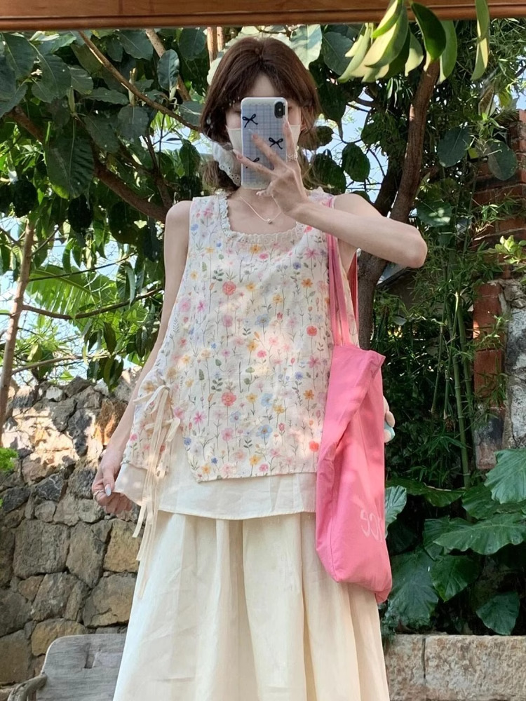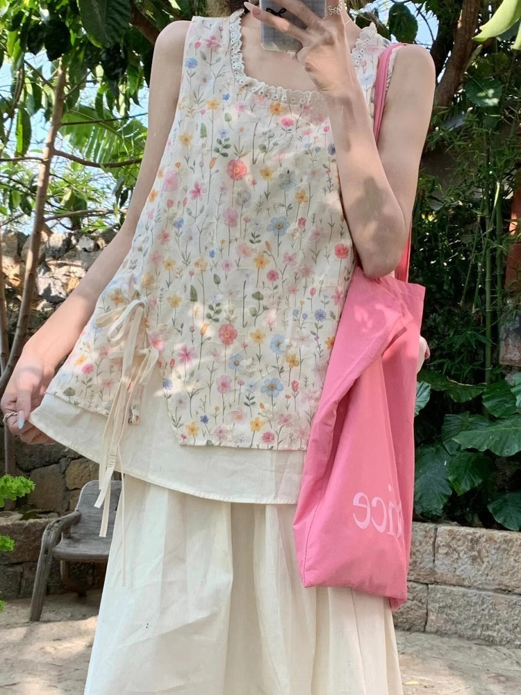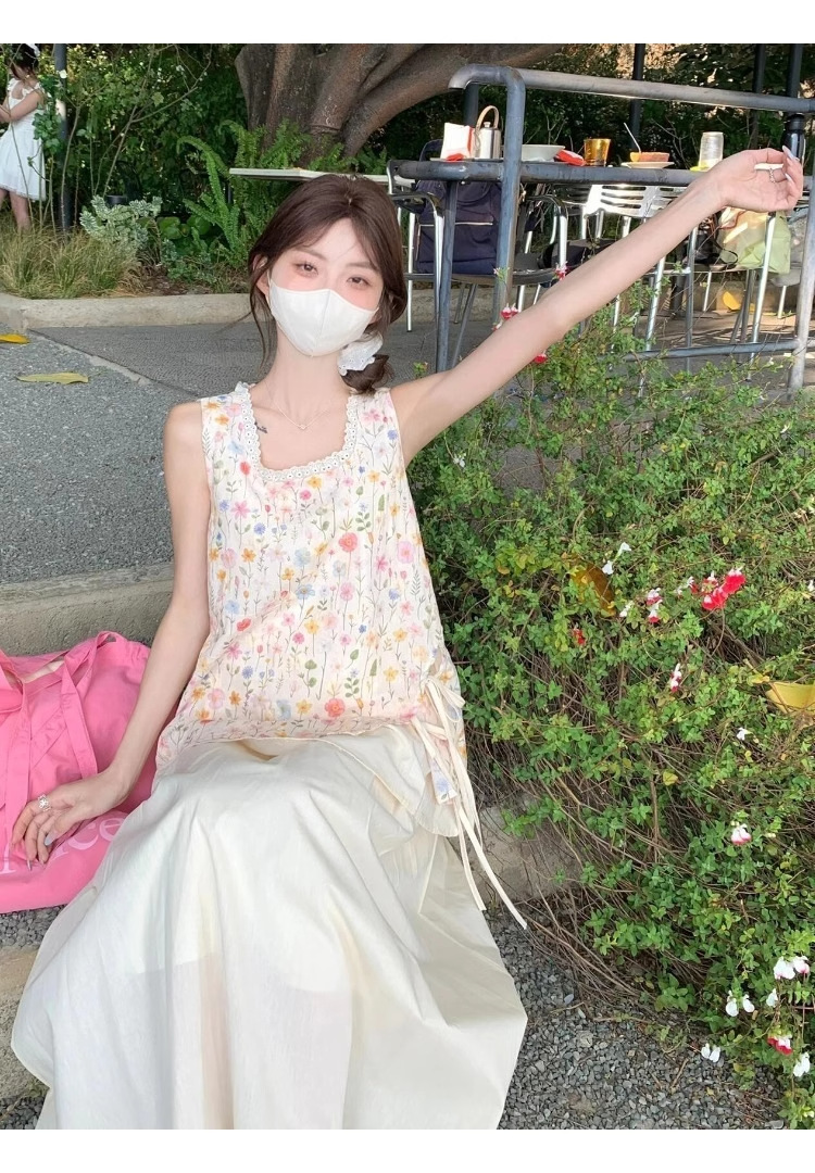 숲풍 중공업 플로럴 민소매 세트 여성 여름 신상 한국 스타일 달콤한 스커트 레이지 투피스 세트 소녀용