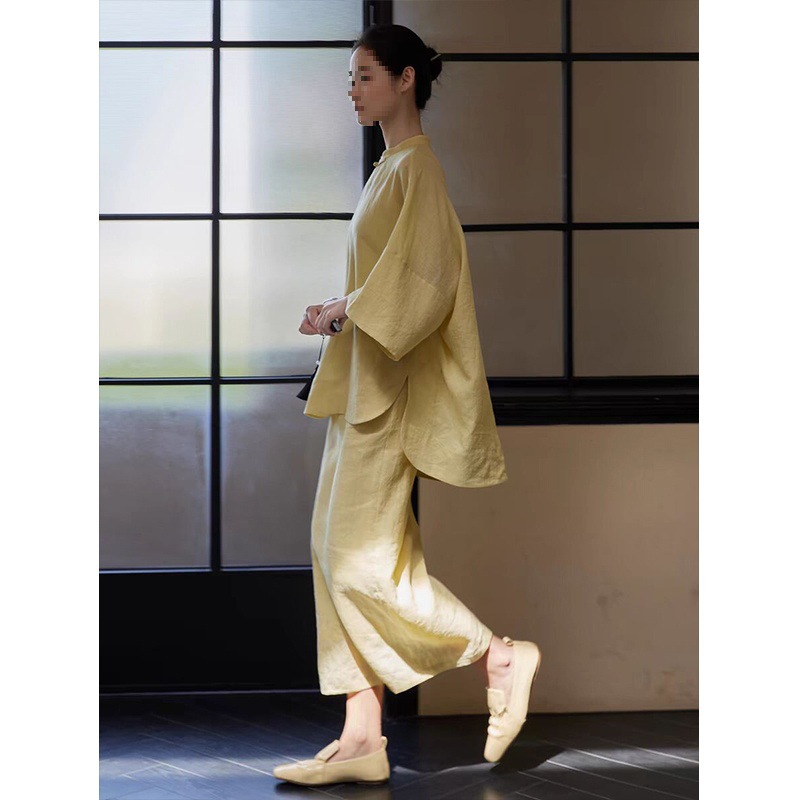 레트로 새로운 중국 스타일 원피스 여성의 여름 Guofeng Zen 차가운 느낌 버튼 7 점 슬리브 탑 스커트 투피스 세트