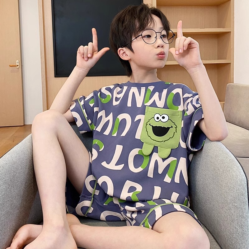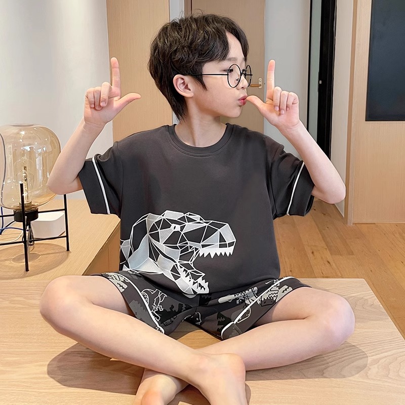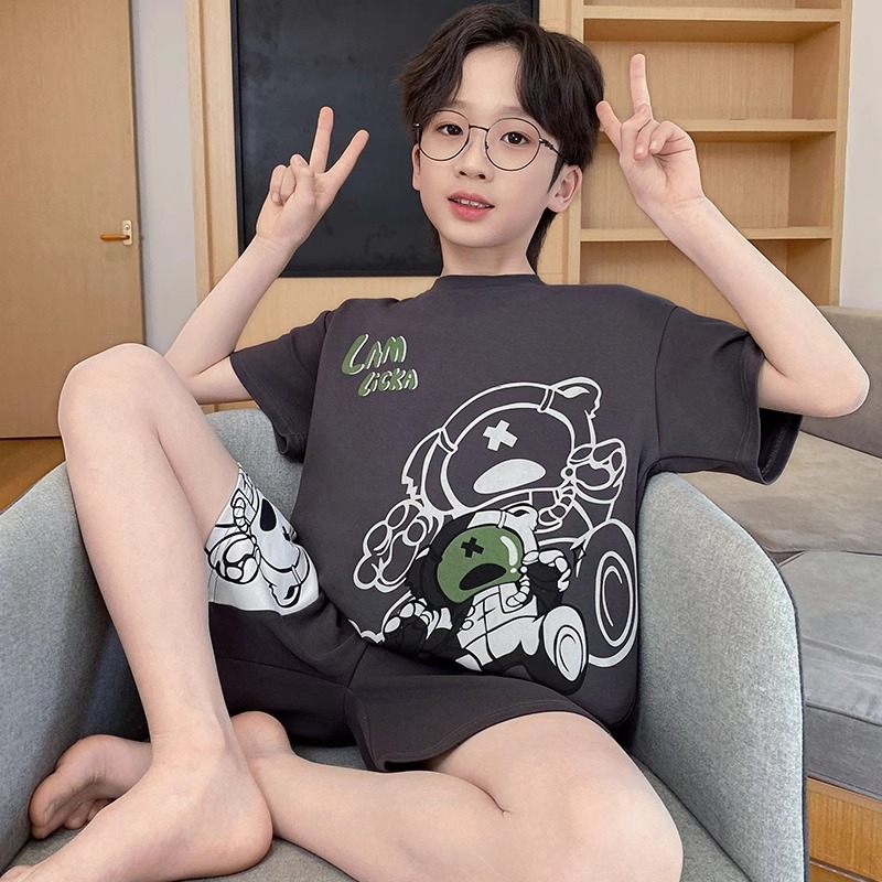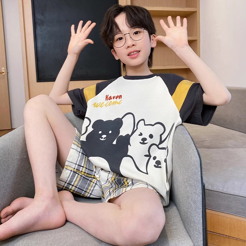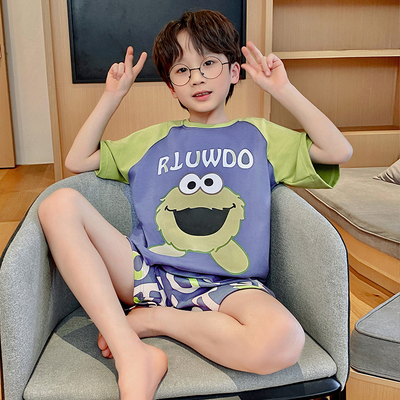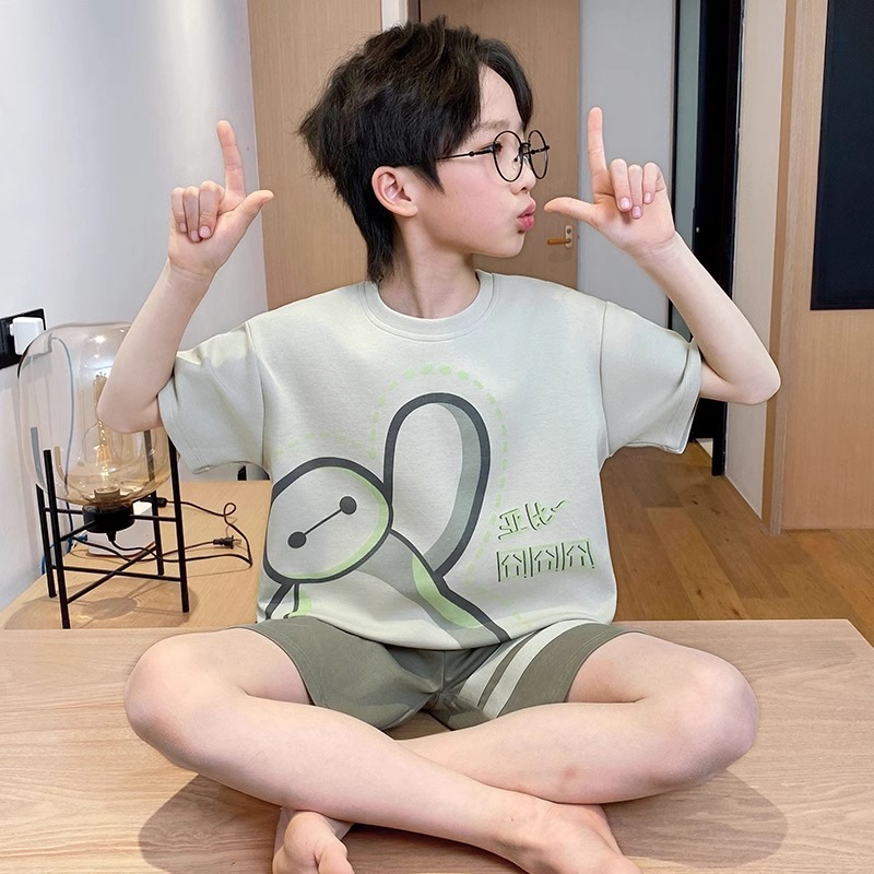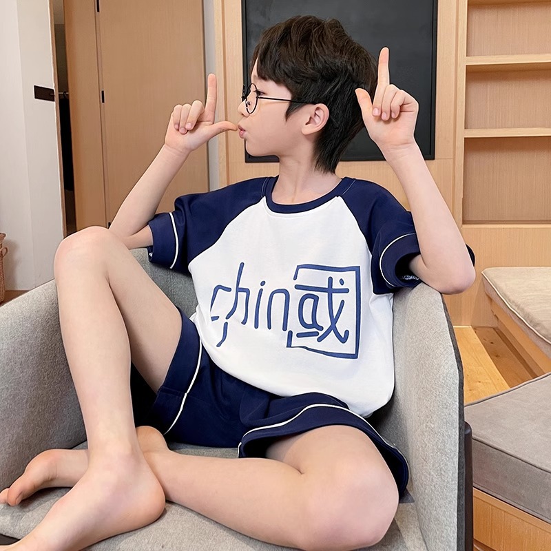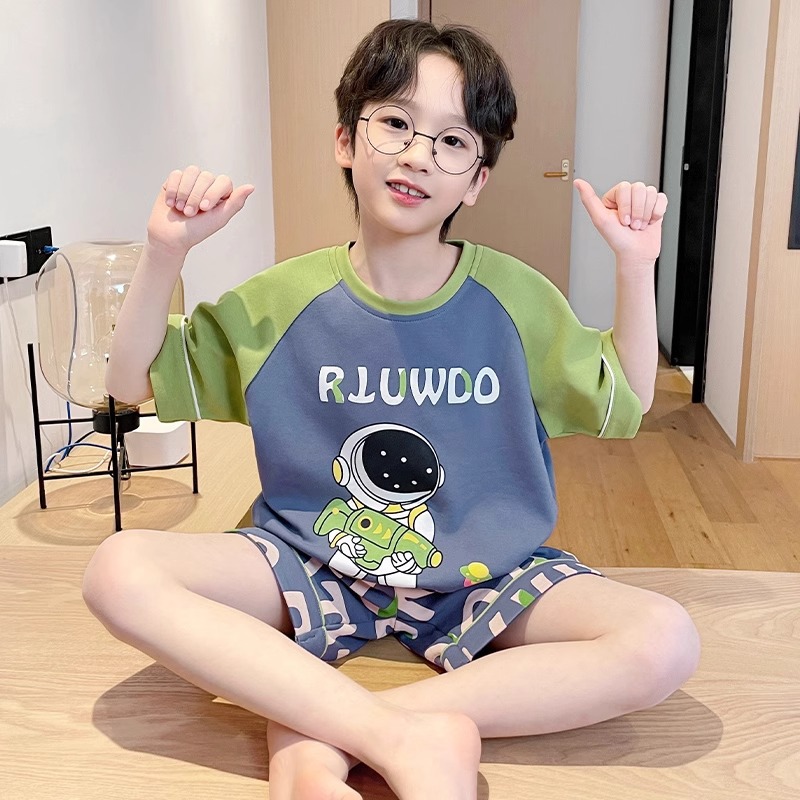 소년 잠옷 여름 순수 면화 얇은 반팔 반바지 2025 새로운 여름 스타일 어린이 소년 및 어린이 가정 의류스토어 가기