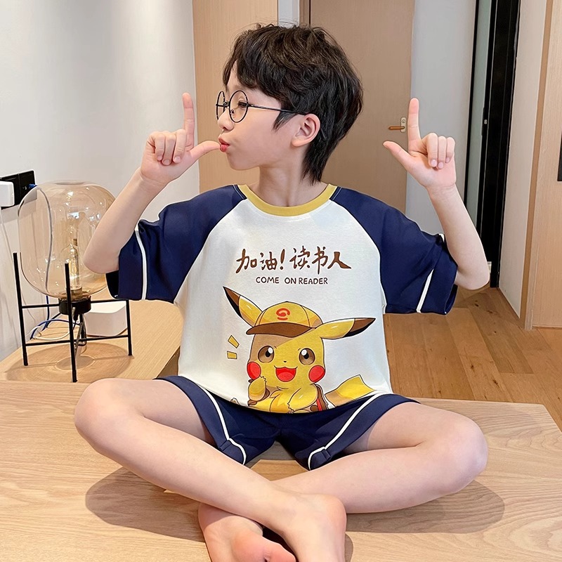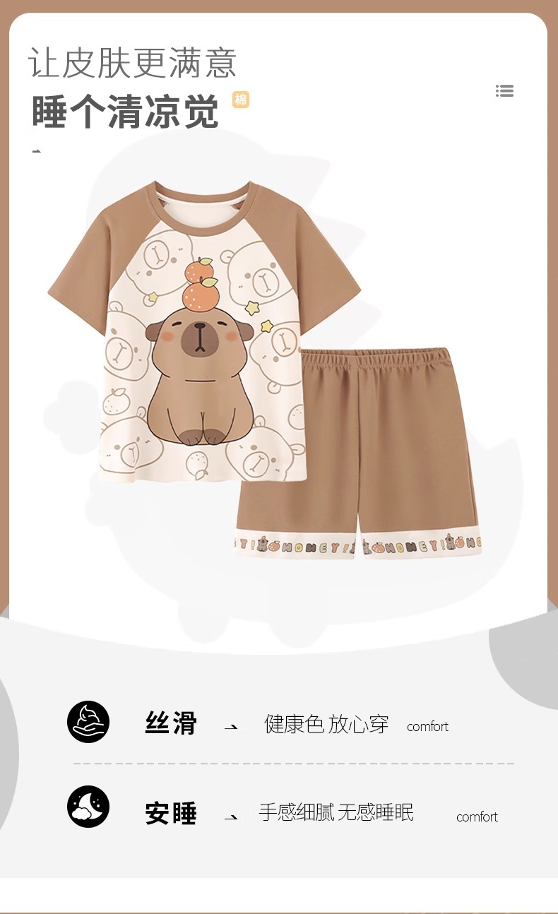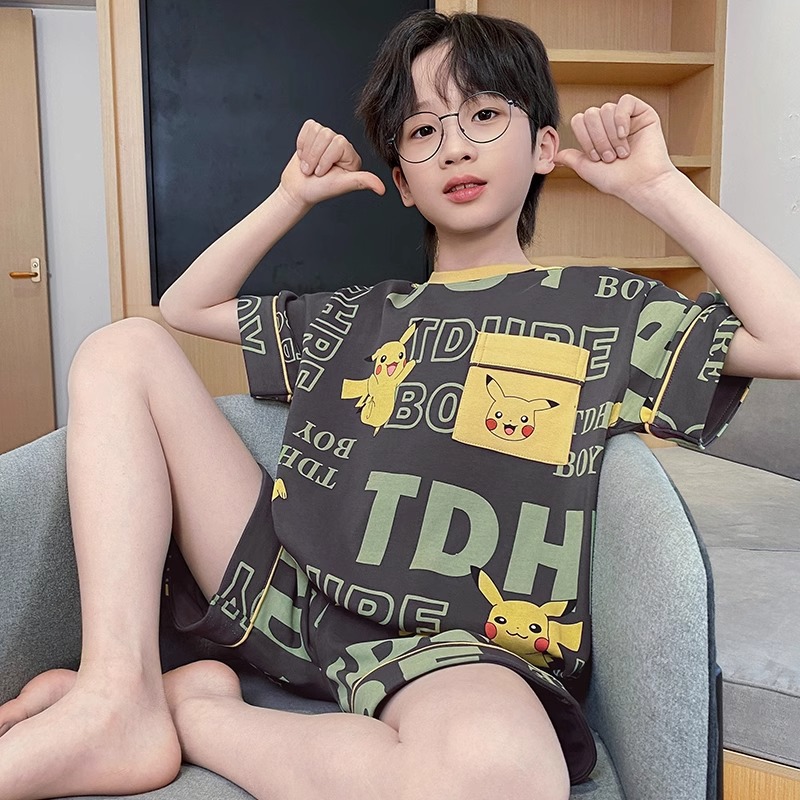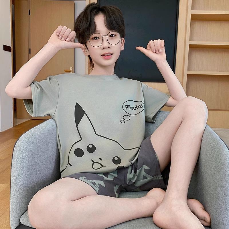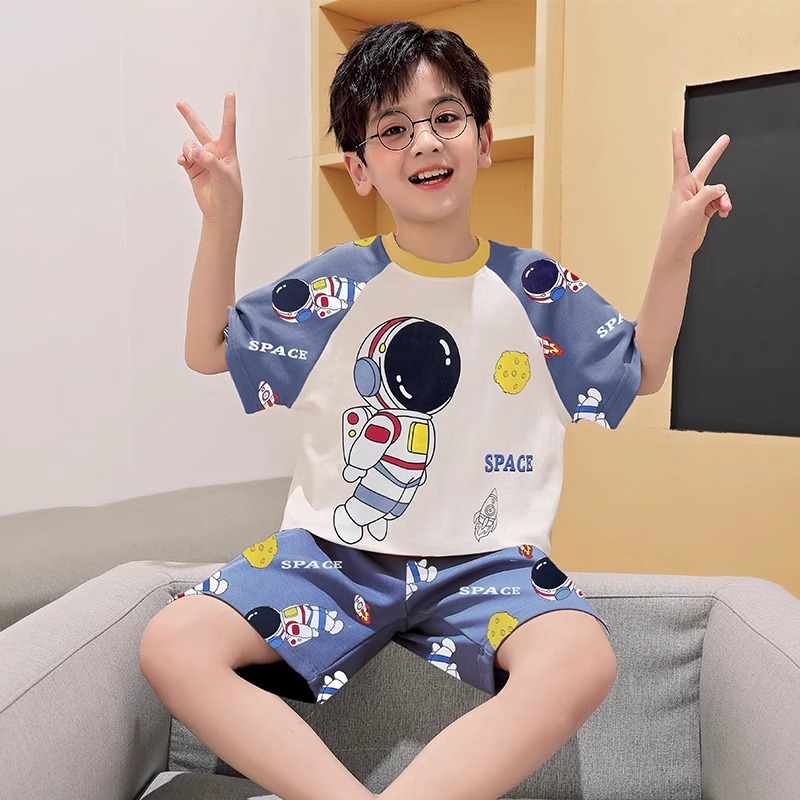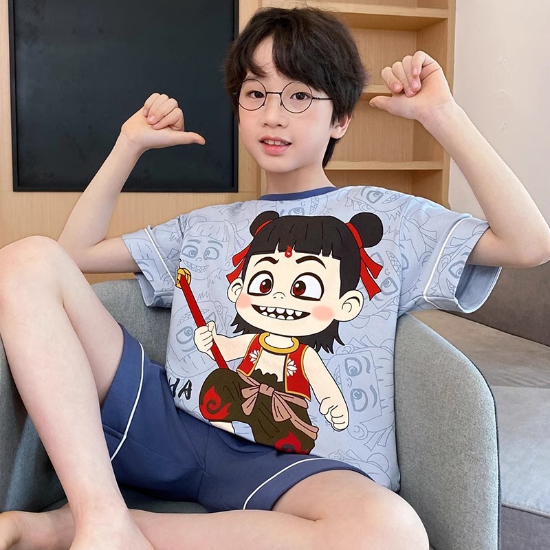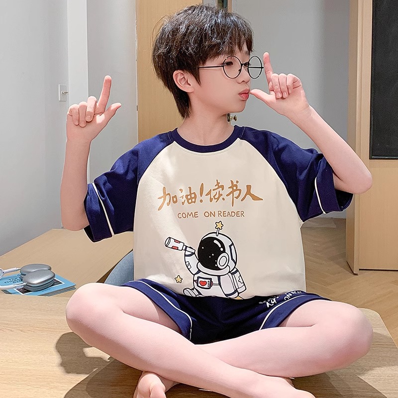 소년 잠옷 여름 순수 면화 얇은 반팔 반바지 2025 새로운 여름 스타일 어린이 소년 및 어린이 가정 의류스토어 가기