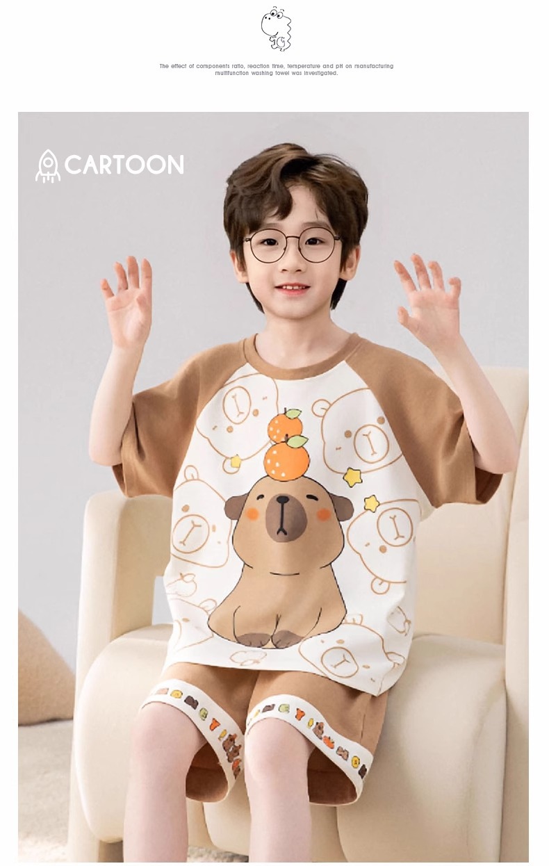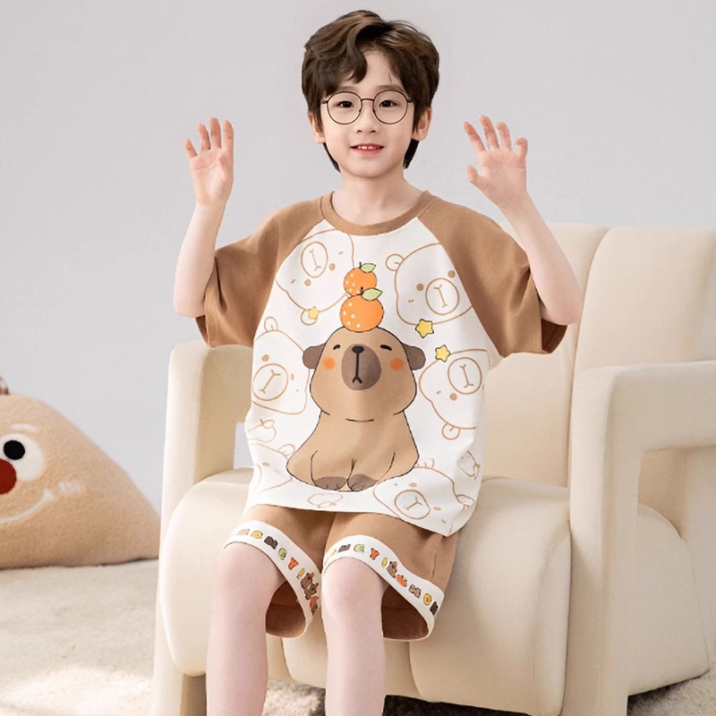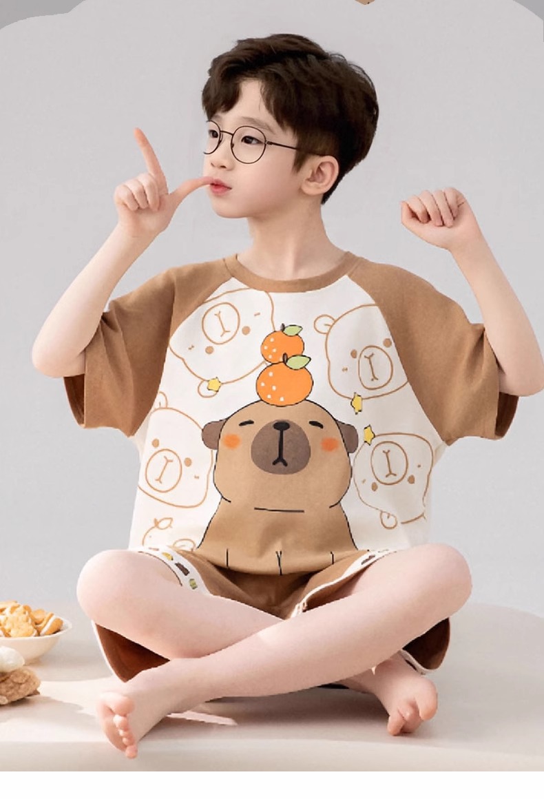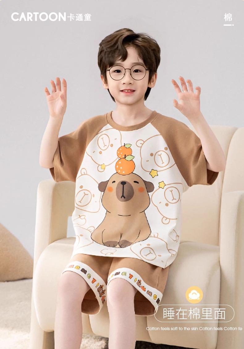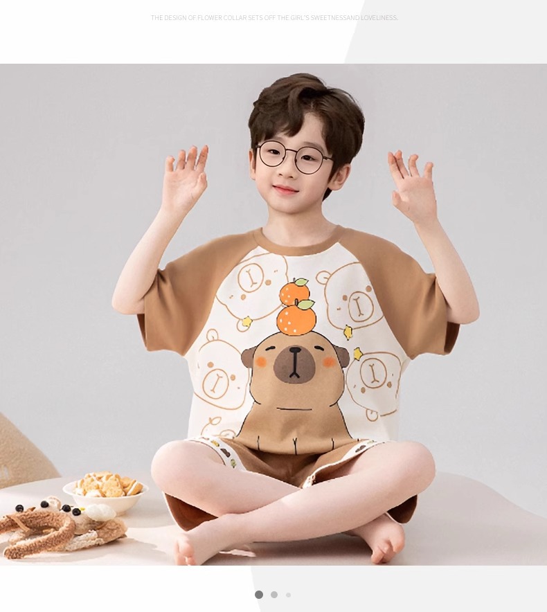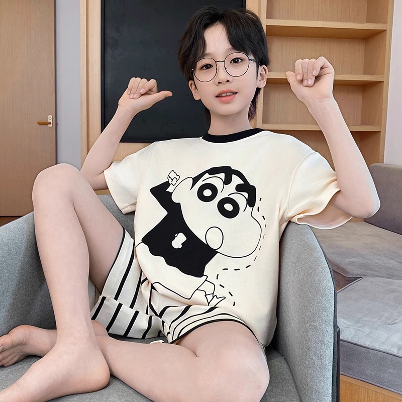 소년 잠옷 여름 순수 면화 얇은 반팔 반바지 2025 새로운 여름 스타일 어린이 소년 및 어린이 가정 의류스토어 가기