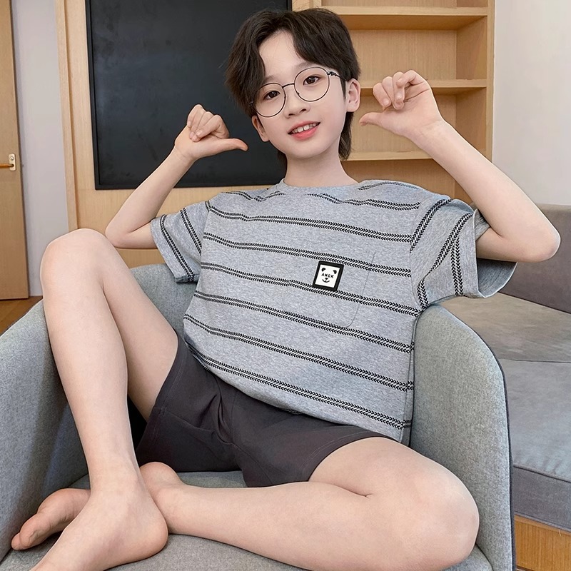 소년 잠옷 여름 순수 면화 얇은 반팔 반바지 2025 새로운 여름 스타일 어린이 소년 및 어린이 가정 의류