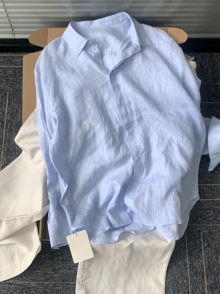 프랑스 블루 리넨 셔츠 여성의 여름 얇은 느슨한 오래 된 돈 바람 리넨 셔츠 긴 소매 선 스크린 면 리넨 탑스토어 가기
