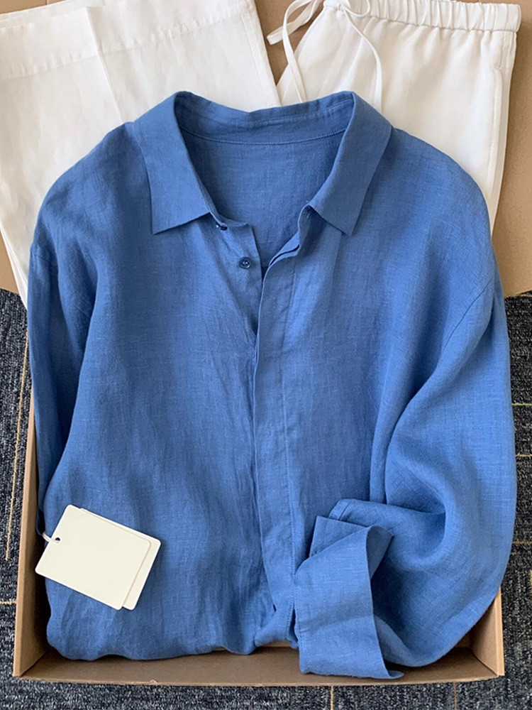 프랑스 블루 리넨 셔츠 여성의 여름 얇은 느슨한 오래 된 돈 바람 리넨 셔츠 긴 소매 선 스크린 면 리넨 탑