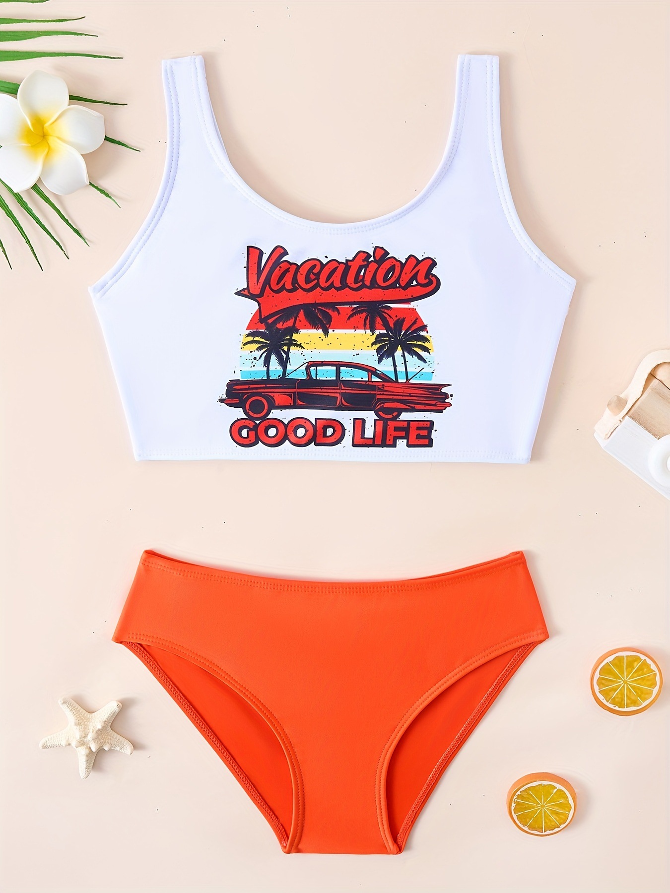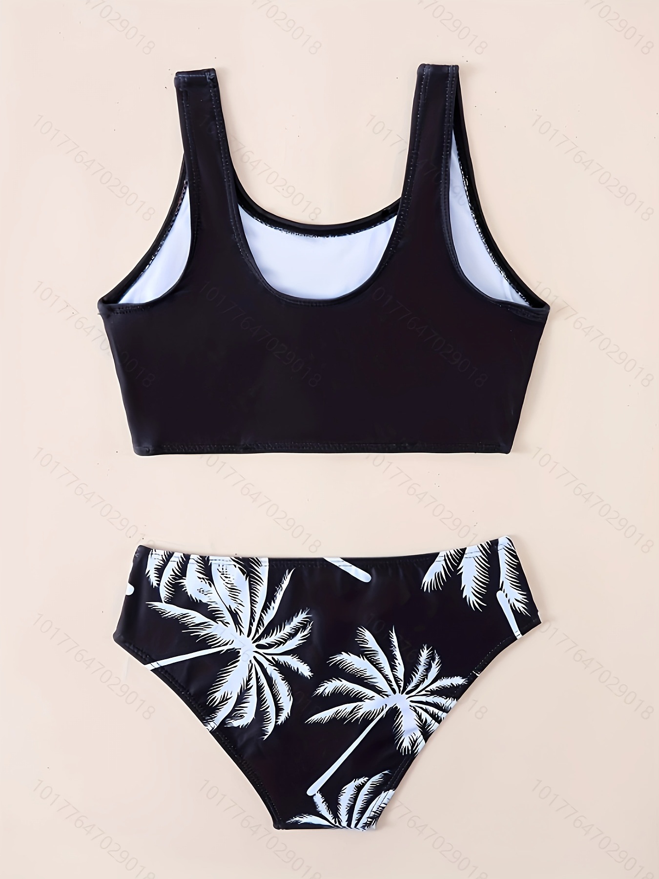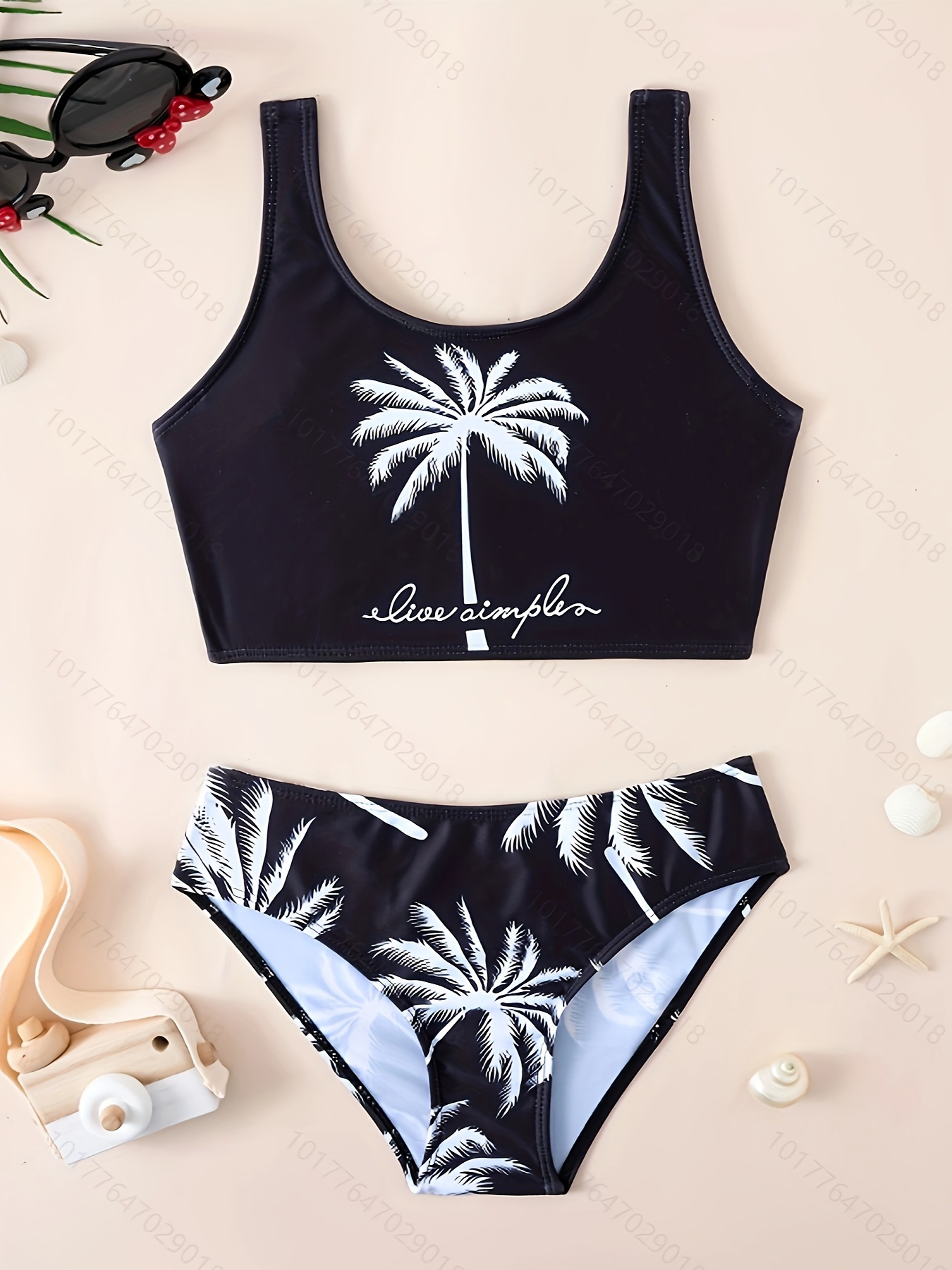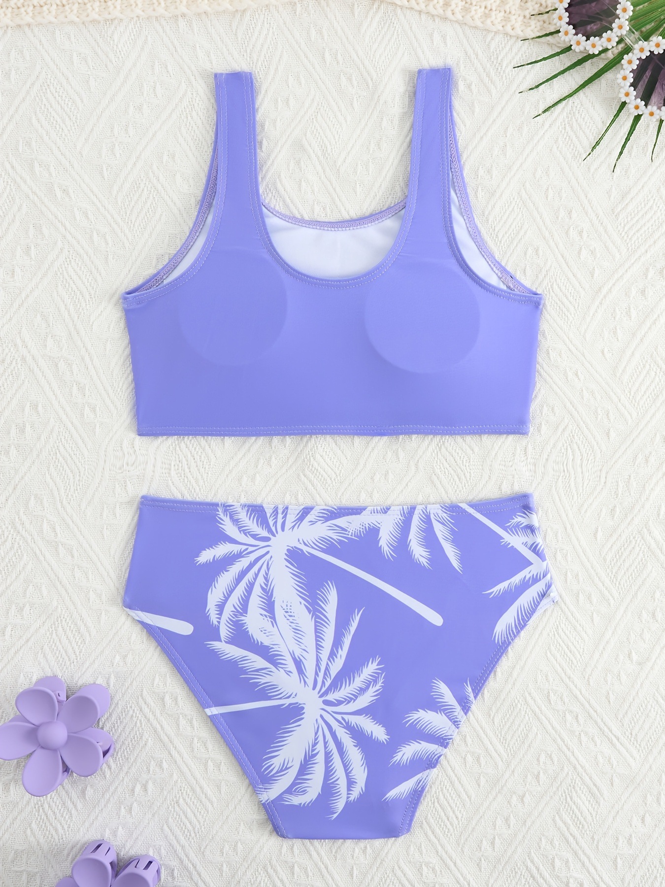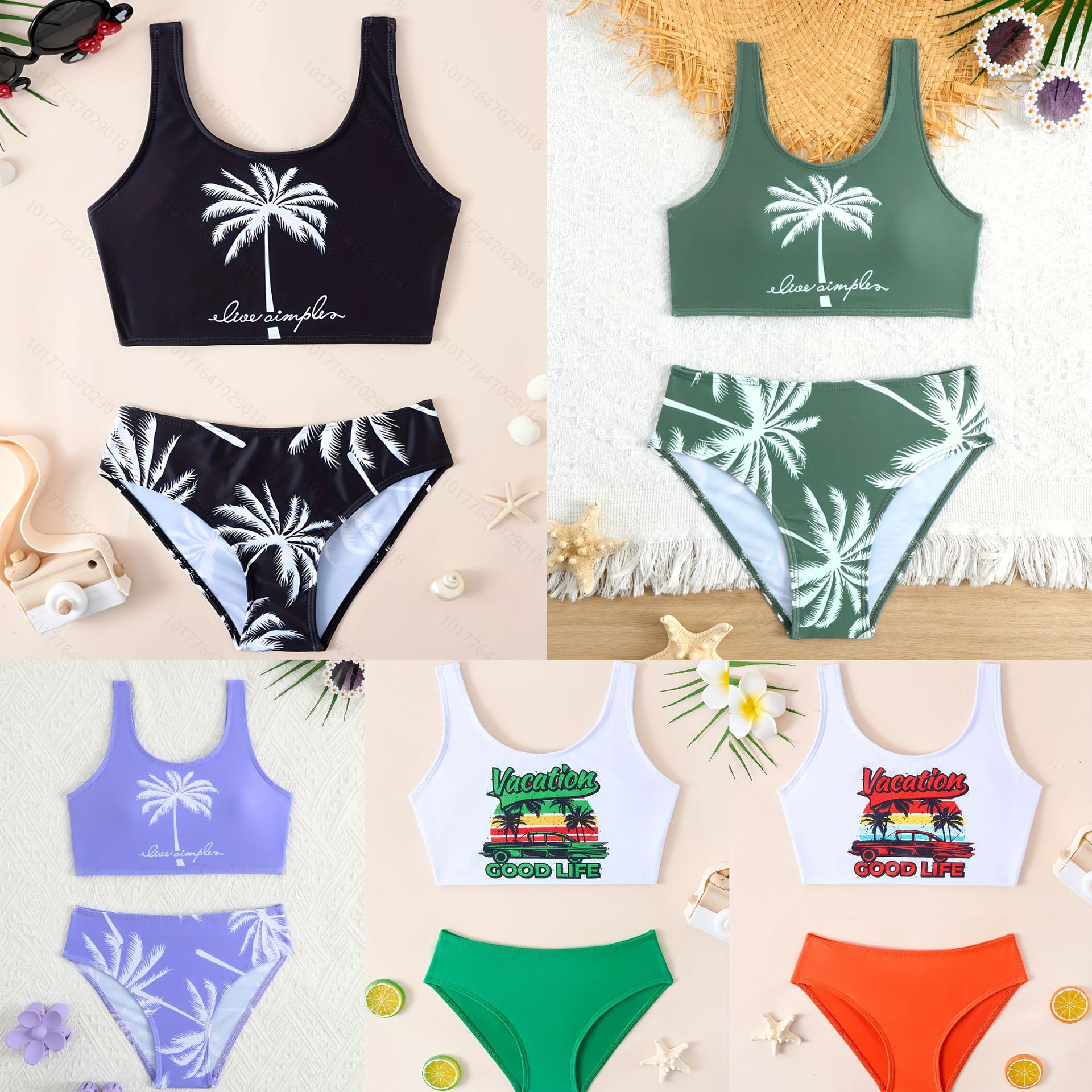 2025 유럽 및 미국 아동용 수영복, 여아용 열대 프린트 스포츠 스타일 분리형 비키니, 배를 가려주는 슬리밍 효과, 중대형 아동용 수영복, 만화 디자인