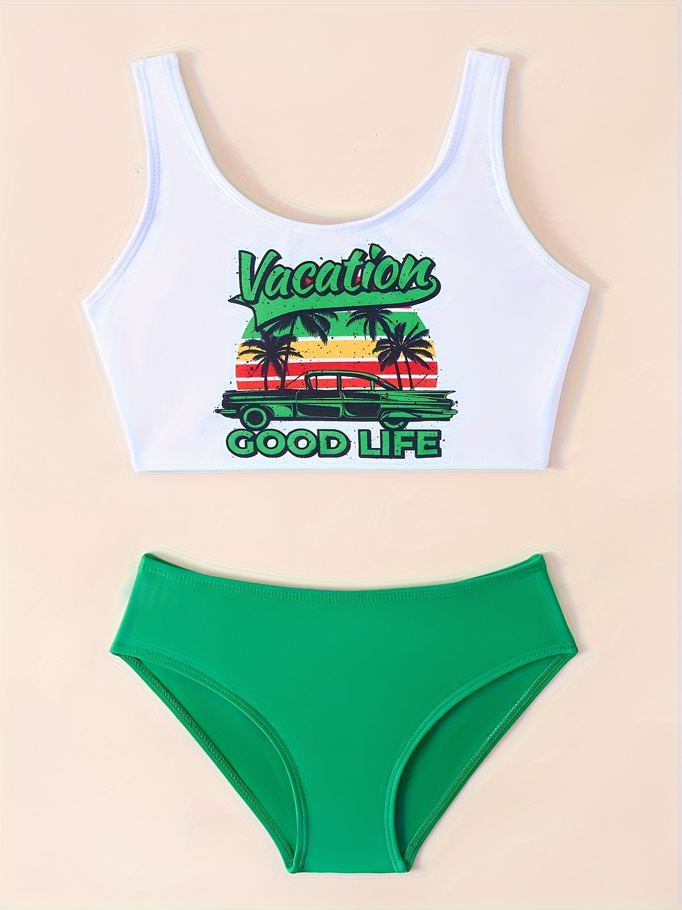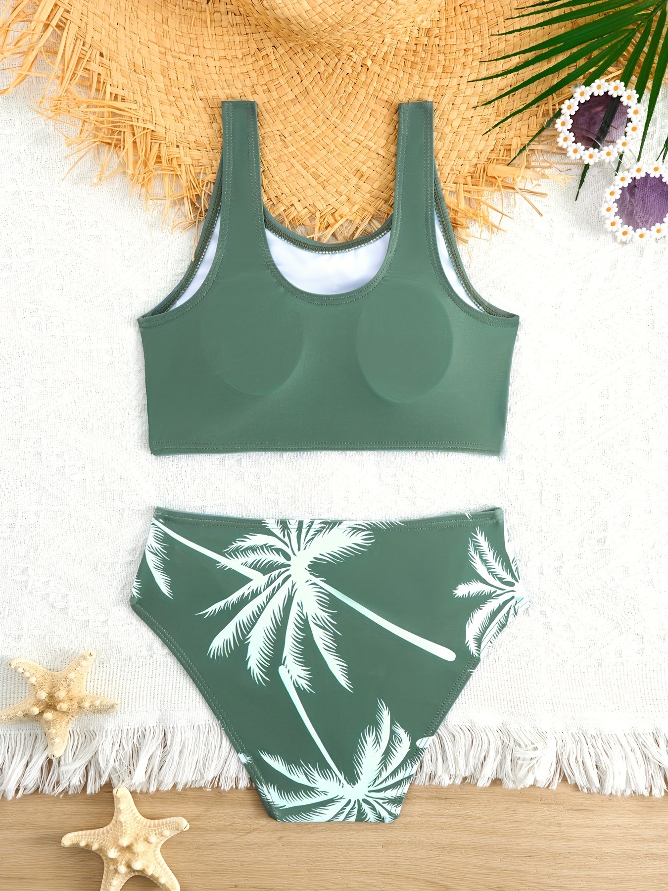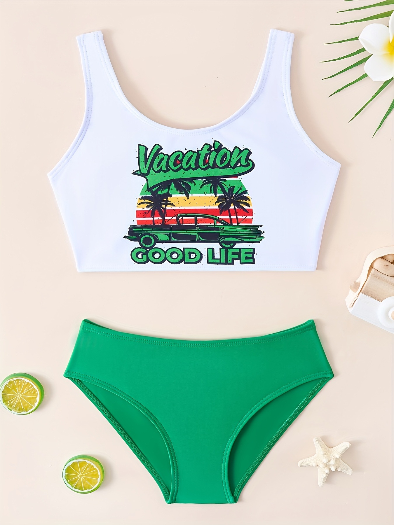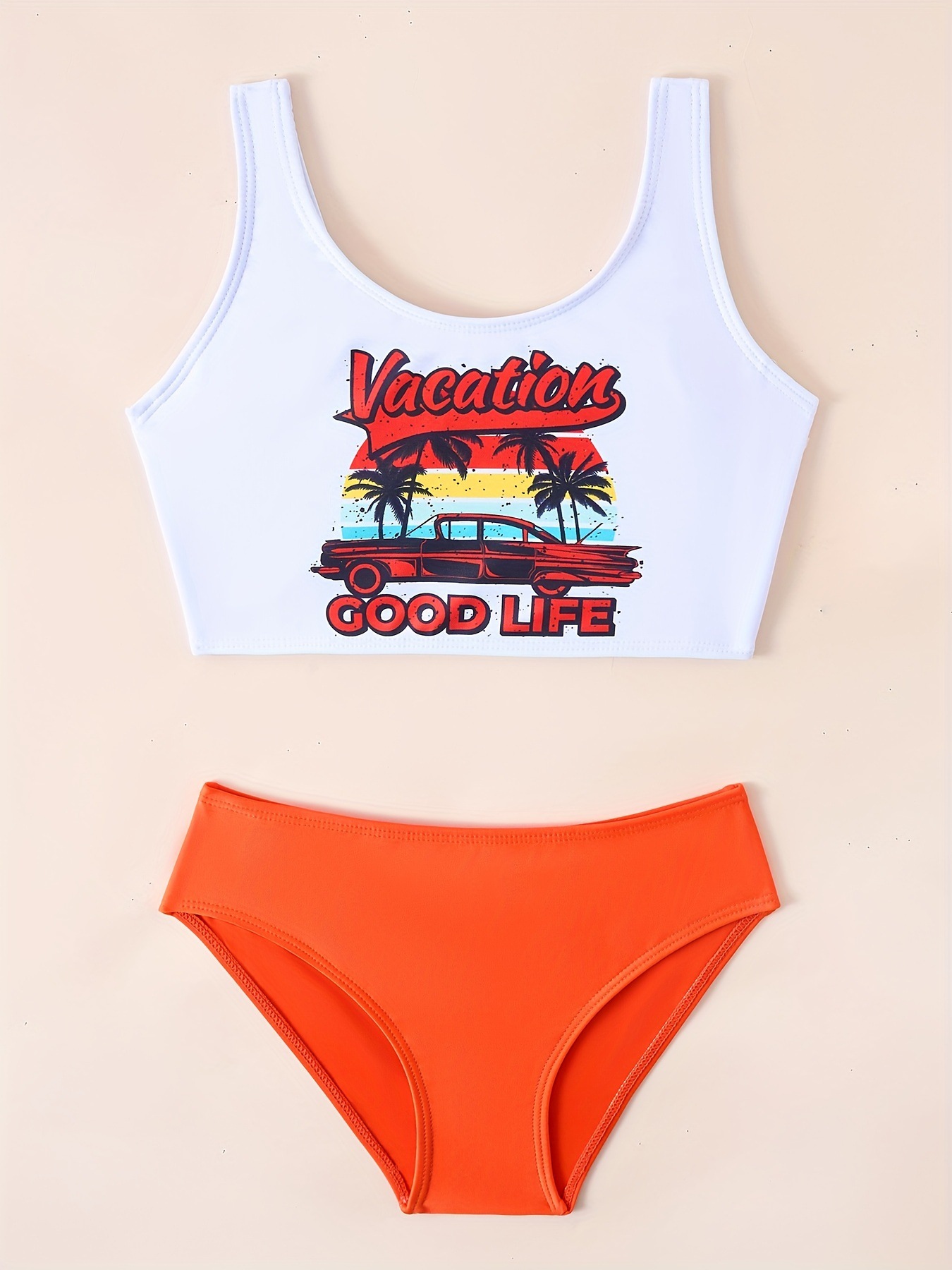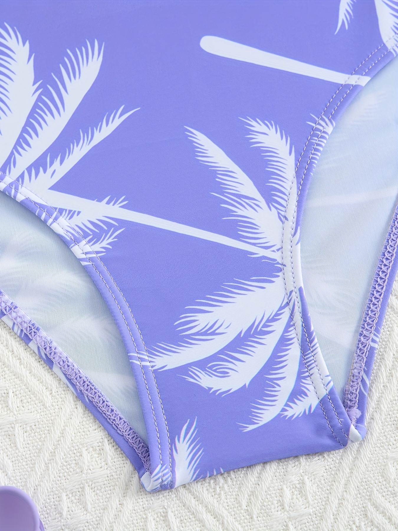 2025 유럽 및 미국 아동용 수영복, 여아용 열대 프린트 스포츠 스타일 분리형 비키니, 배를 가려주는 슬리밍 효과, 중대형 아동용 수영복, 만화 디자인