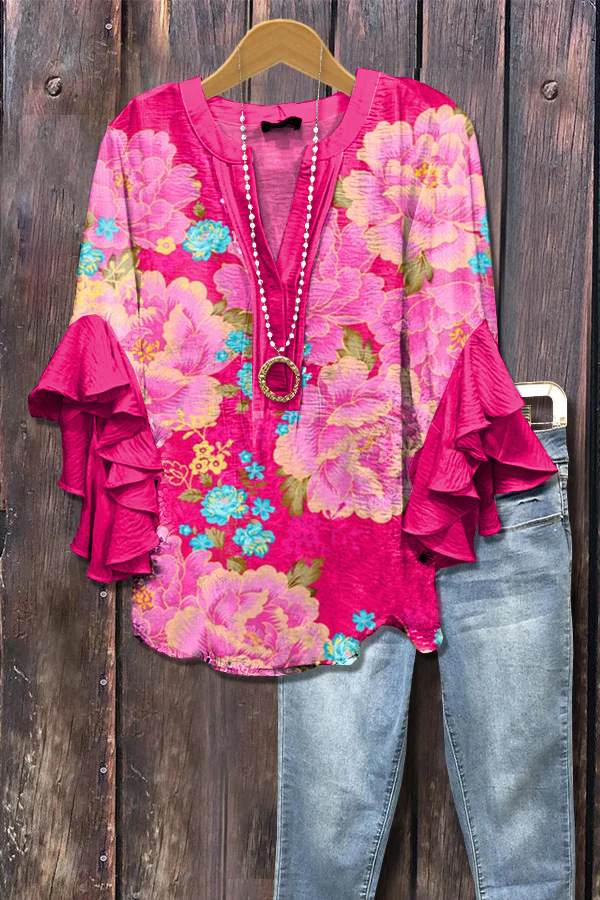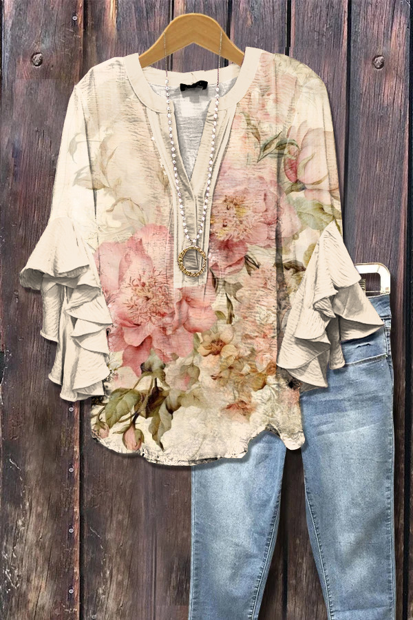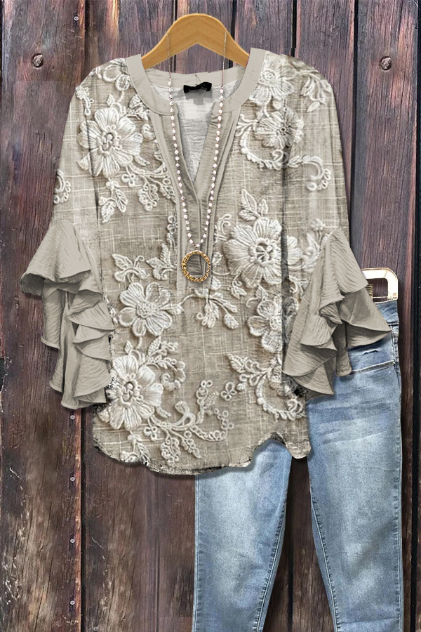유럽과 미국의 새로운 크로스보더 크리에이티브 데님 플로럴 프린트 독립 스테이션 캐주얼 트렌디 브이넥 연꽃 슬리브 티셔츠 여성 의류스토어 가기