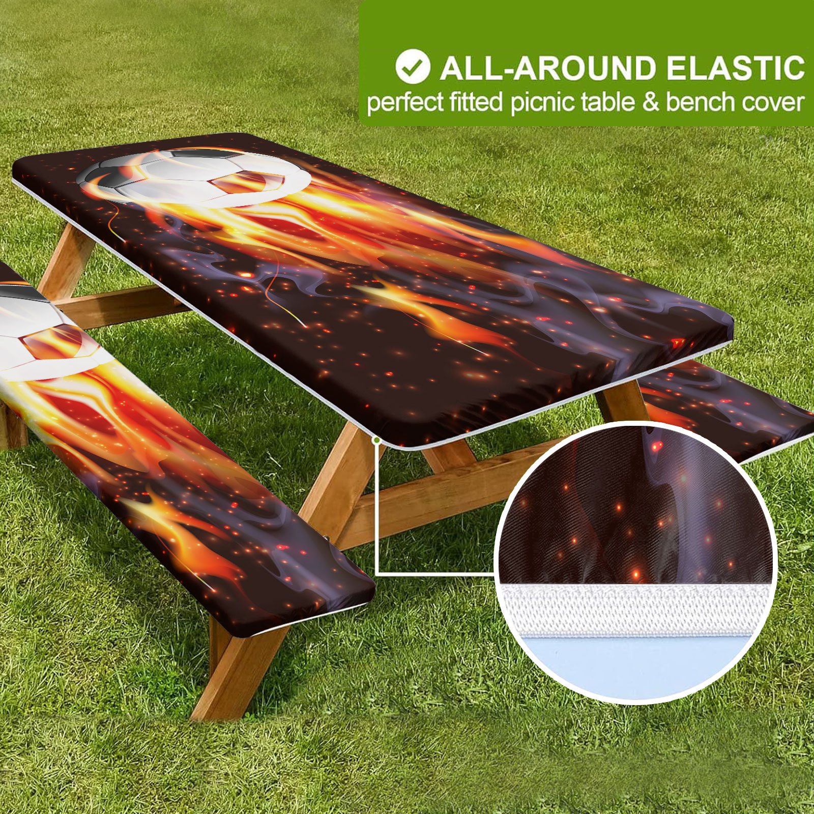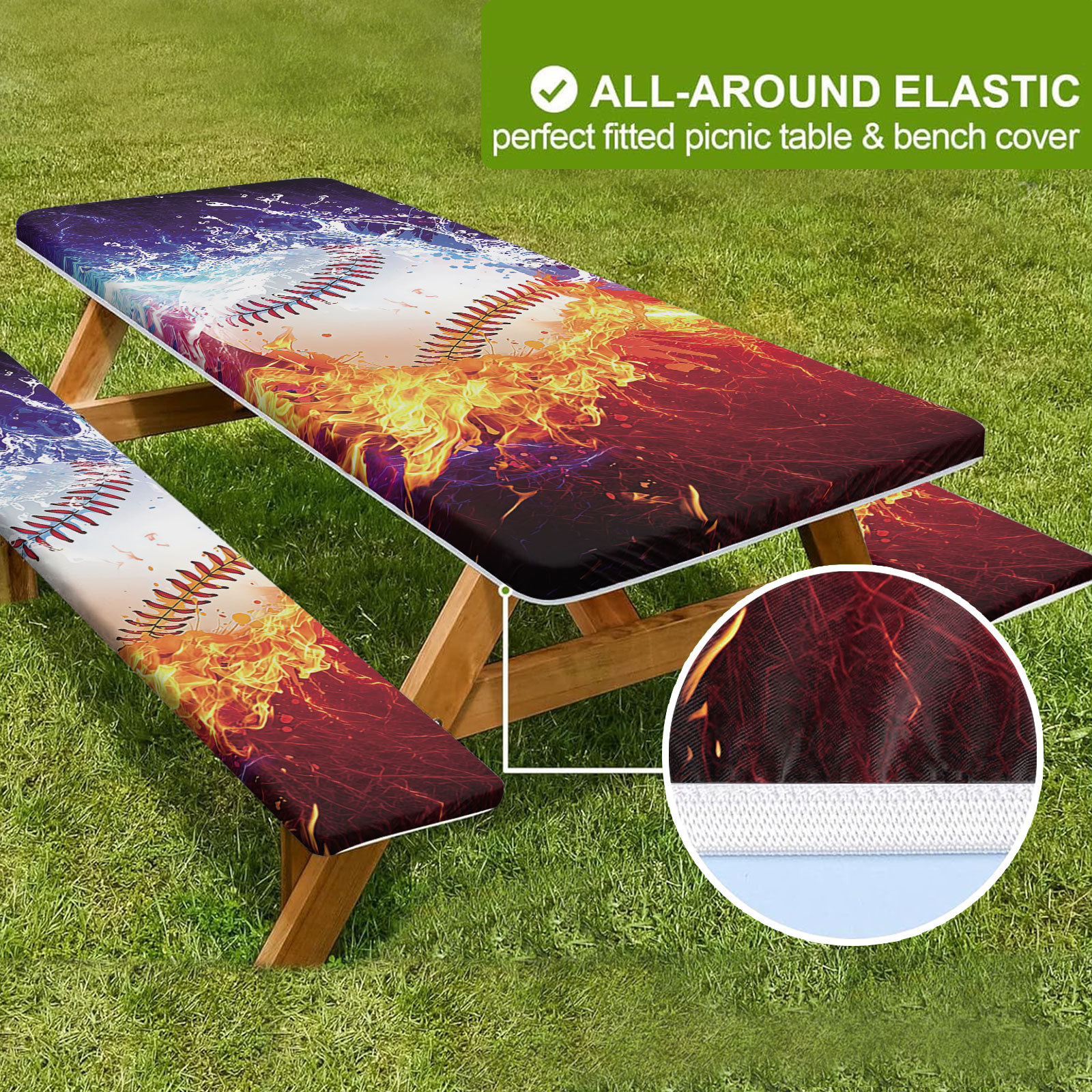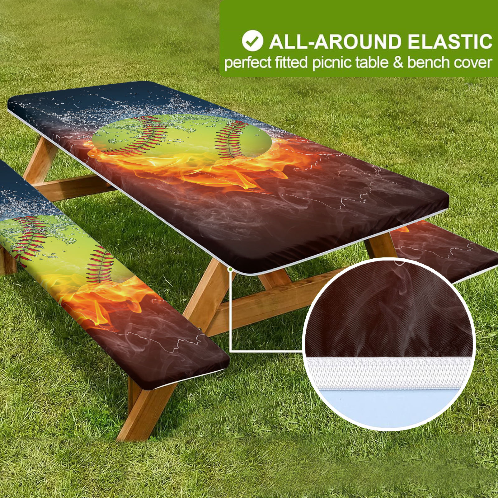 야외 방풍 및 방진 식탁보 커버, 볼 스타일 피크닉 테이블 커버, 긴 의자 커버 포함, 3피스 세트, 신축성 있는 핏