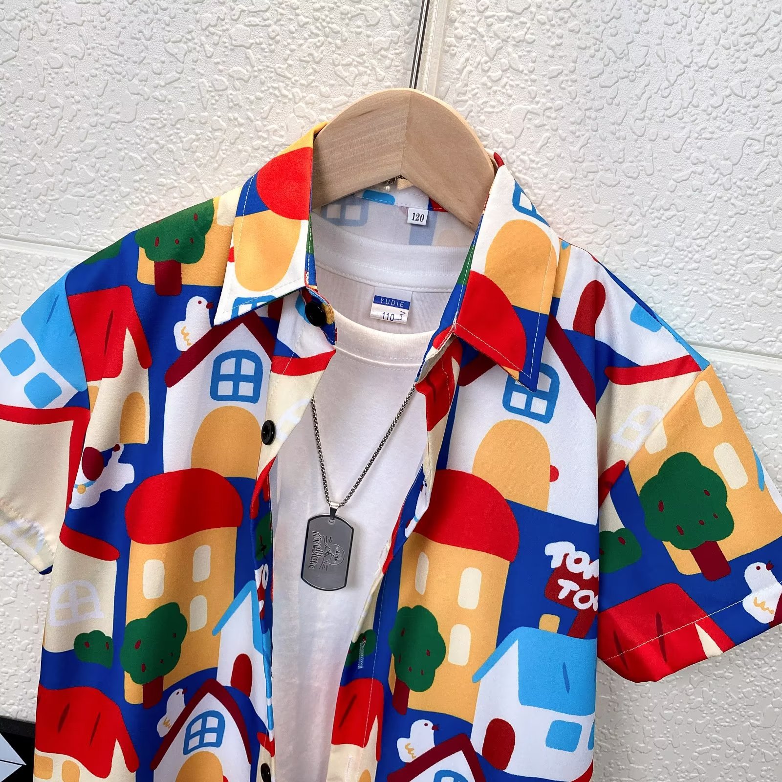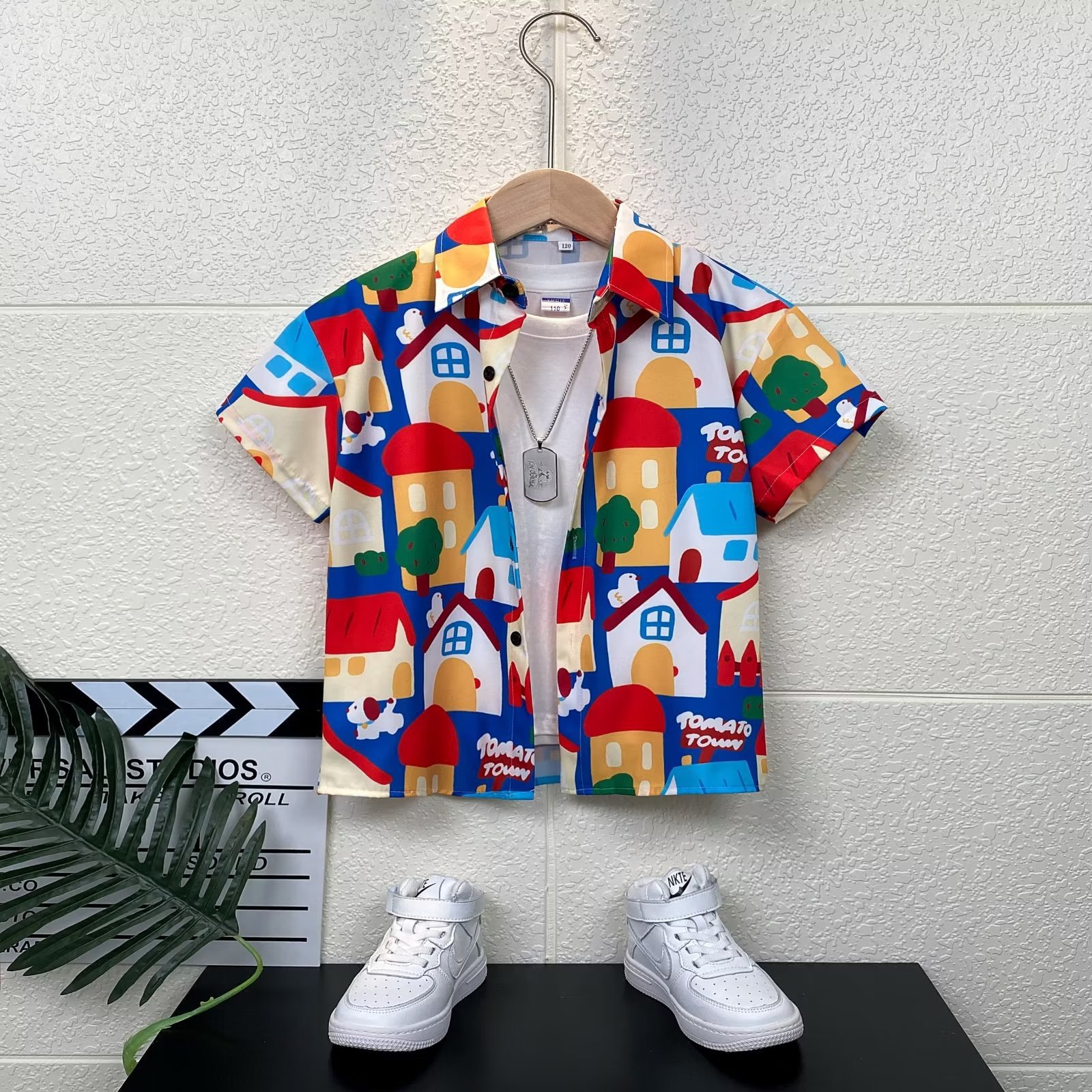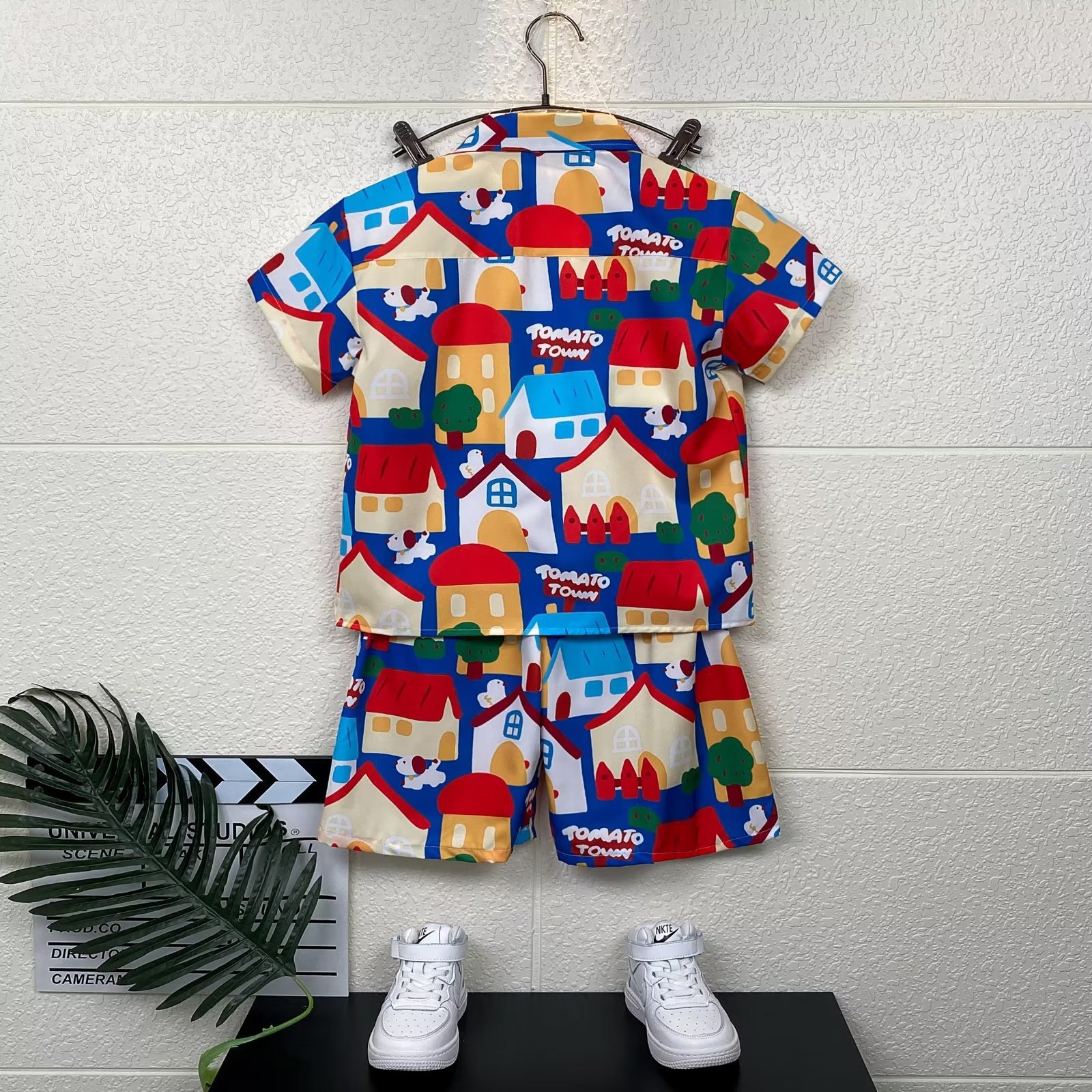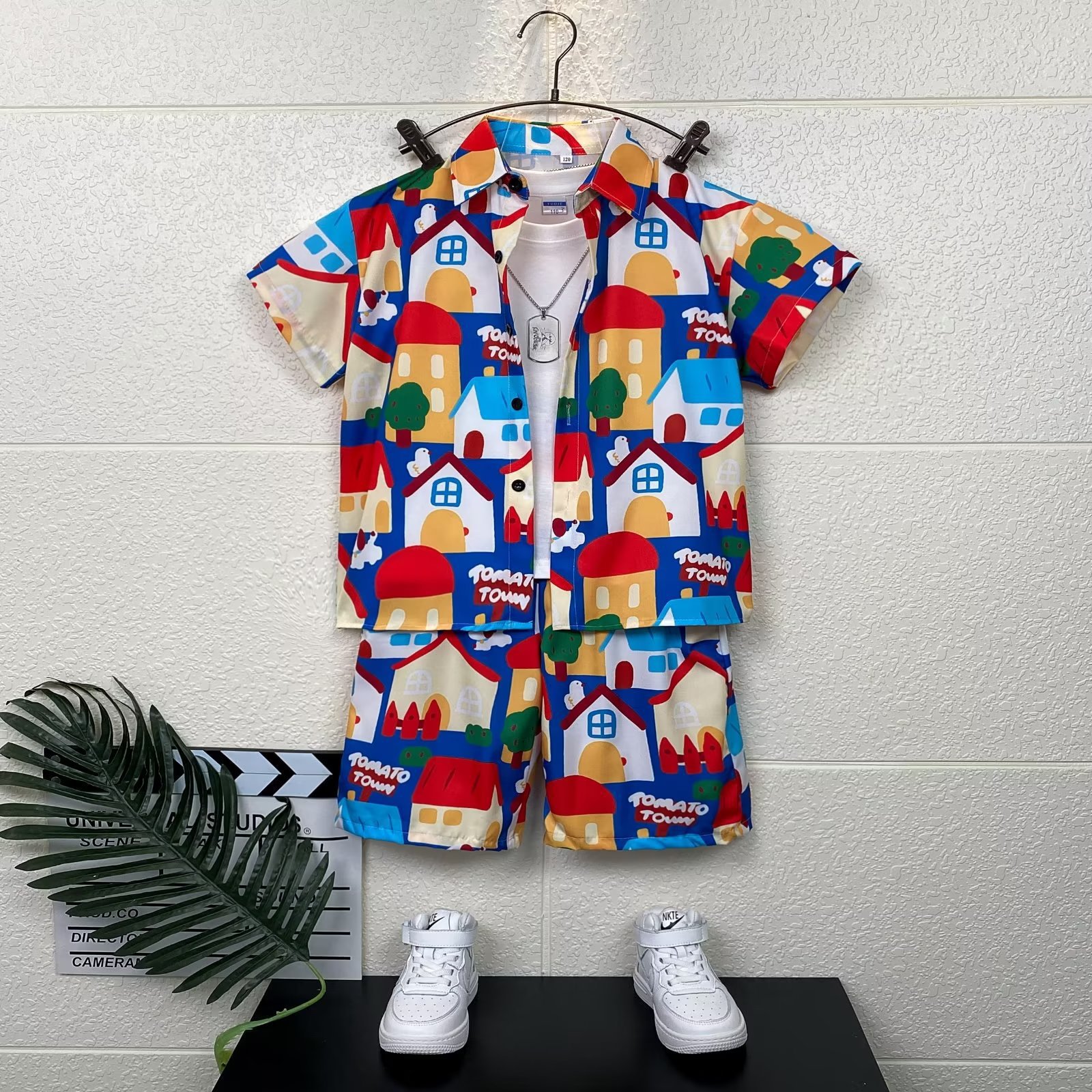 소년 얼음 실크 셔츠 정장 2023 여름 새 아기 가볍고 통기성 옷 어린이 잘 생긴 투피스 유행 세트스토어 가기
