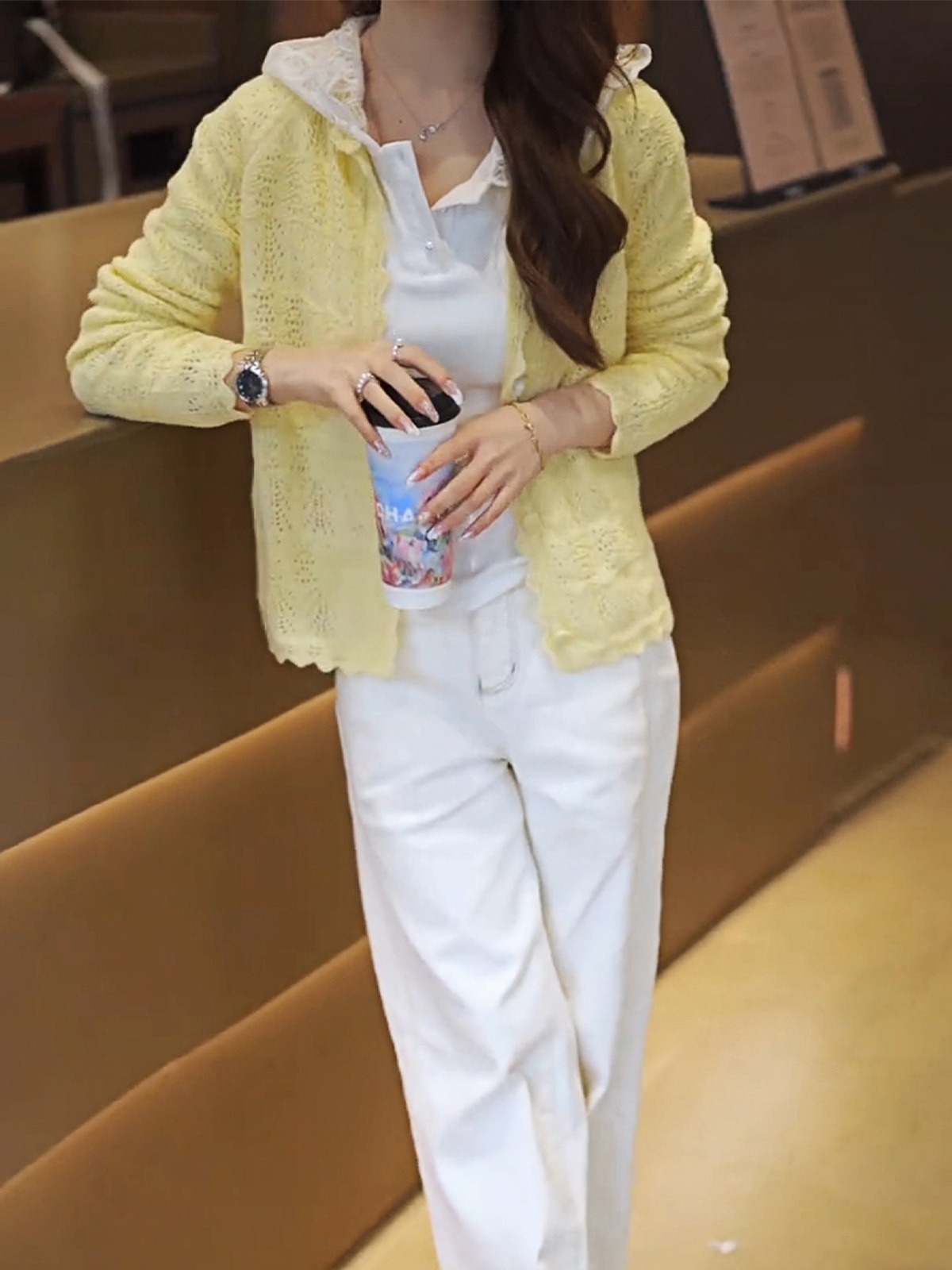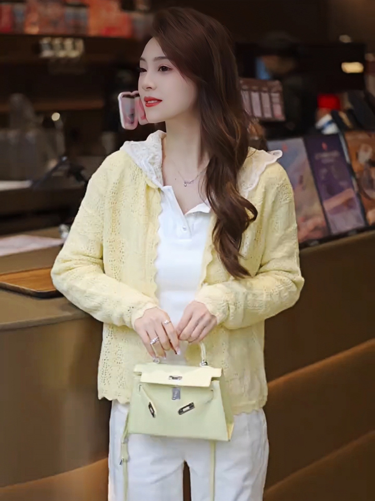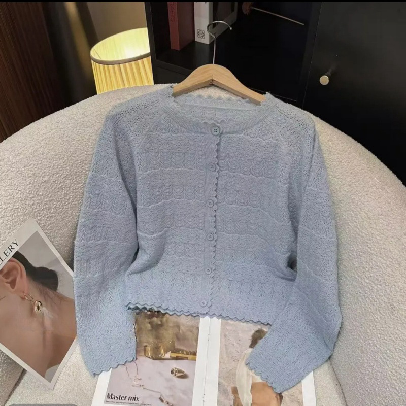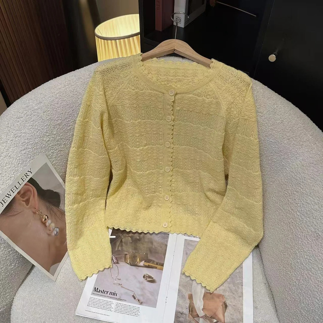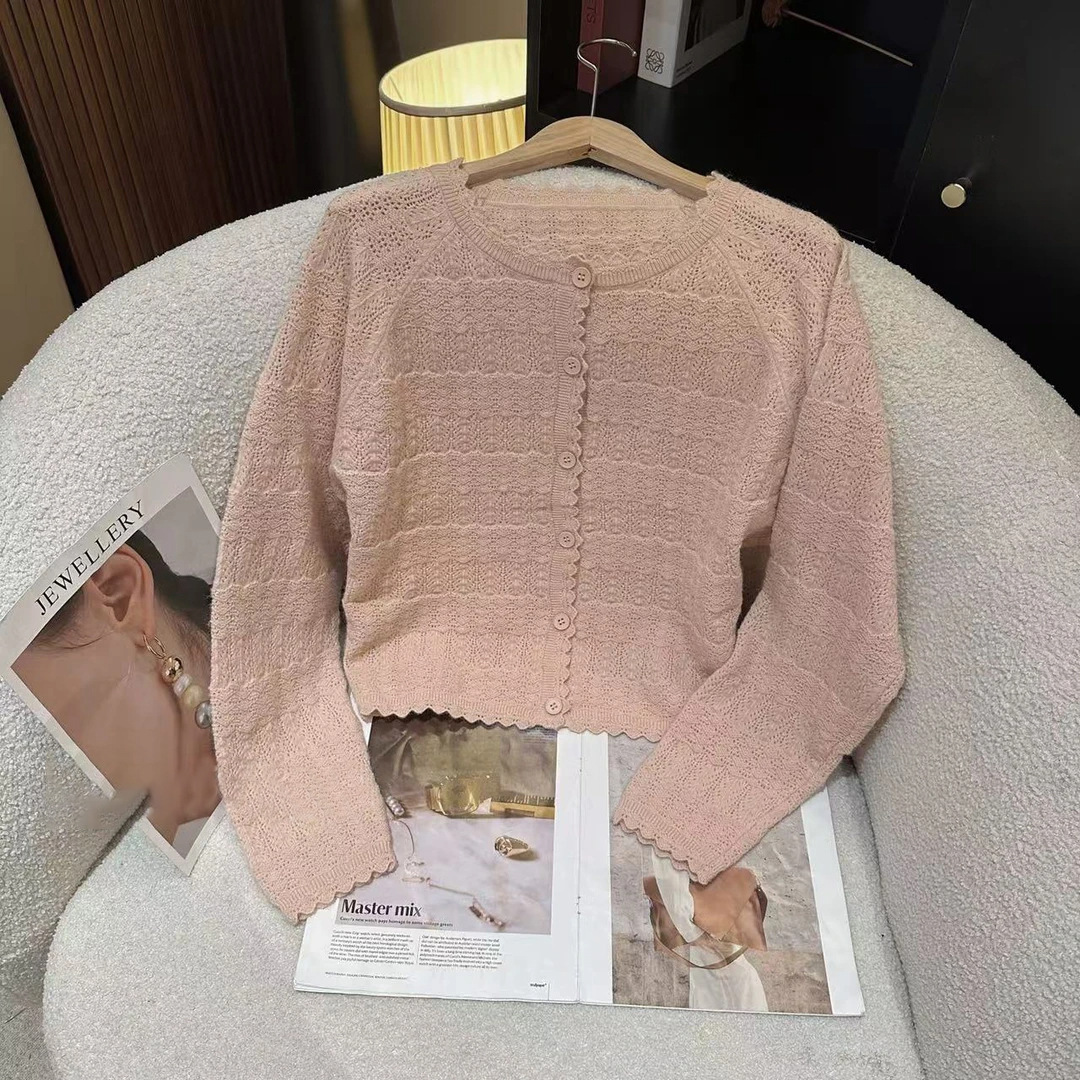 한국어 버전 2025 여름 중공 레이스 심플 스타일 솔리드 컬러 캔디 컬러 스웨터 여성 슬림 카디건 탑스토어 가기