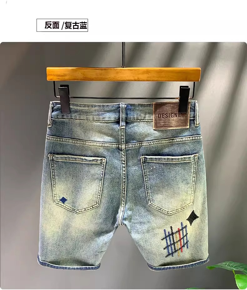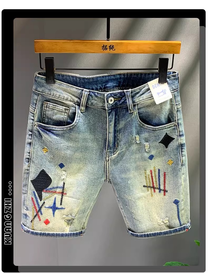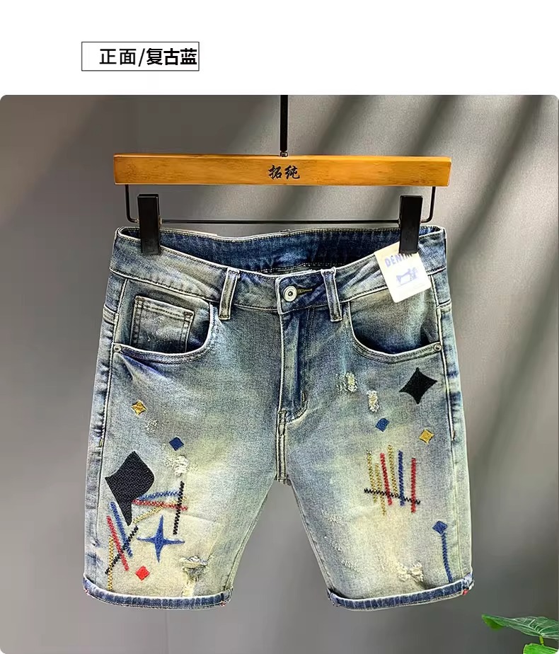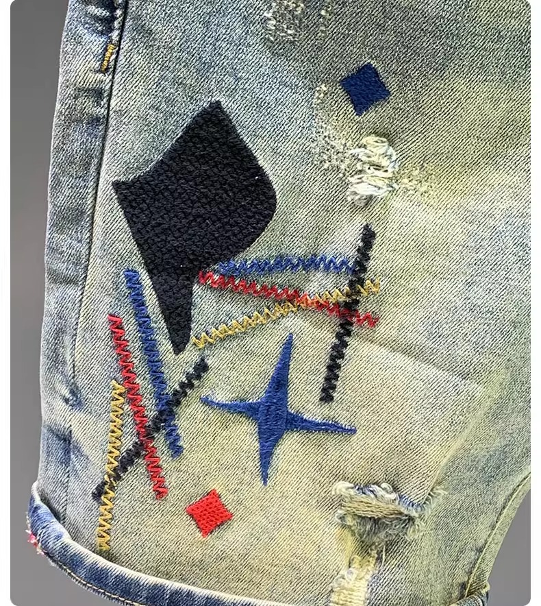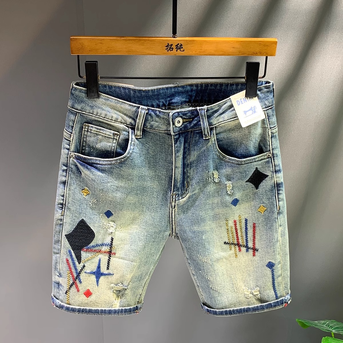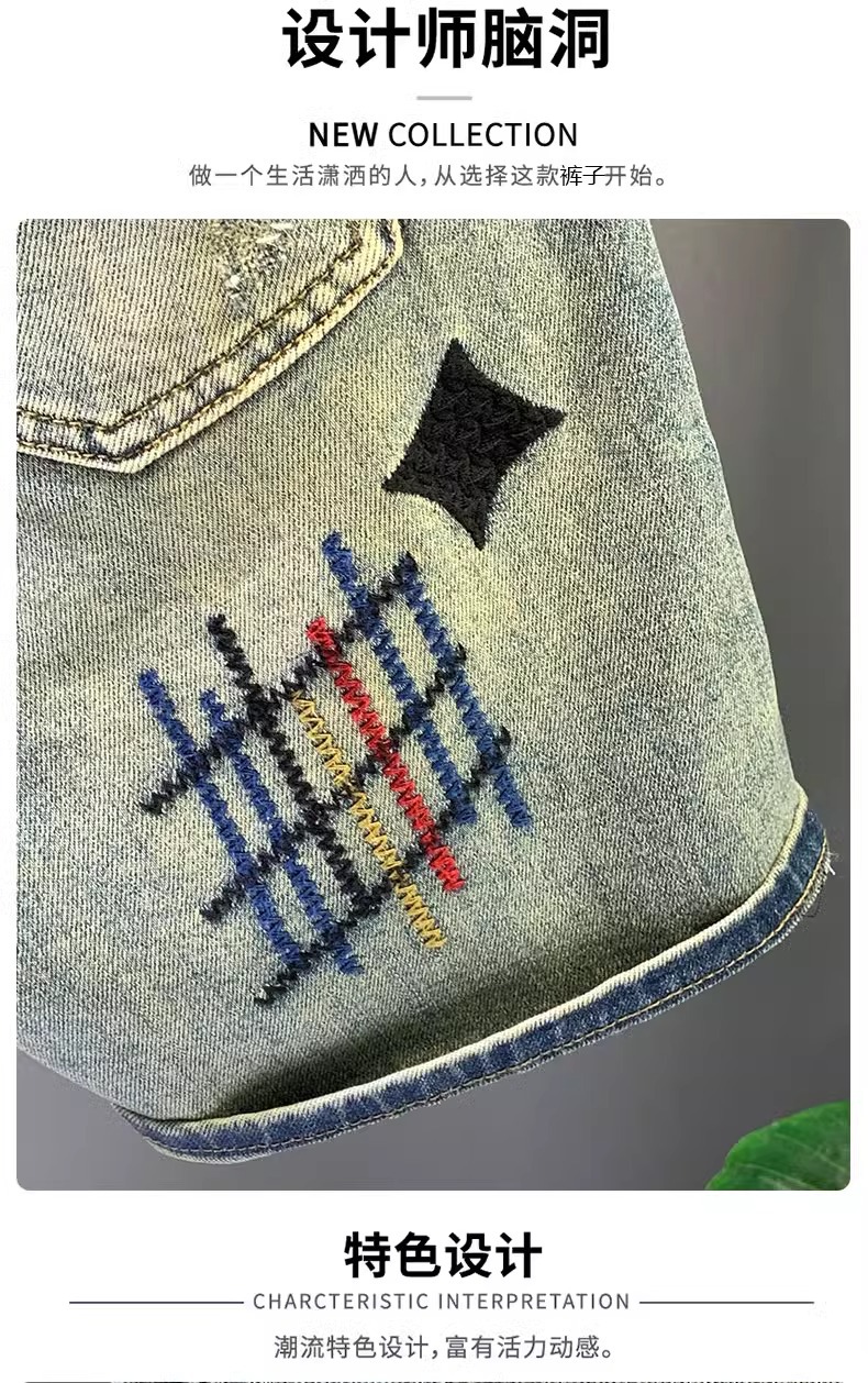 여름 패션 트렌드 자수 스크래치 및 찢어진 패치 데님 반바지 남성용 다용도 맞춤형 5부 스트레이트 팬츠 트렌디스토어 가기