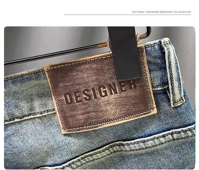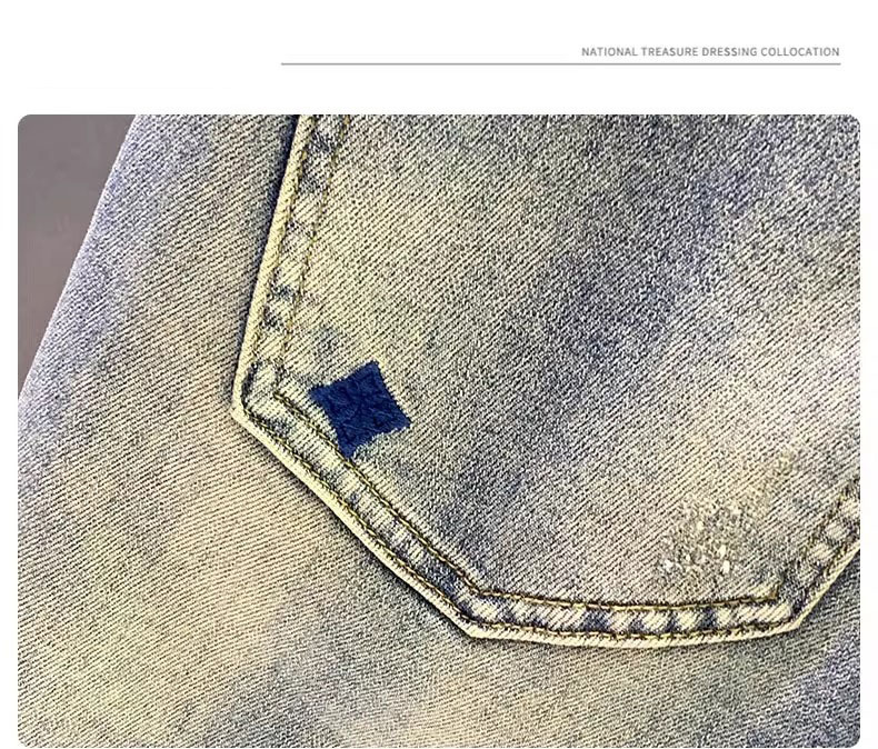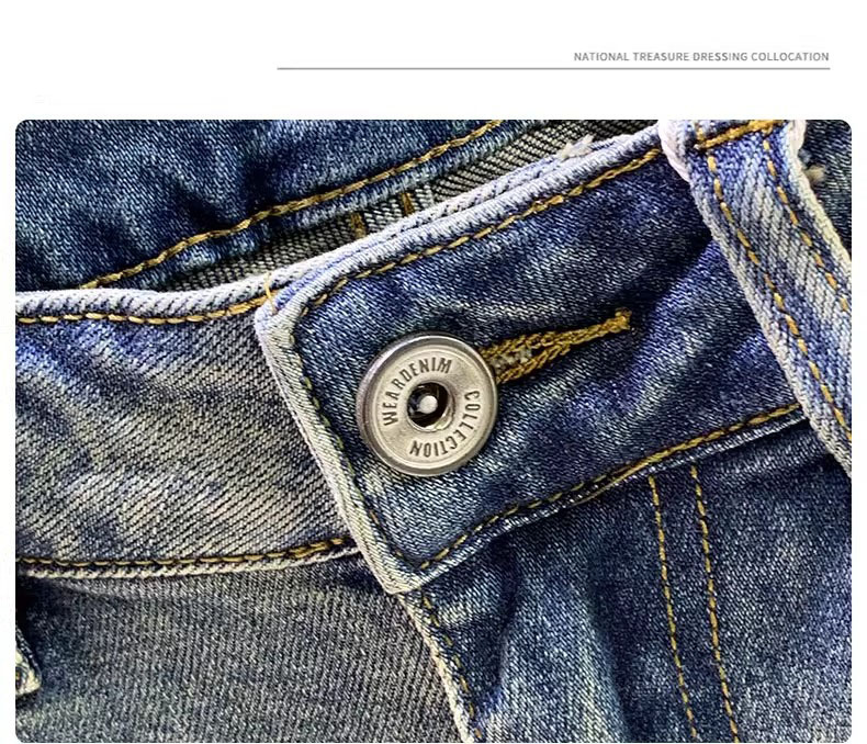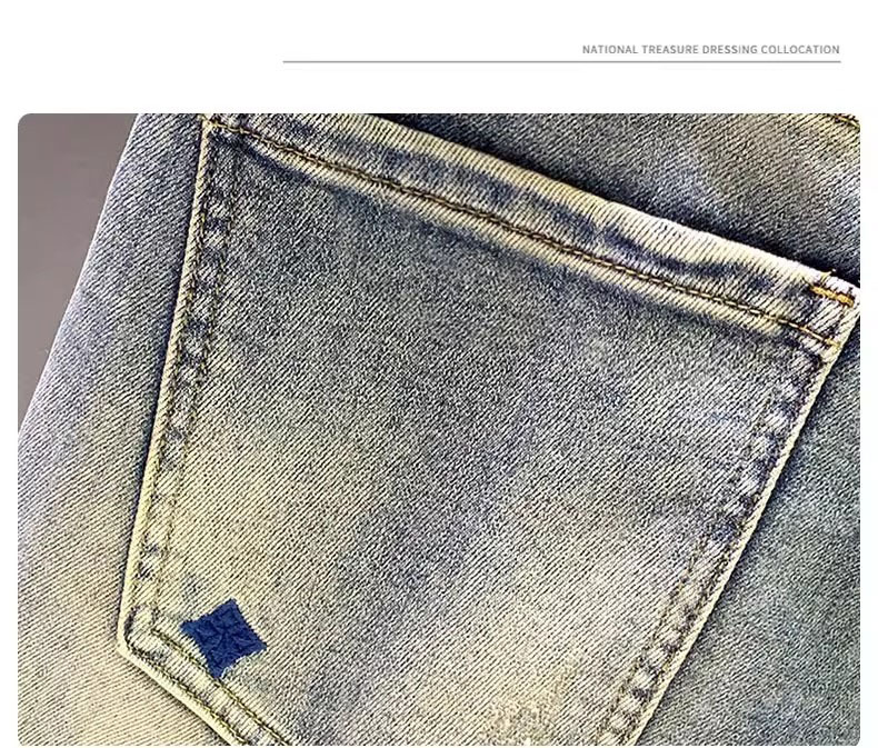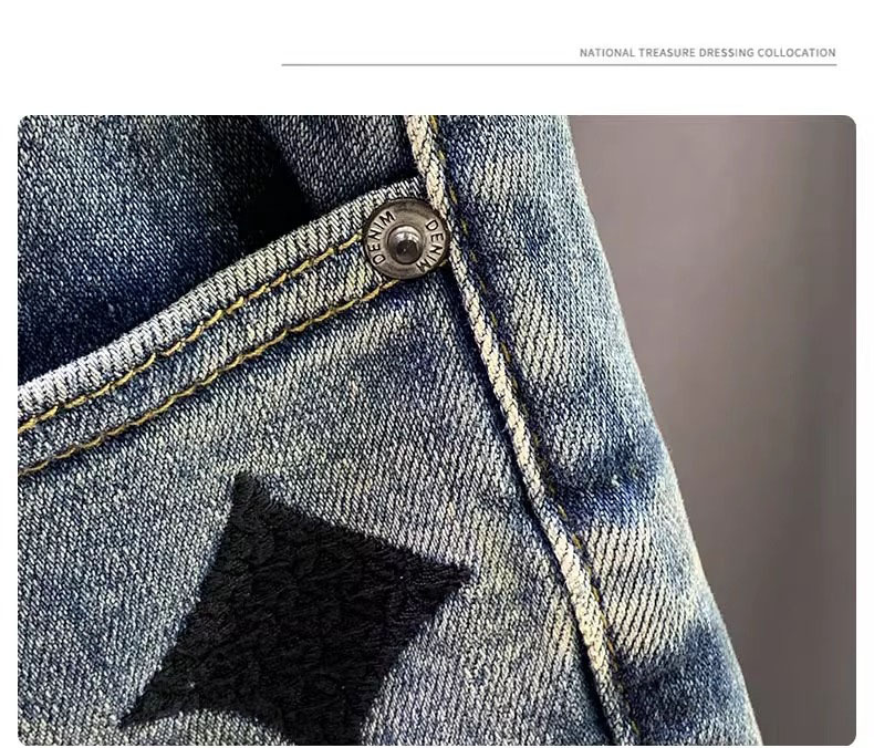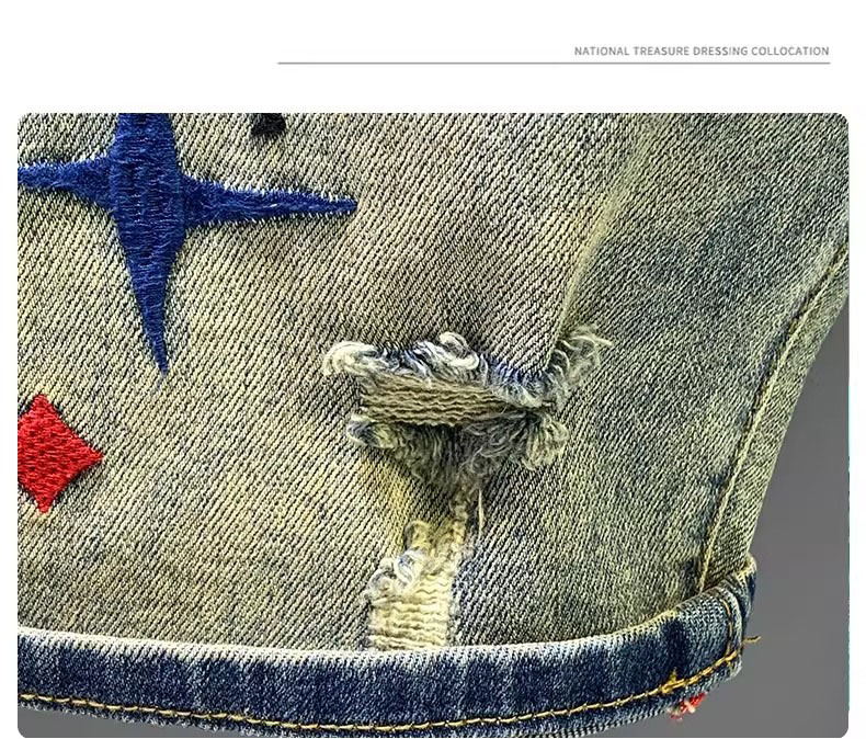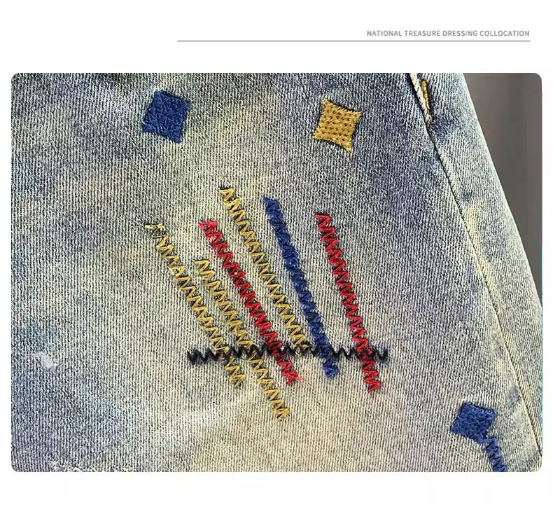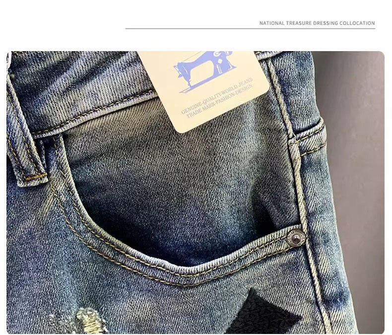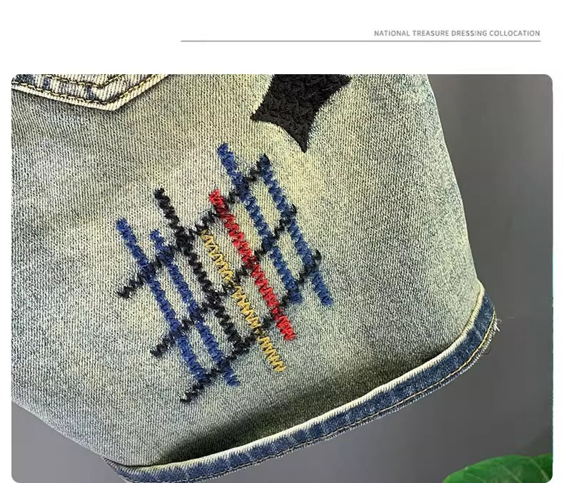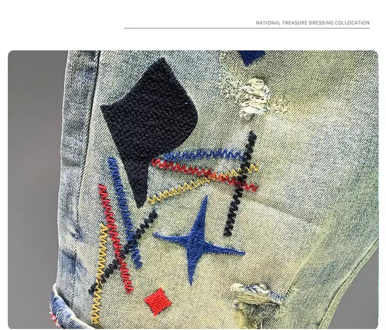 여름 패션 트렌드 자수 스크래치 및 찢어진 패치 데님 반바지 남성용 다용도 맞춤형 5부 스트레이트 팬츠 트렌디스토어 가기