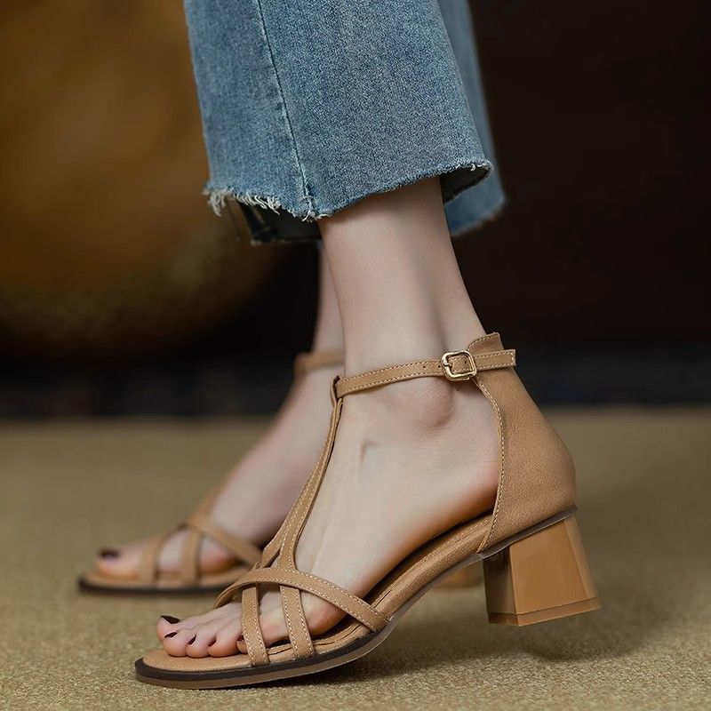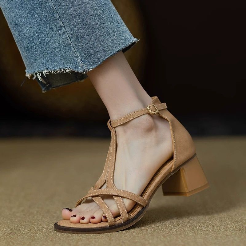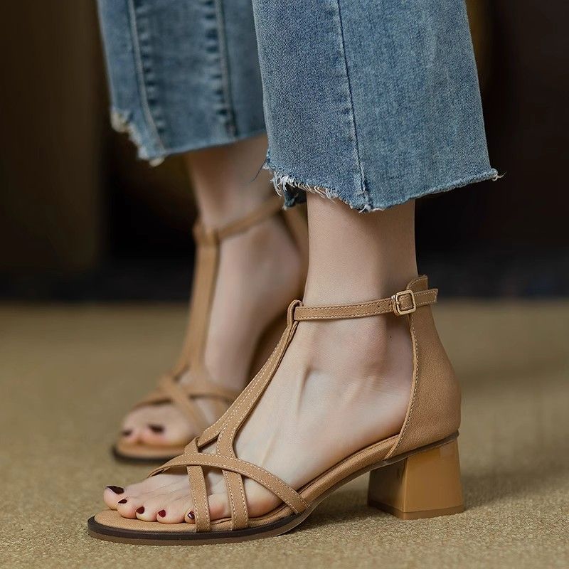 크로스 오픈 토 샌들 새로운 스타일 2025 여름 영국 미드 힐 두꺼운 힐 T-스트랩 로마 여성 신발 하이 엔드 라이트 럭셔리 신발스토어 가기