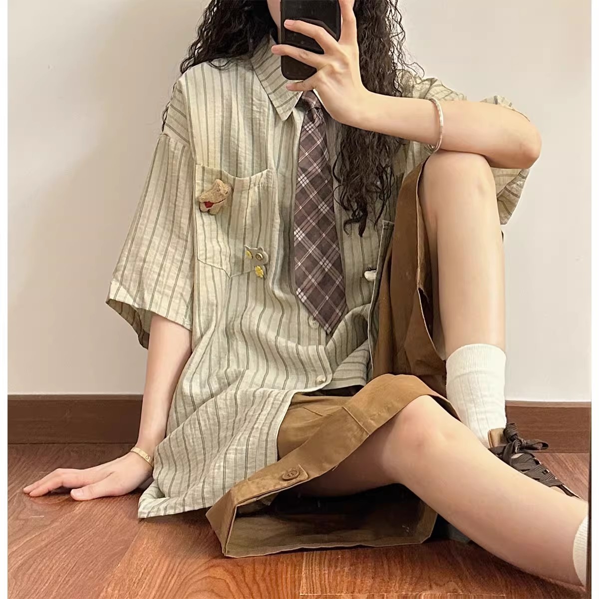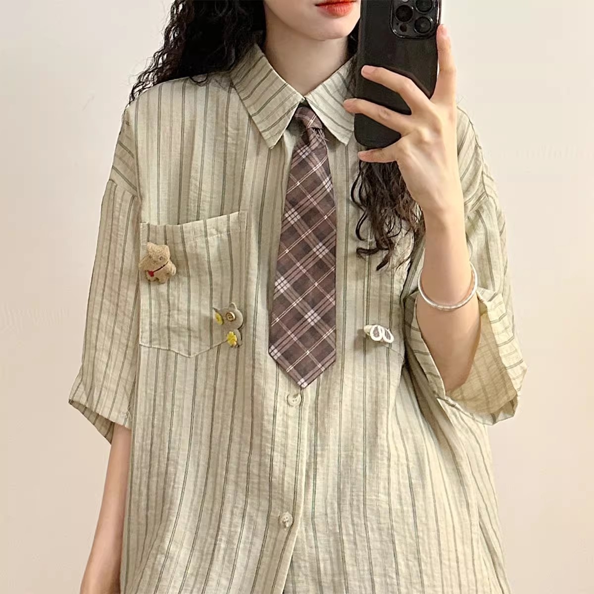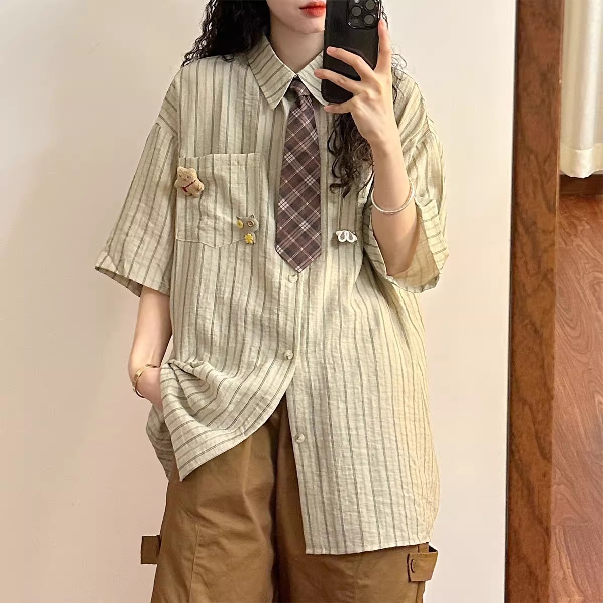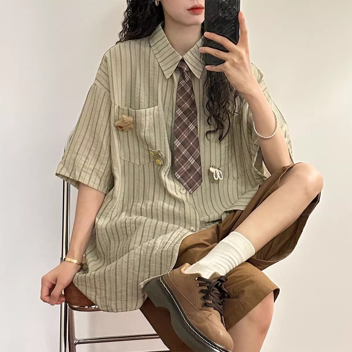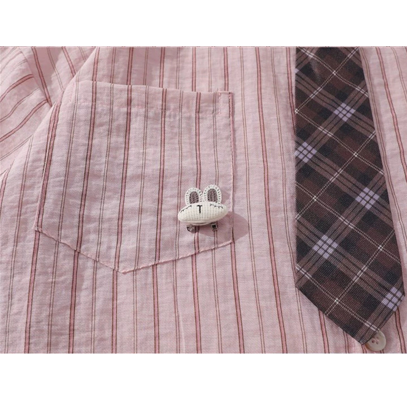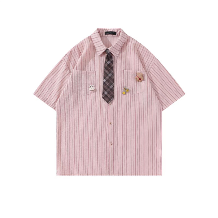 일본 복고풍 대학 스타일 디자인 스트라이프 넥타이 반팔 셔츠 여성 2025 여름 새로운 루즈 탑 트렌드스토어 가기