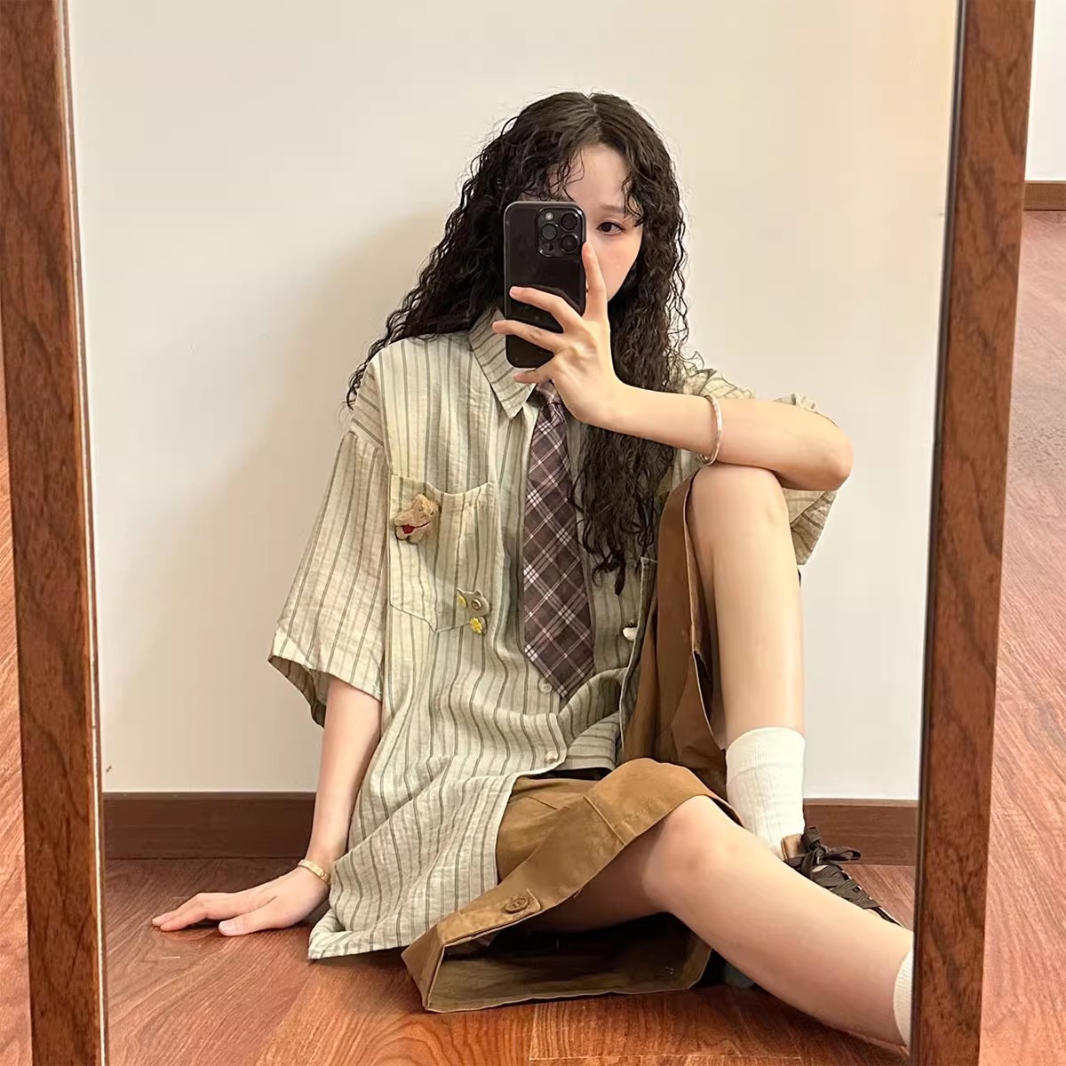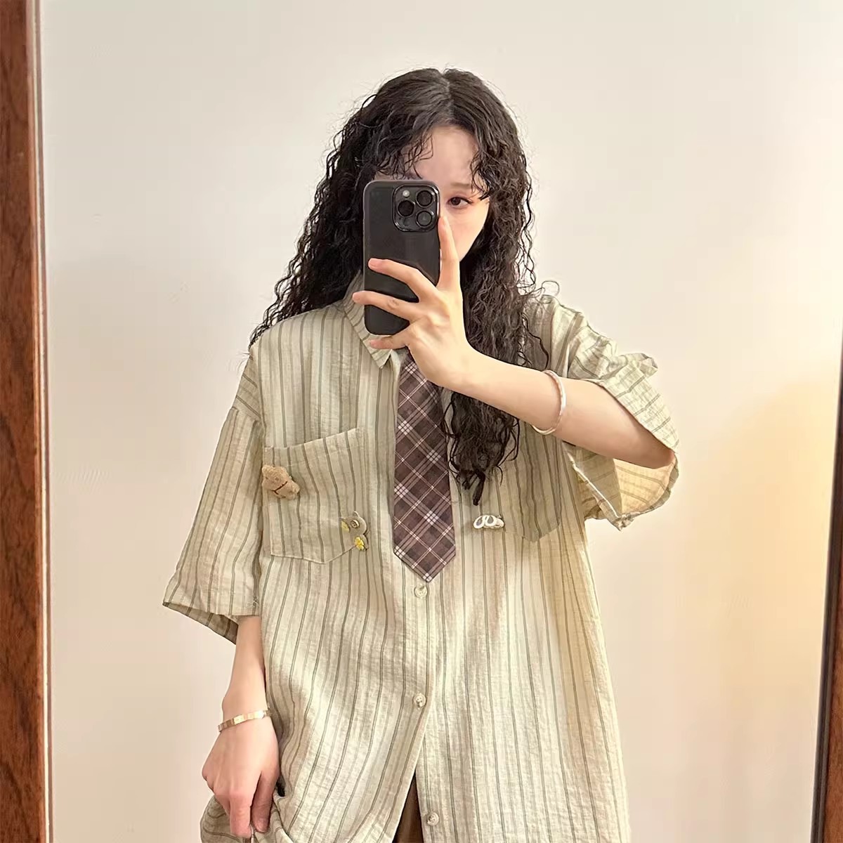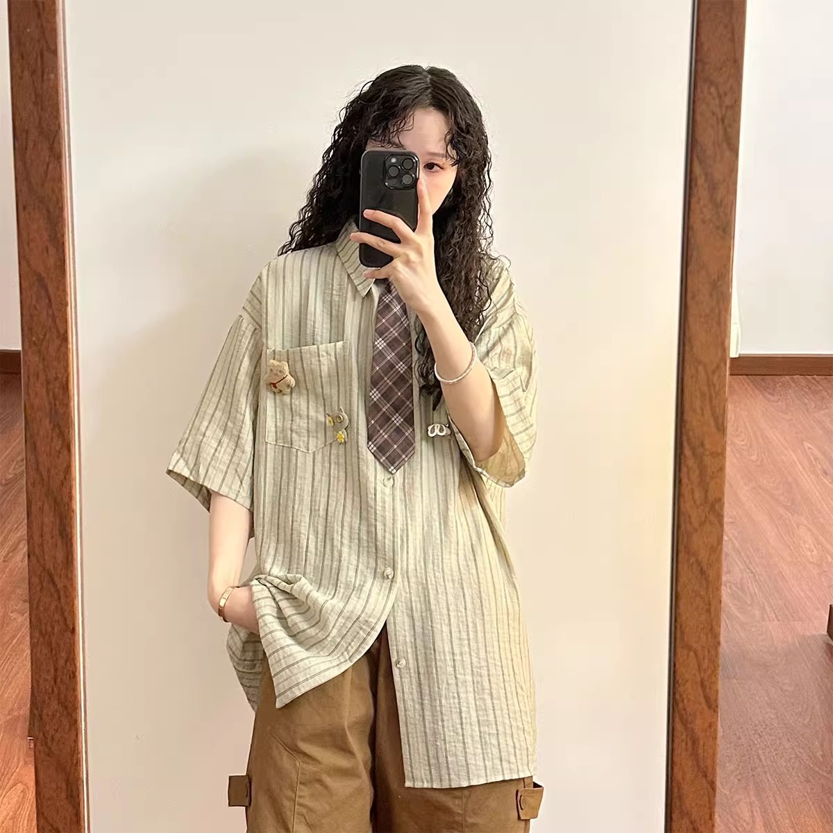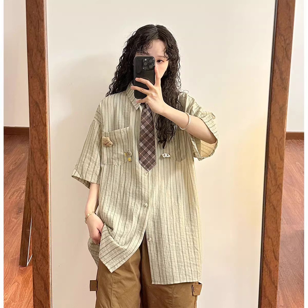 일본 복고풍 대학 스타일 디자인 스트라이프 넥타이 반팔 셔츠 여성 2025 여름 새로운 루즈 탑 트렌드스토어 가기
