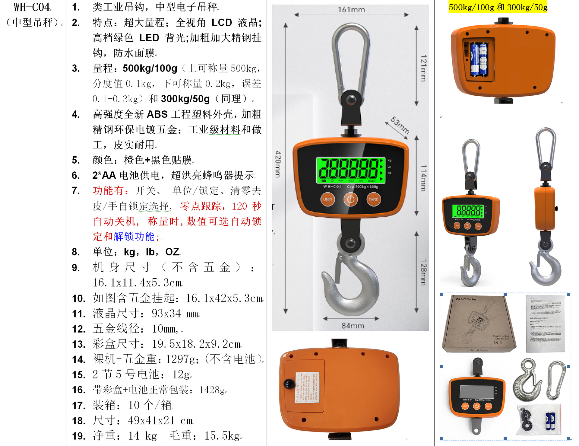 전자 천장 저울 500kg 새로운 ABS 쉘 300kg 후크 스케일 150kg 전자 저울 그램 스케일