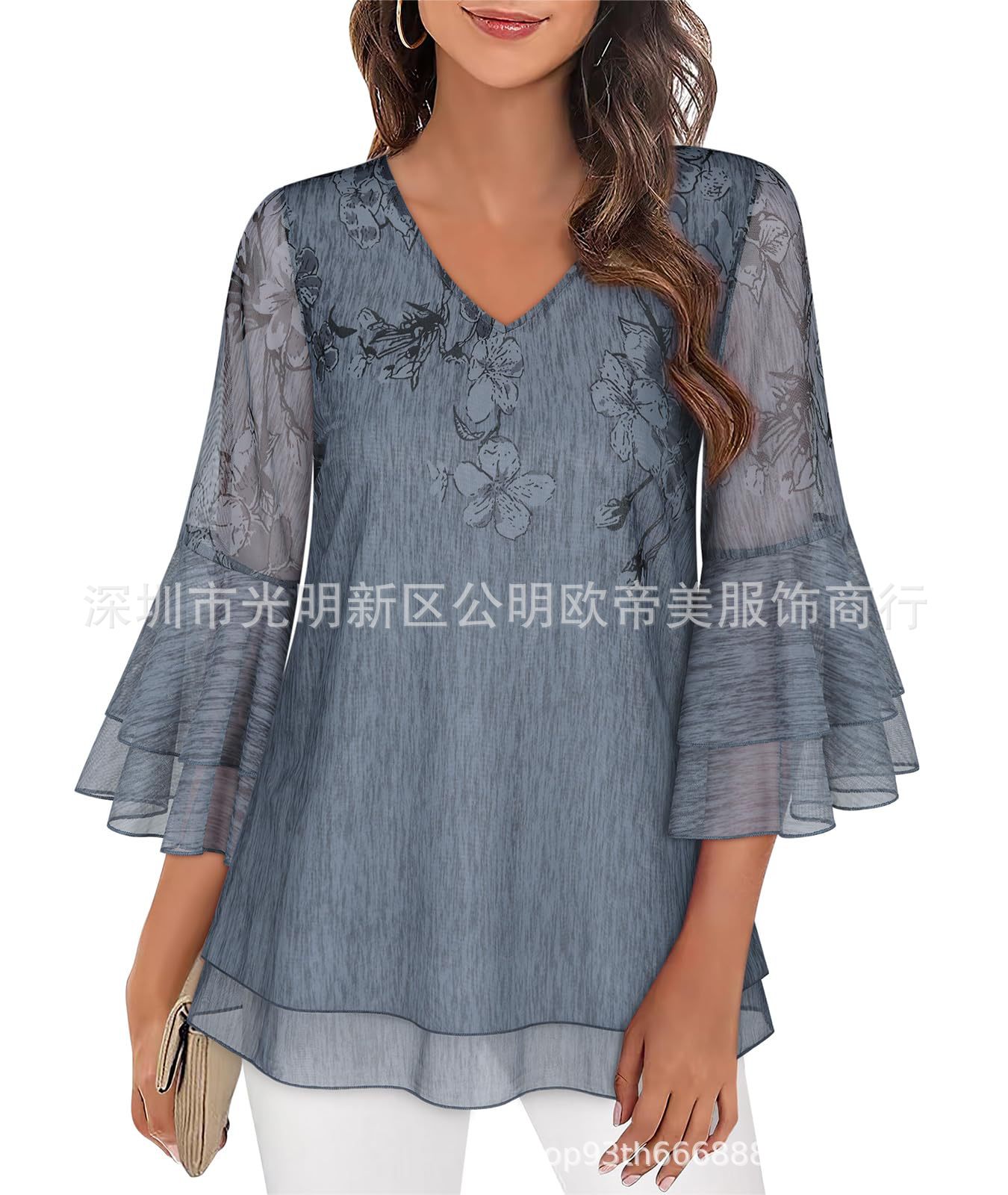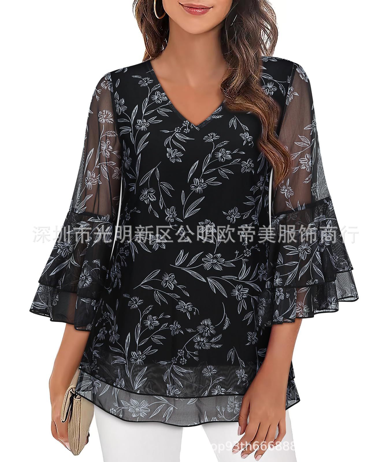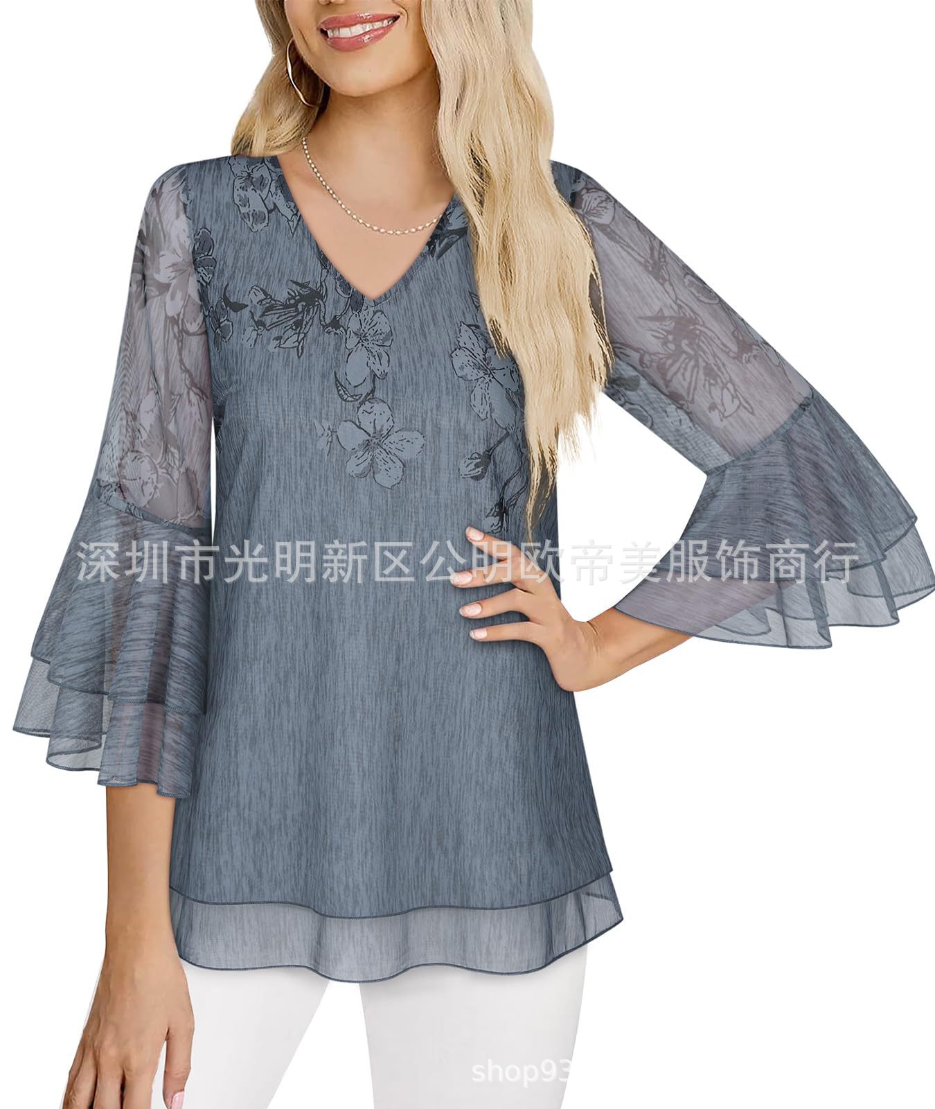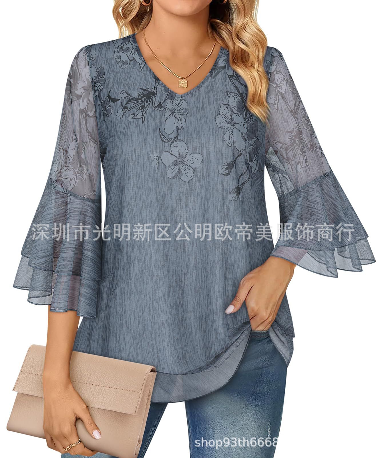 2025 크로스보더 여성 셔츠 3/4 슬리브 탑 우아한 캐주얼 더블 레이어 V 넥 메쉬 쉬폰 튜닉 셔츠