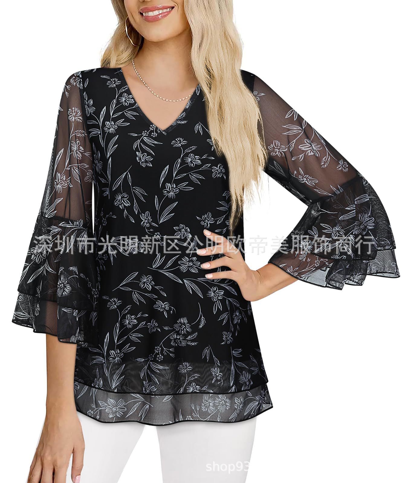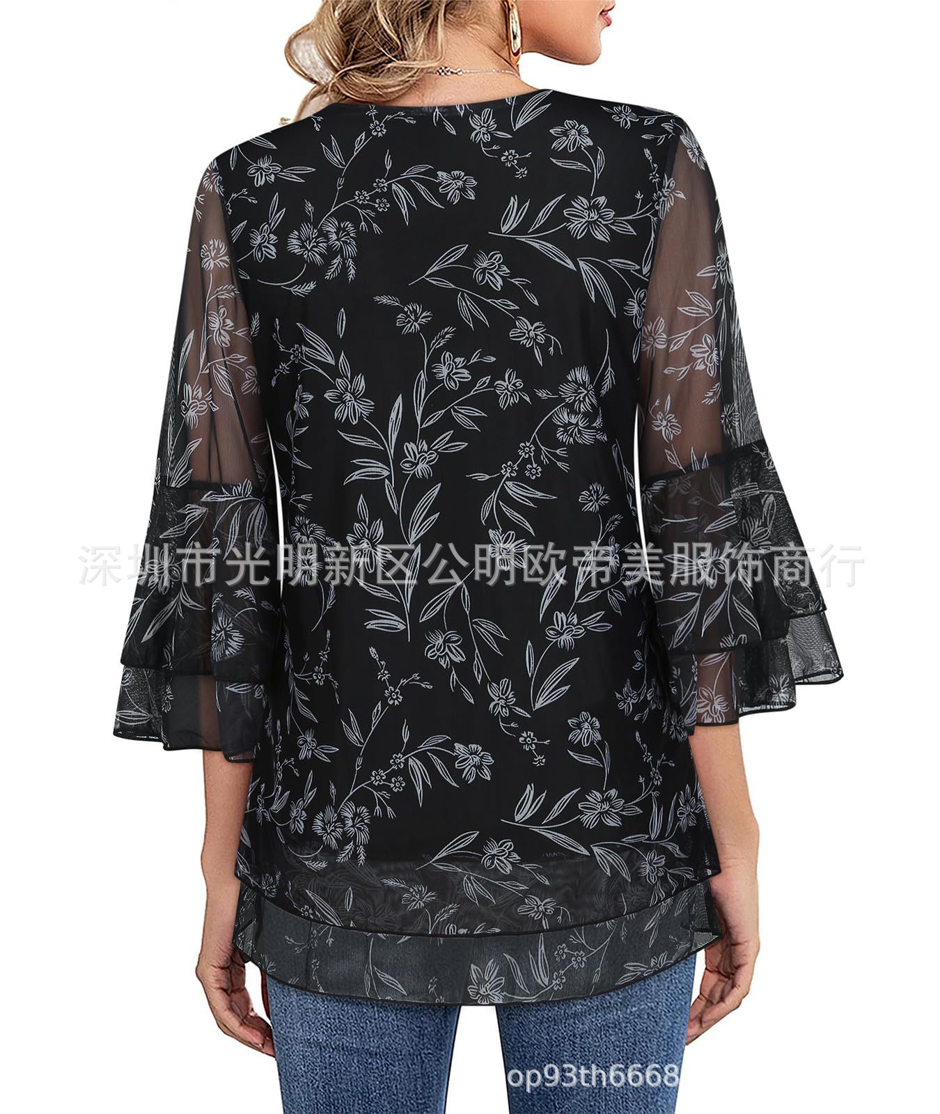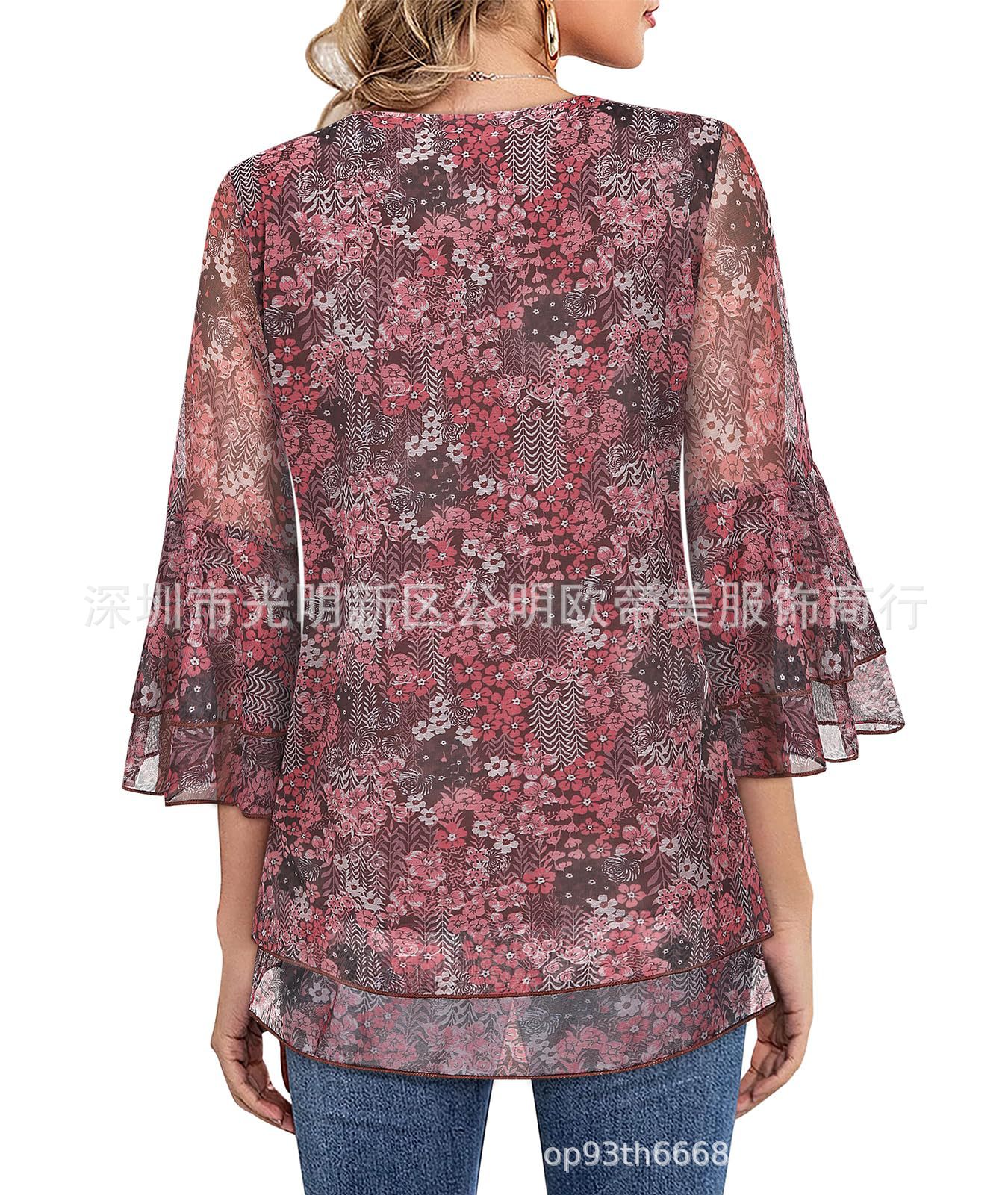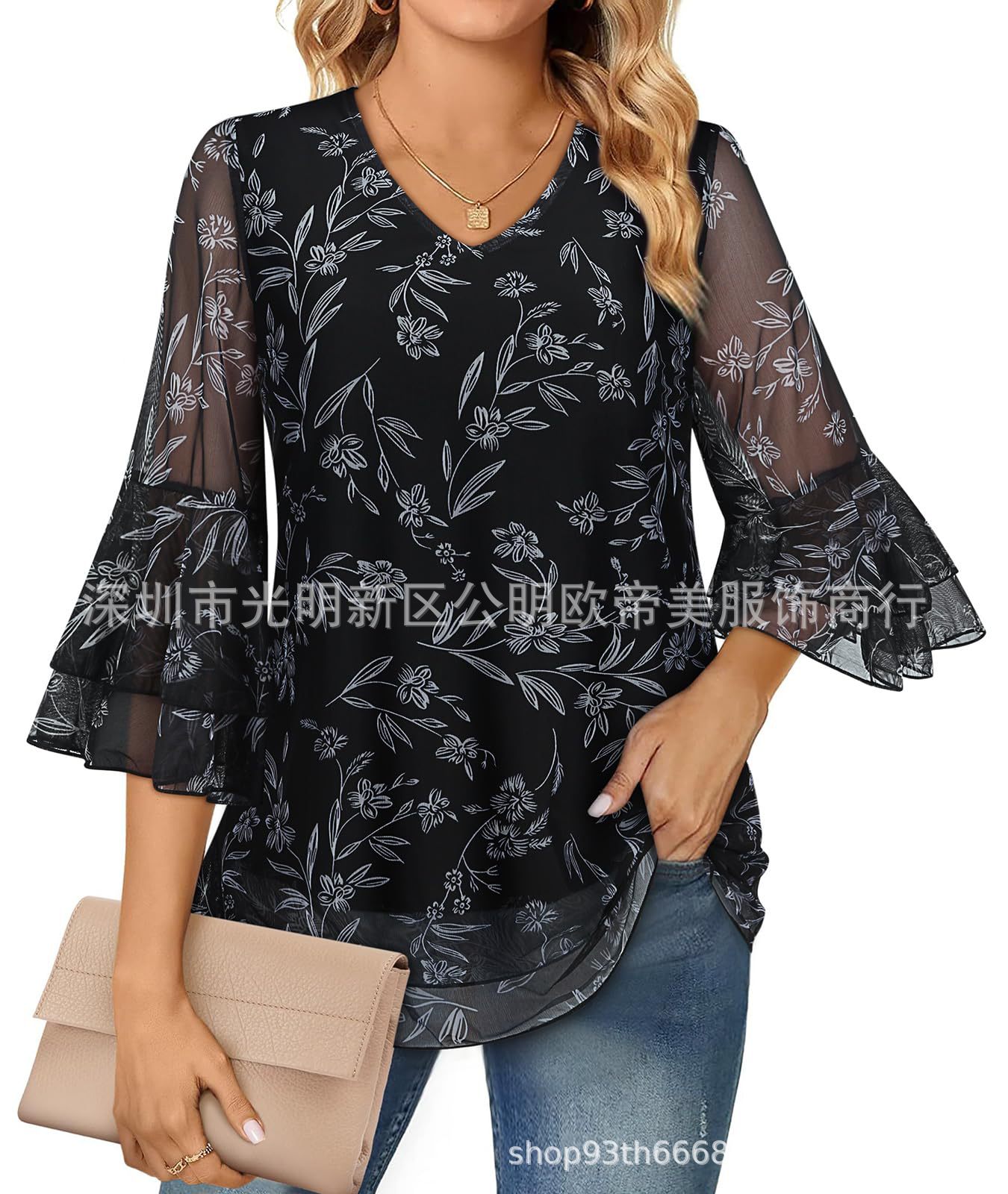 2025 크로스보더 여성 셔츠 3/4 슬리브 탑 우아한 캐주얼 더블 레이어 V 넥 메쉬 쉬폰 튜닉 셔츠